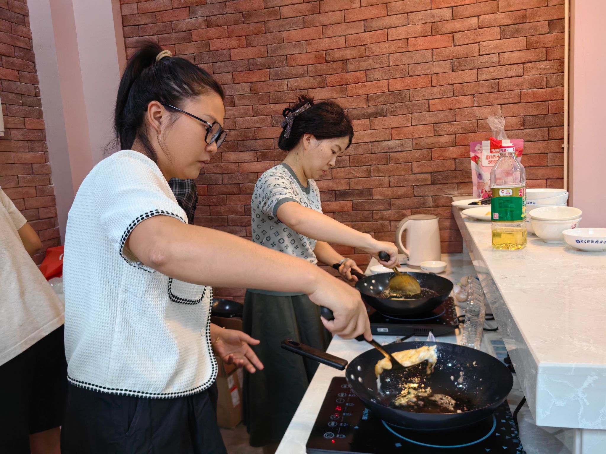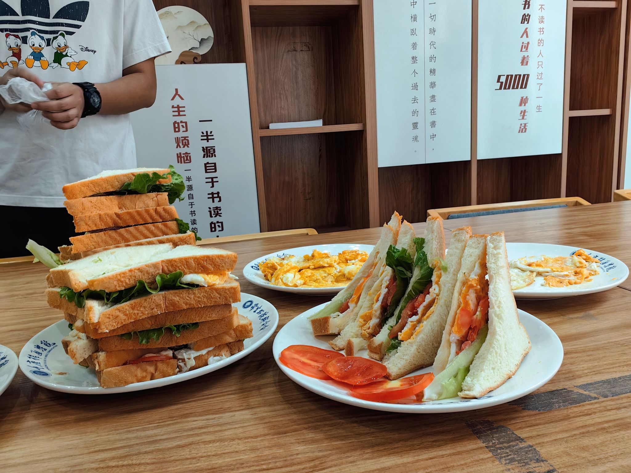 活动伊始,黄延果和龙涛两位老师主动承担了煎鸡蛋的任务,黄丽萍老师则负责生菜的清洗工作,同学们也各司其职,有的负责组装三明治,有的忙着摆放餐具。伴随着欢声笑语,师生们相互配合,整个画面其乐融融。桌上逐渐摆满的美味早餐不仅包含了师生们的辛劳与努力,更凝聚了大家的合作精神,每个人的脸上都洋溢着满足的笑容,期待着一起享用这顿自己亲手制作的美味早餐。