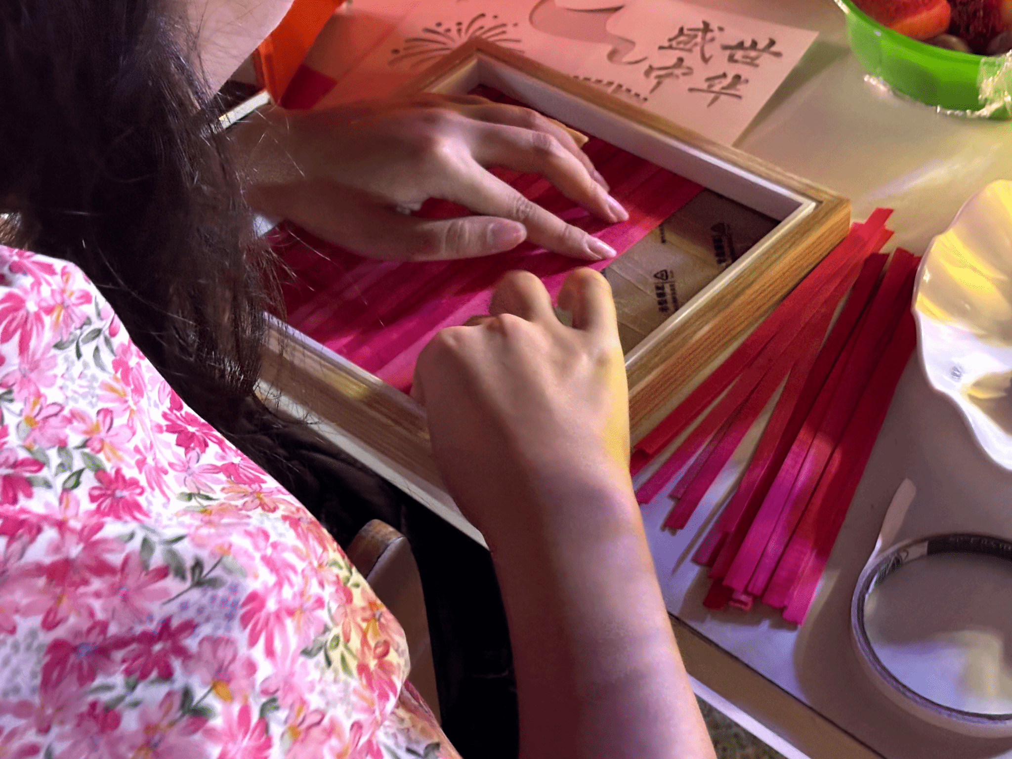 随后,活动精彩升级至创意DIY环节,寿星们在欢声笑语中亲手编织竹编画,将这份独特的艺术品作为自己与新中国75周年华诞的双重献礼。每一根竹丝,都蕴含着对祖国的深情厚谊与美好祝愿,让非物质文化遗产的魅力在指尖绽放。更寓意着他们未来如竹般坚韧,生活如画般多彩,共同书写属于这个时代的华章。随着DIY作品的逐渐成形,《是妈妈是女儿》的温馨旋律悠然响起,远景书院的傅玉琴与潘秋洁两位同学自观众席中惊喜演唱,以歌声传递深情,触人心弦。
