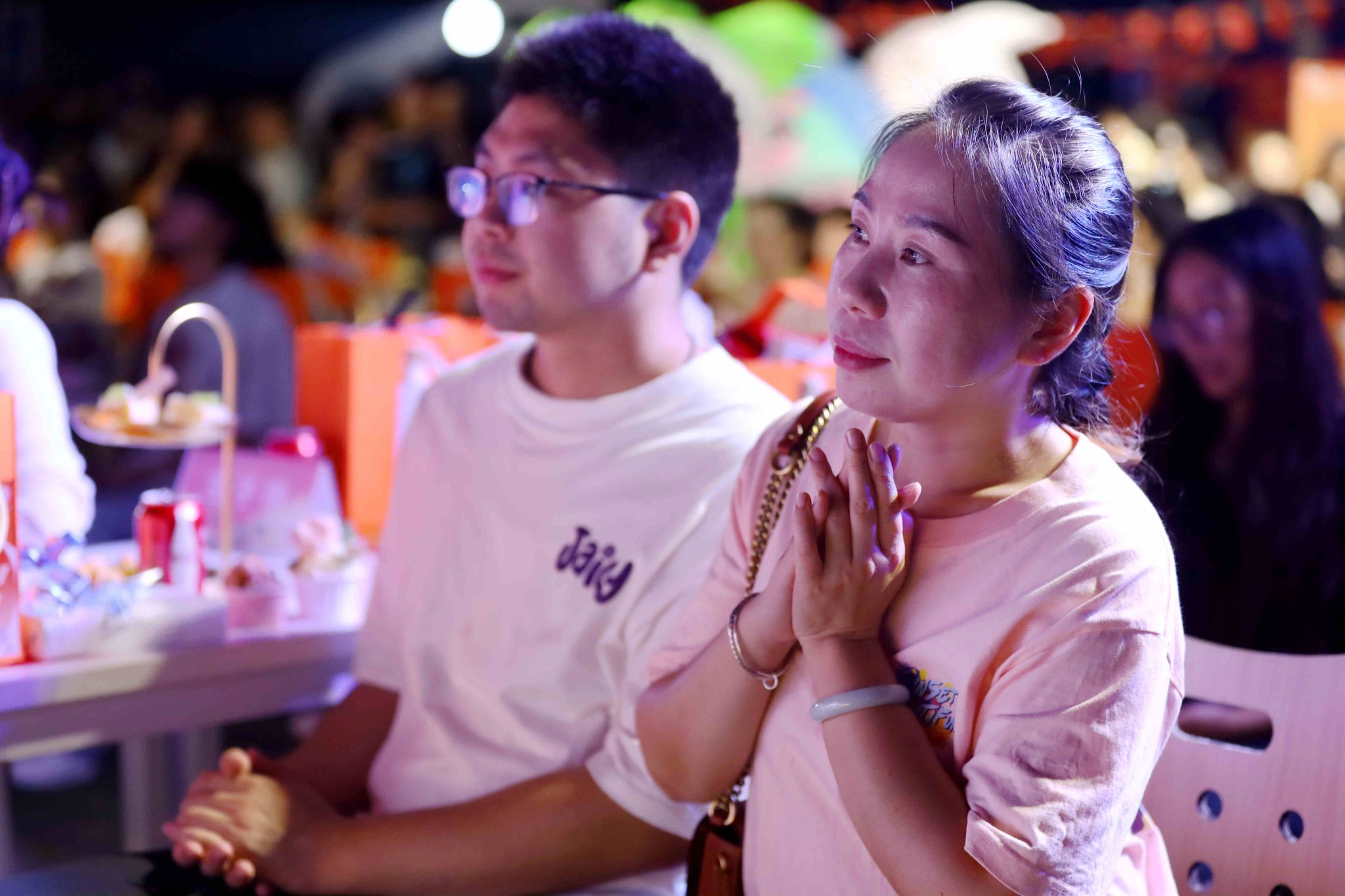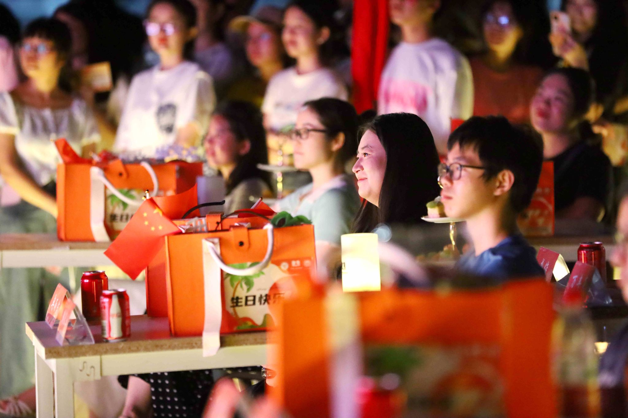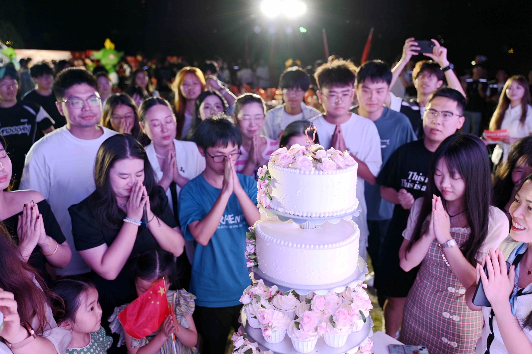 在主持人的引领下,寿星们齐聚舞台,10月1日生日的张国庆同学作为寿星代表,携手本次生日会寿星们的家长代表,共同为寿星们开启香槟庆祝,同时也借此机会,与现场超过4000名师生一同向祖国母亲表达生日的祝福。当蜡烛被点燃,全场师生齐唱生日祝福歌,寿星们一同吹灭蜡烛,许下心愿。这一刻,温馨与幸福弥漫在整个草坪,成为所有人心中难忘的画面。