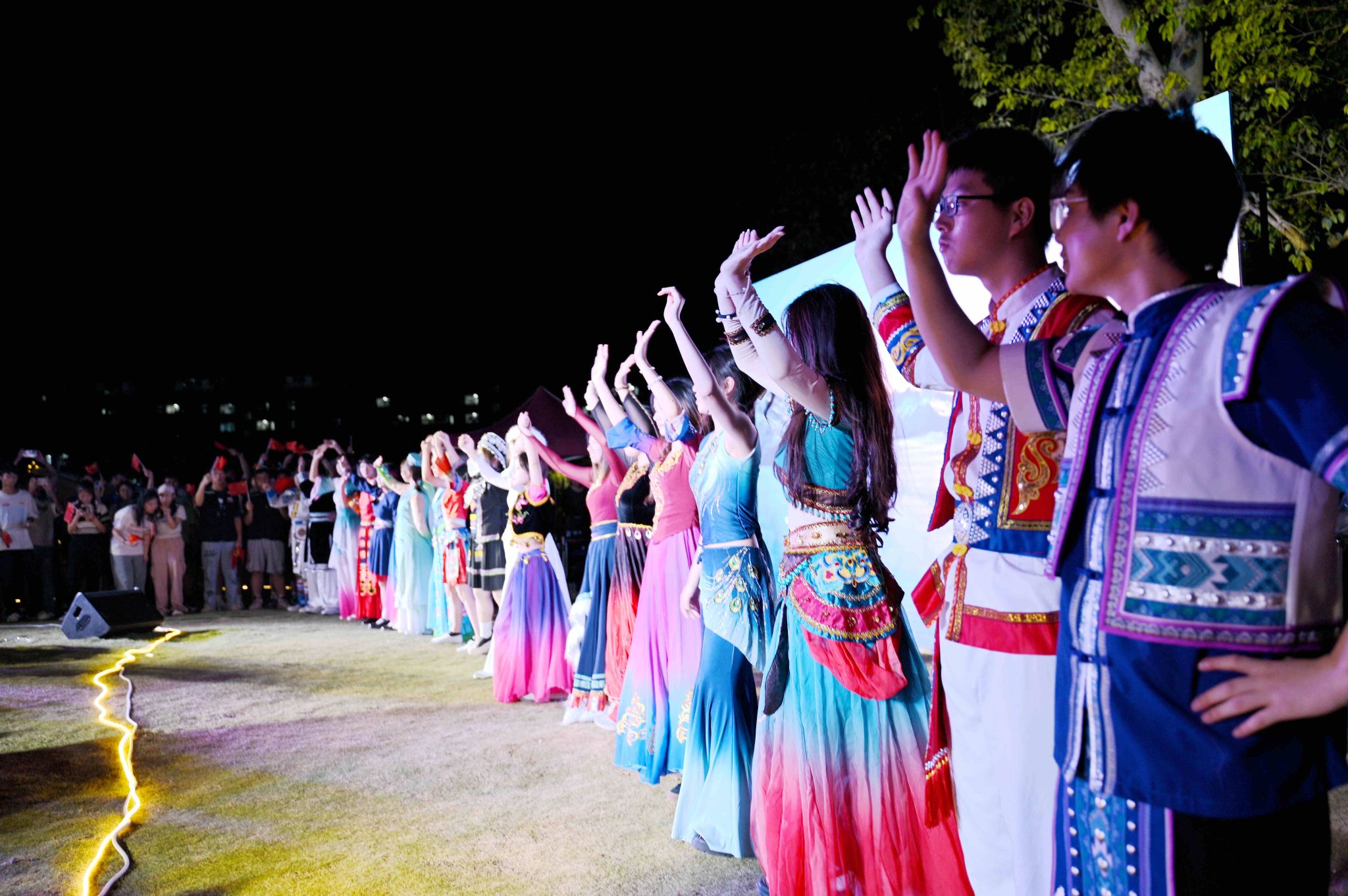 与此同时,来自五湖四海、不同民族的同学们身着各自传统的民族服饰同歌共舞,大屏幕歌曲从《相亲相爱》到《谁不说俺家乡好》生动展现了祖国各省市的独特风情,构成了一幅民族和谐、星星相映、民族共融的绚丽画卷。