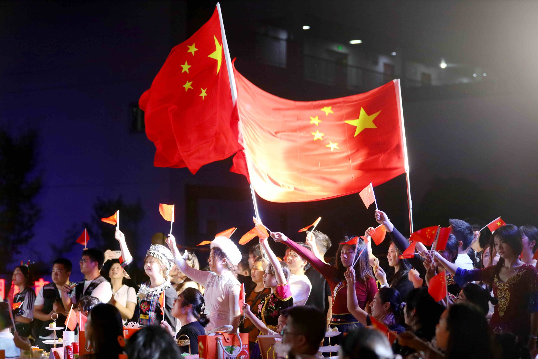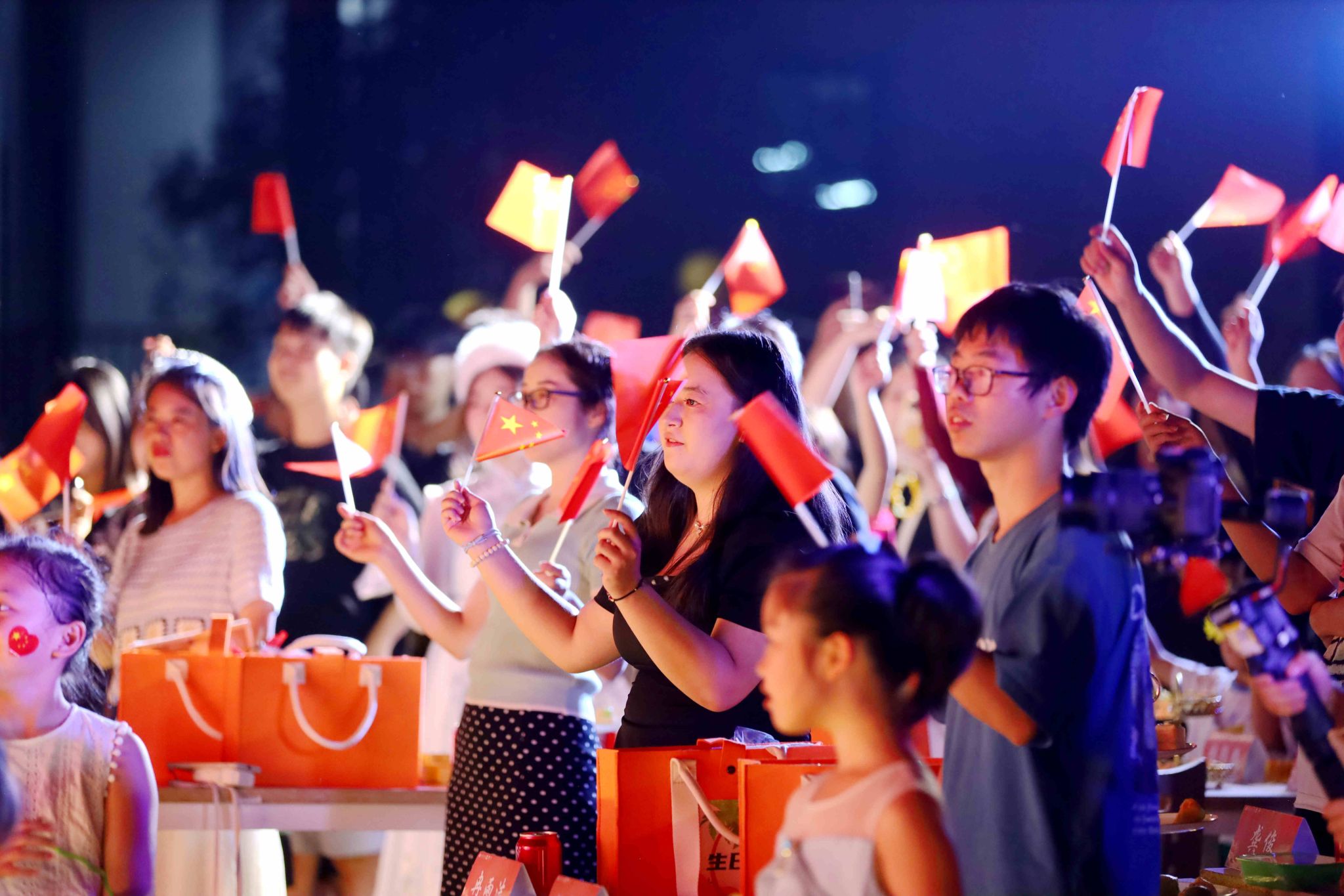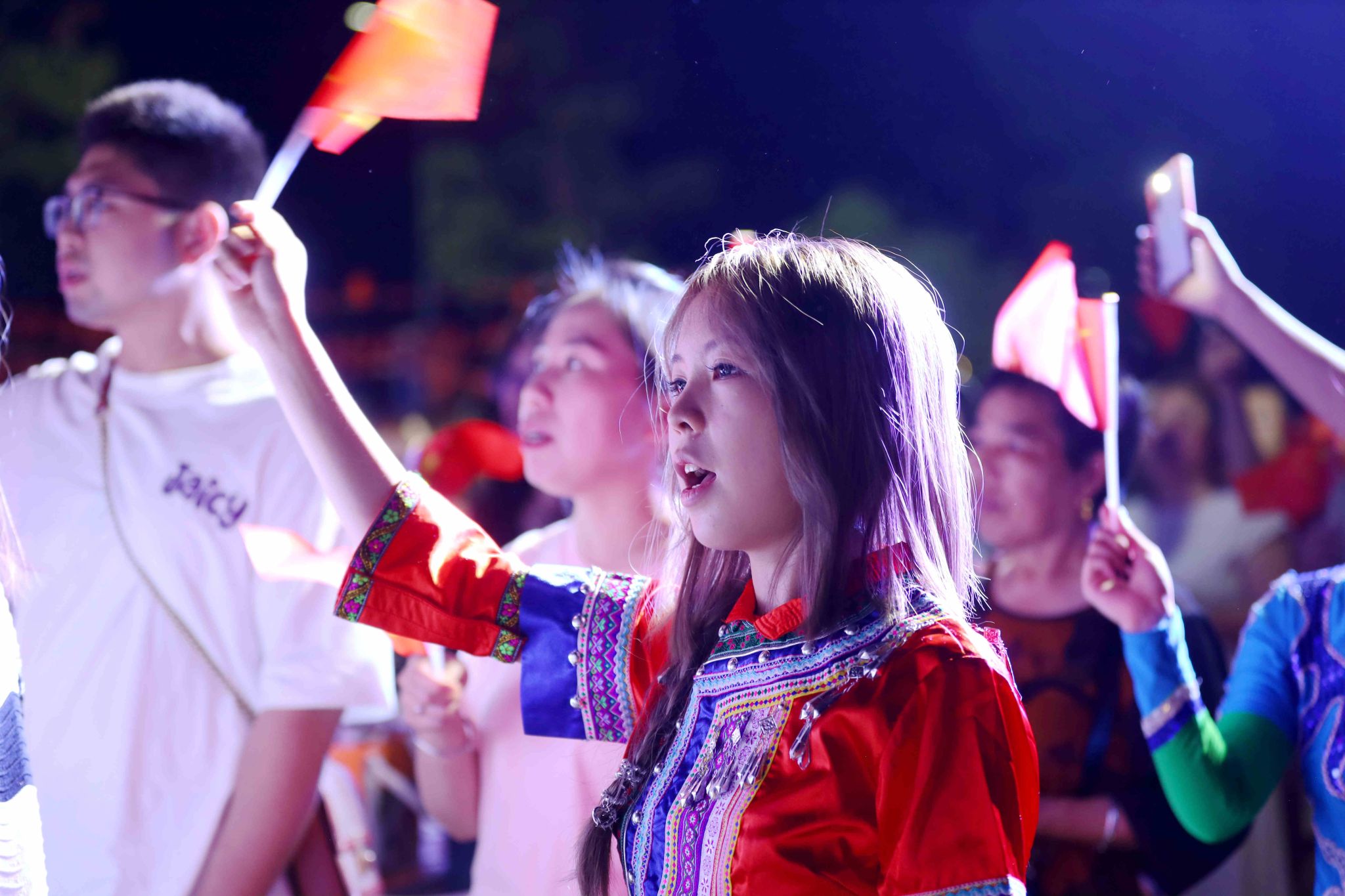 现场气氛的不断高涨,一面面鲜红的国旗在师生手中高高飘扬。在国旗的映衬下,4000余名师生齐声高唱《我和我的祖国》《歌唱祖国》,歌声激昂、情感真挚。