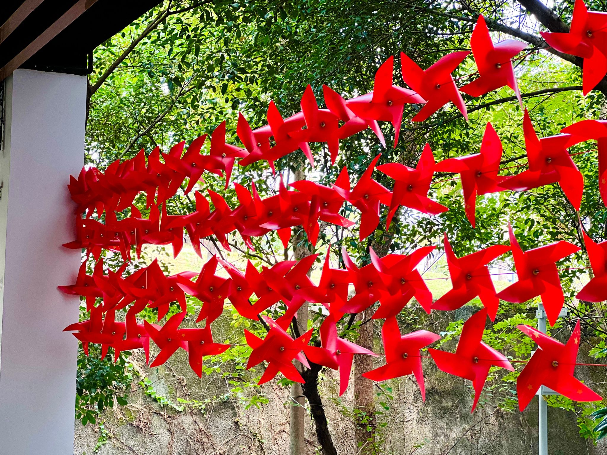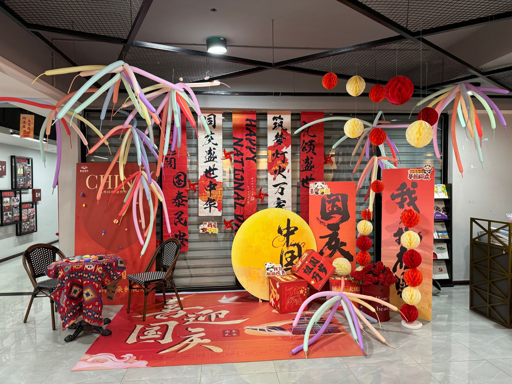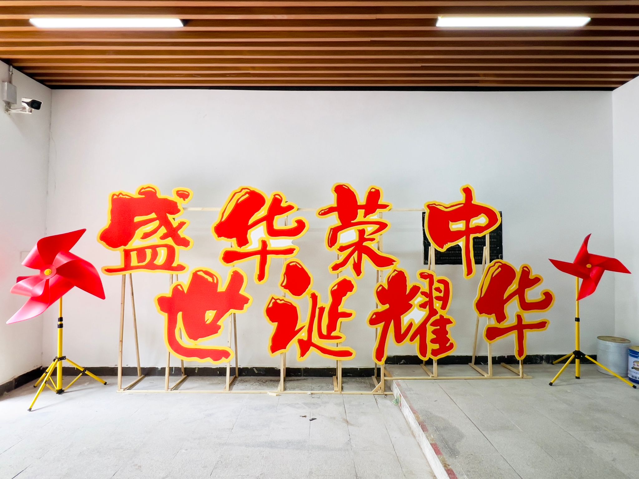为庆祝中华人民共和国成立75周年,深入学习贯彻党的二十大及二十届三中全会精神,传承红色基因,北山书院以“盛世华诞,荣耀中华”为主题进行书院空间氛围营造。书院入口处,悬挂了庆祝新中国75周年华诞的海报,书院内部也随处可见红色的风车迎风旋转,“盛世华诞,荣耀中华”八个大字也让书院的走廊盈满了“中国红”。