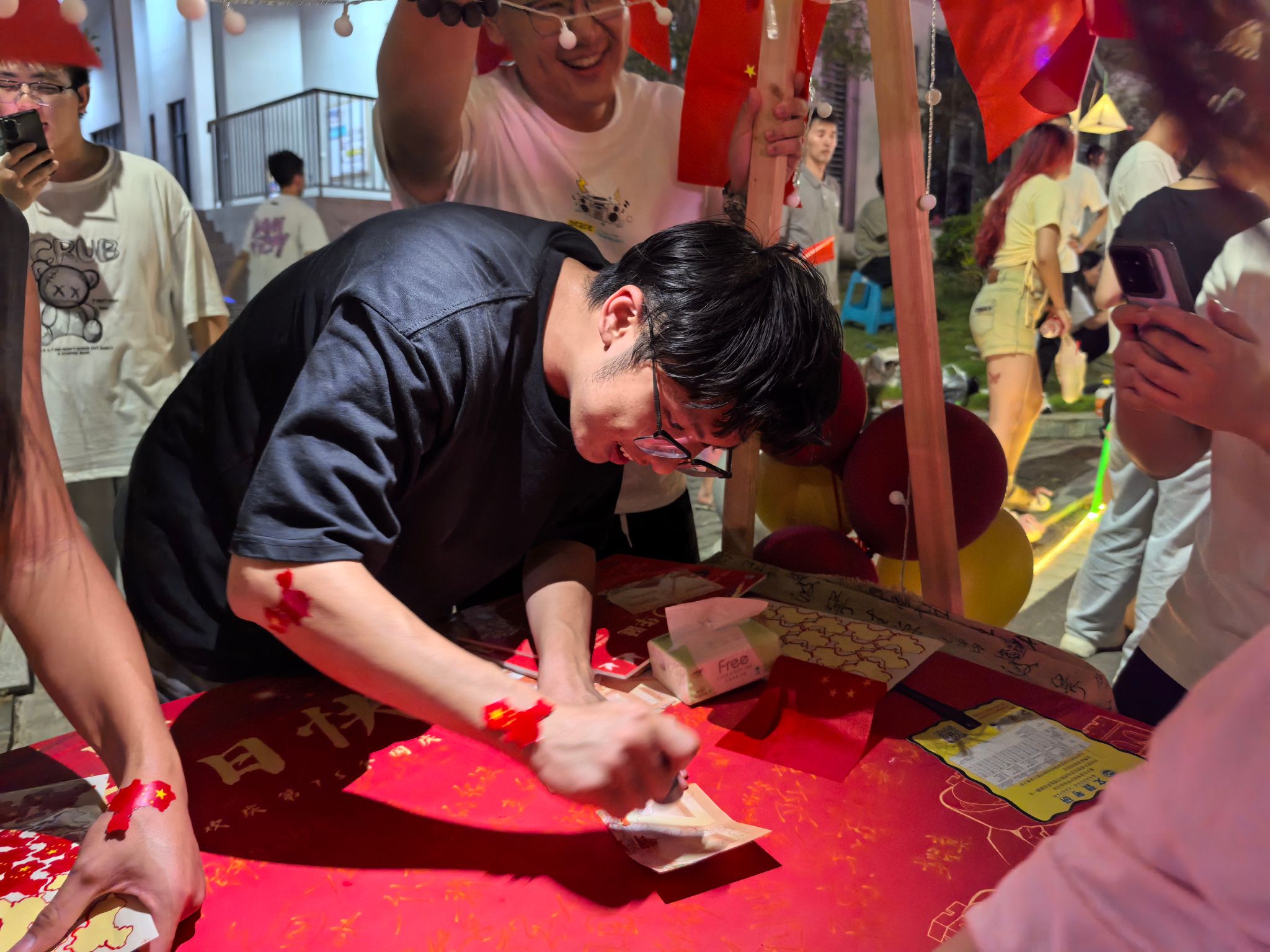 在热烈庆祝中华人民共和国成立75周年之际,南湖书院通过集体活动,增进师生之间的感情,为家国的繁荣昌盛而奋力拼搏,营造和谐、团结的校园氛围,为师生们提供一个放松、愉快的活动平台,丰富校园文化生活,并以“家国同兴”为主题开展了“沐光前行,家国同庆”2024年9月师生集体生日会子活动,引导师生关注国家发展,培养爱国精神和家国情怀,将个人成长与国家命运紧密联系起来。现场,师生们挥毫泼墨,亲手写下对祖国母亲的深情祝福,寄托强国之梦。一张张笑脸被国旗、地图等创意脸贴装点,爱国之情油然而生。在知识问答中,通过对中国历史与辉煌成就的问答,学子们在热烈而专注的氛围里,深化了对中国悠久历史与辉煌成就的理解与认识,构筑了一座承载着历史厚重与家国情怀的知识殿堂。此次活动不仅丰富了校园文化生活,更让师生们在共同庆祝祖国生日的同时,深切体会到书院小家与祖国大家相连的情愫,激发起师生携手并进、共筑祖国美好未来的坚定信念与豪迈情怀。