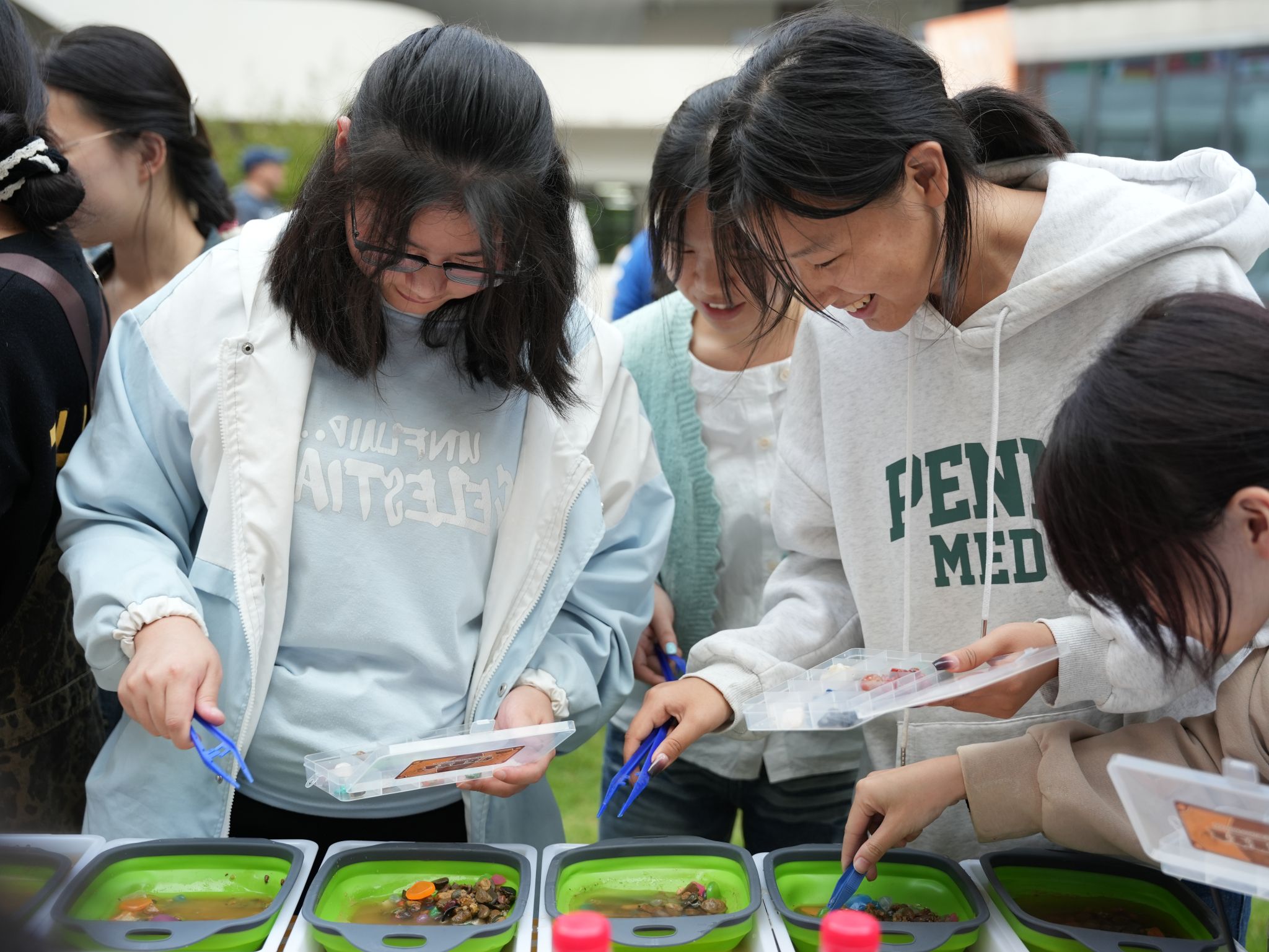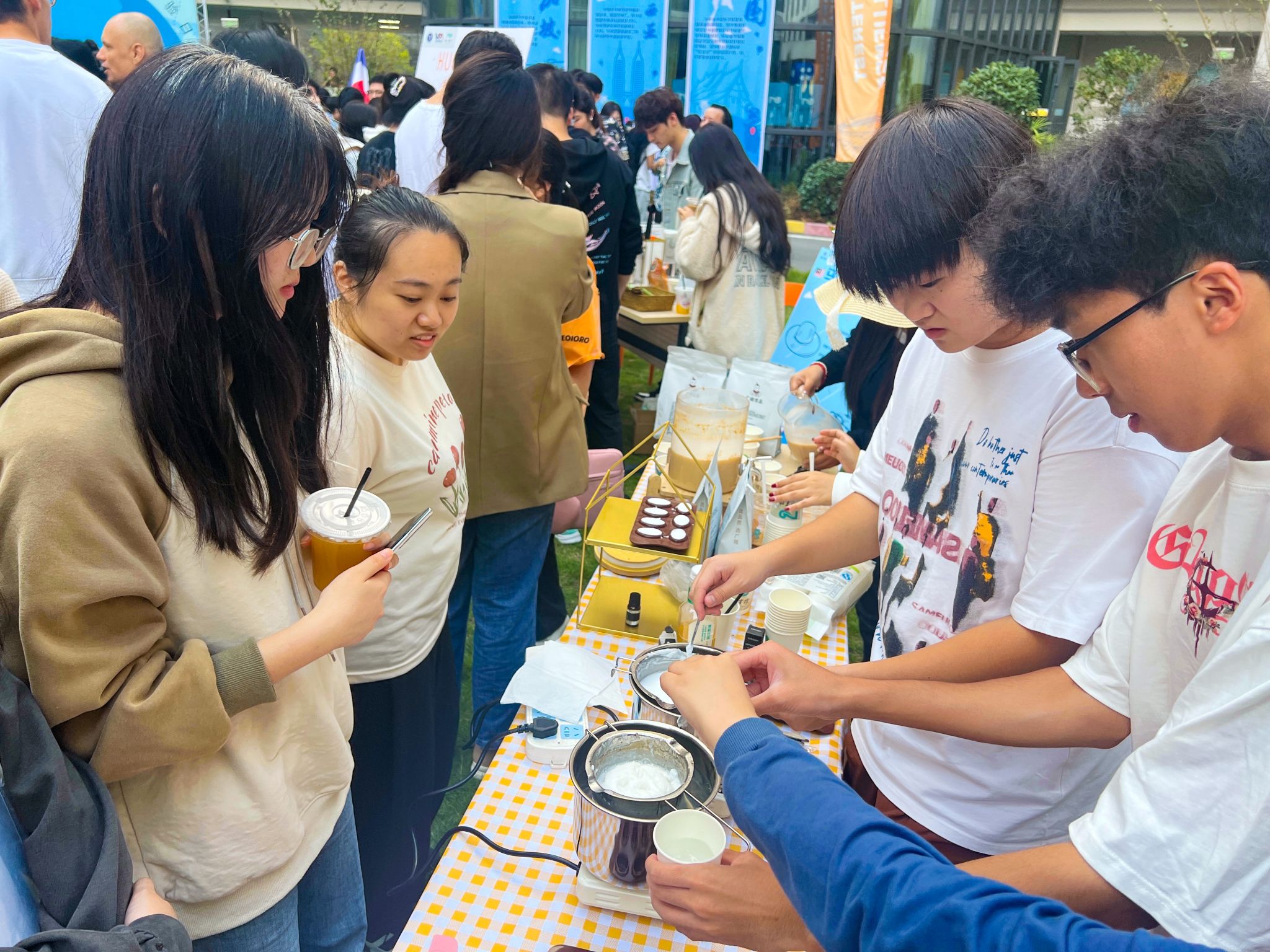 穿过泰国展区,来到柬埔寨展区,同学们在了解柬埔寨历史悠久的淘金文化后便开始亲手体验。印度尼西亚展区则以海洋手串和爆米花文化为亮点,展示了岛国独特的自然风貌与饮食文化。同学们在欣赏并制作海洋风格手串的过程中,仿佛能听到海浪拍打岸边的声音,或置身于热闹的印尼市集,感受着那份简单却纯粹的快乐。去年颇受欢迎的肉骨茶品尝也在新加坡展区应邀返场,再次让同学们加深了对新加坡文化的了解。