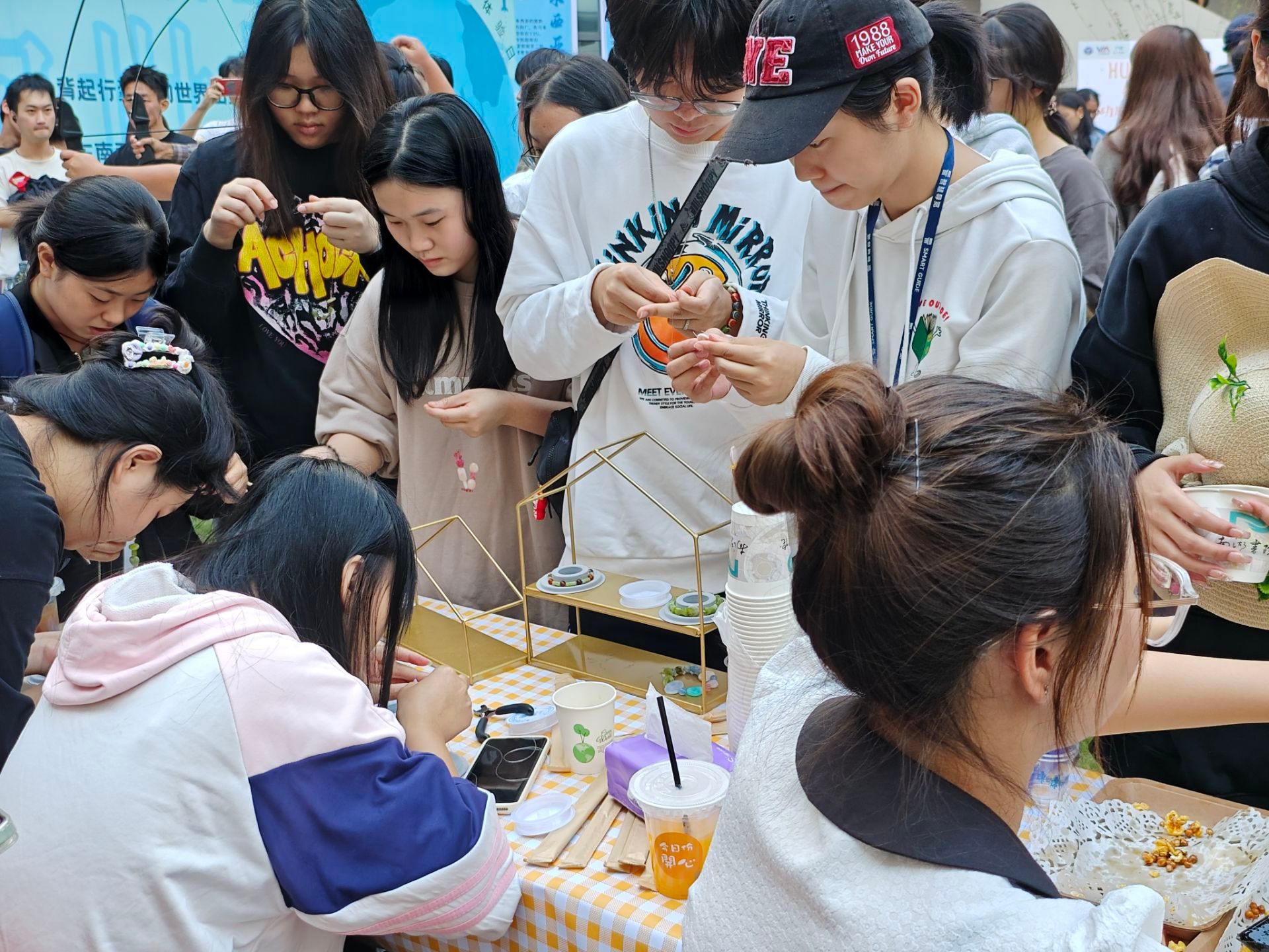 步入马来西亚文化区,一股浓郁的咖啡香扑鼻而来,工作人员现场演示如何编织精美的热带风情草帽,成为了吸引同学们驻足观看、亲手尝试的热门项目。在紧邻马来西亚文化区的泰国展区,同学们不仅可以学习如何制作既美观又实用的手工皂,还能品尝到地道的泰国奶茶,感受那份由口入心的甜蜜与清凉,仿佛瞬间穿越到了热闹的曼谷街头。