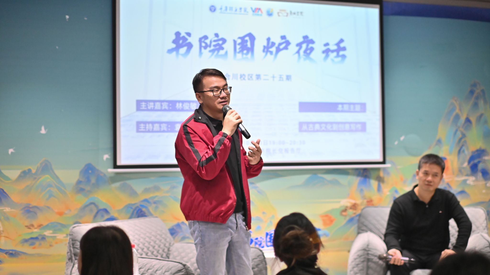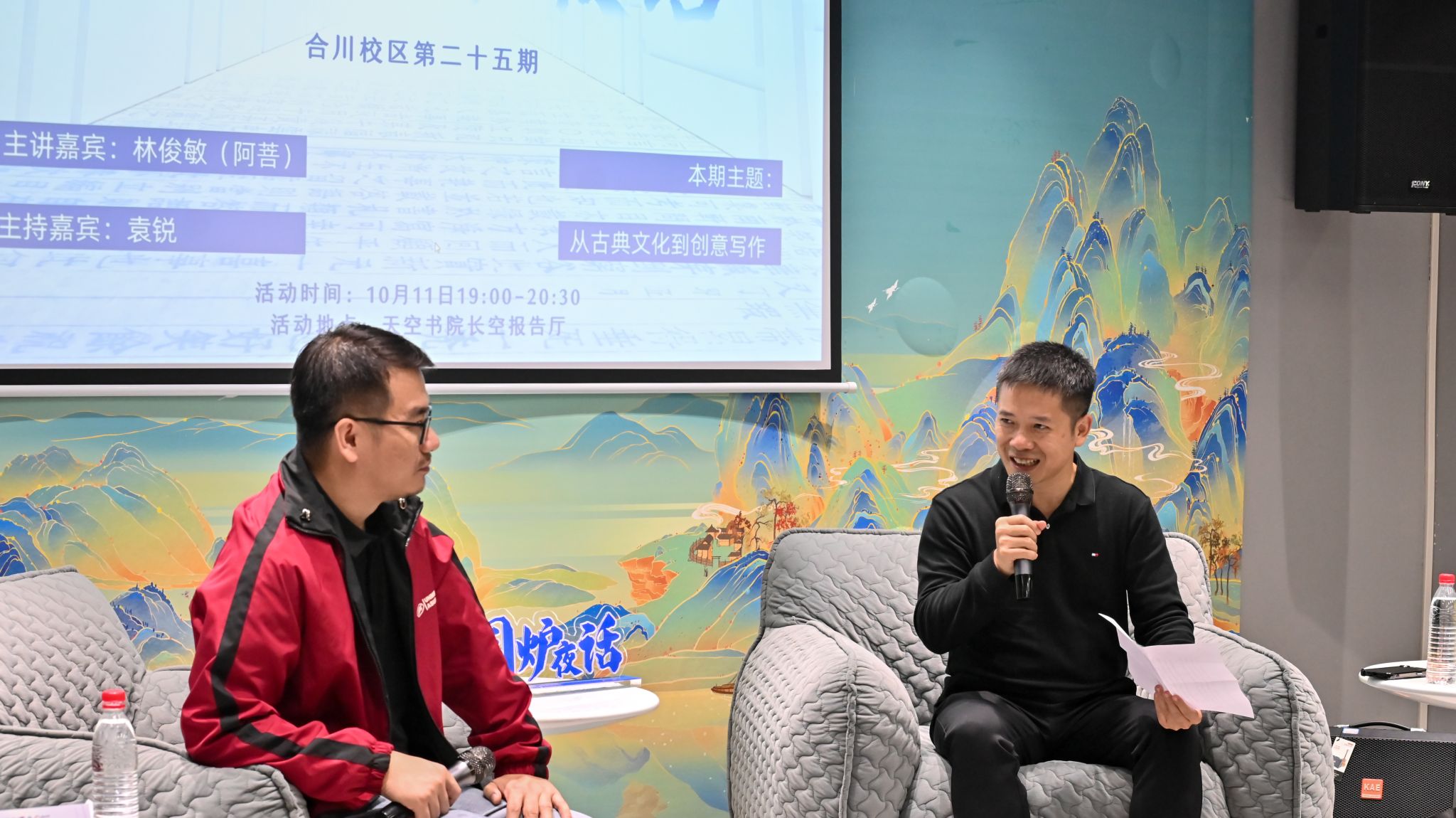 在浩瀚的历史长河中,古典文化犹如璀璨的明珠,历经岁月洗礼,依旧熠熠生辉。为进一步提高移通学子文学创作能力,书院围炉夜话合川校区第二十五期于10月11日在天空书院长空报告厅顺利开展。本期活动邀请文艺学博士、国家一级作家、汕头大学教授林俊敏(笔名阿菩)作为主讲嘉宾,与创意写作学院袁锐老师探讨“从古典文化到创意写作”的文学历程,共同挖掘古典文化、聚焦创意来源、探讨创意规范,感受文学记录的时代脉络。