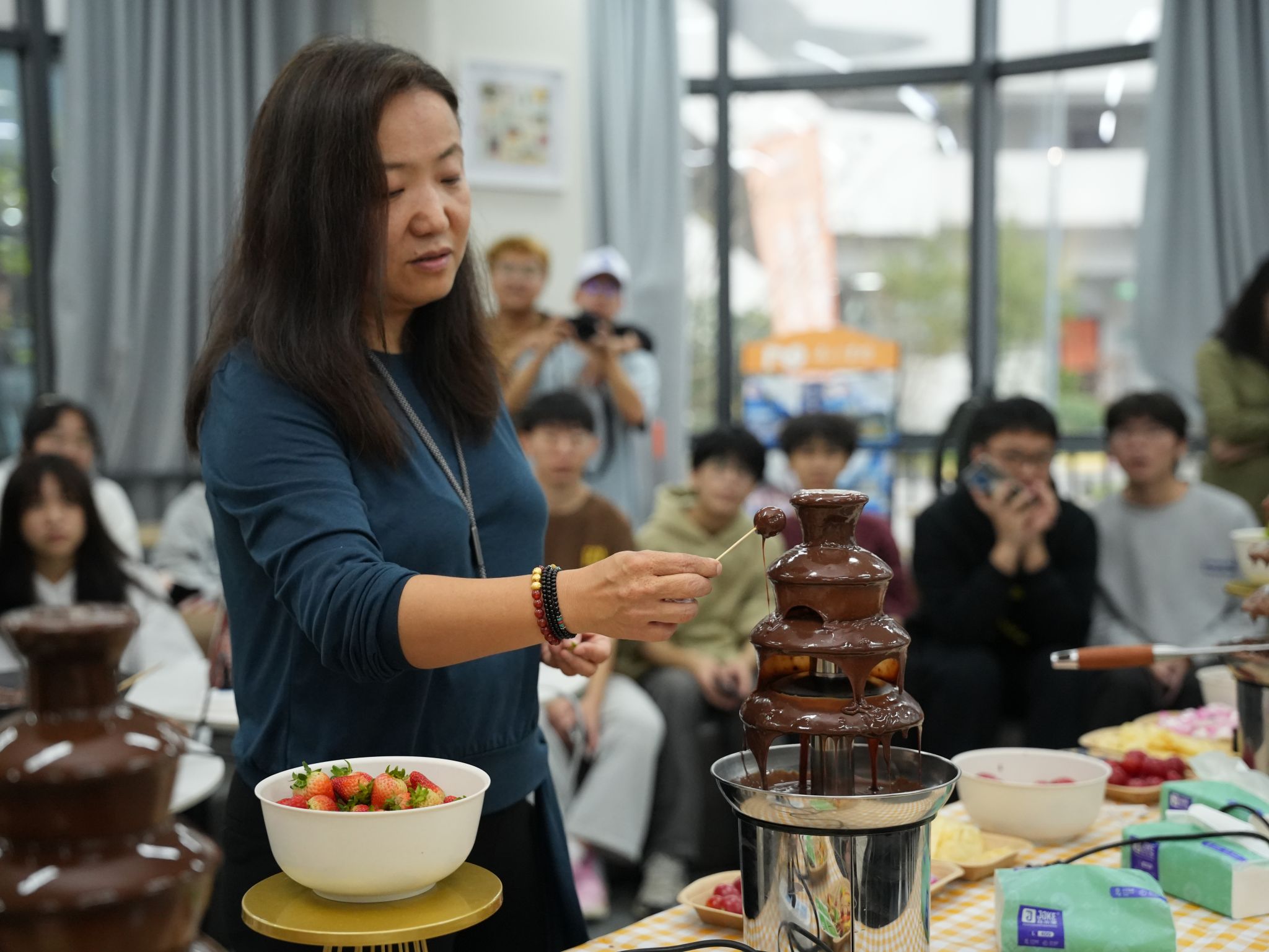 通过老师的生动讲解,学生们得以窥见巧克力制作背后的奥秘,对这份甜蜜的艺术有了更深的理解和欣赏。理论知识之后,迎来了实践的高潮——比利时巧克力瀑布体验环节。同学们亲手体验了巧克力从固态到液态的奇妙转变,感受巧克力如丝般顺滑的触感,共同品味嘉宾专程从比利时带来的醇香巧克力,此次体验不仅是一次味觉的享受,更是一次文化的探索之旅,让同学们在品味比利时巧克力的同时,也领略异国文化的独特魅力。