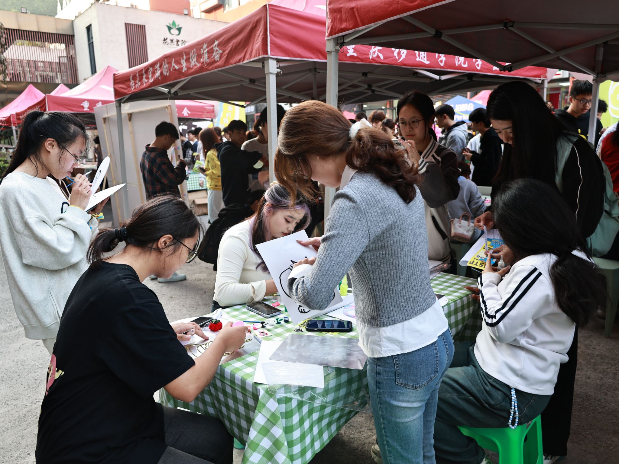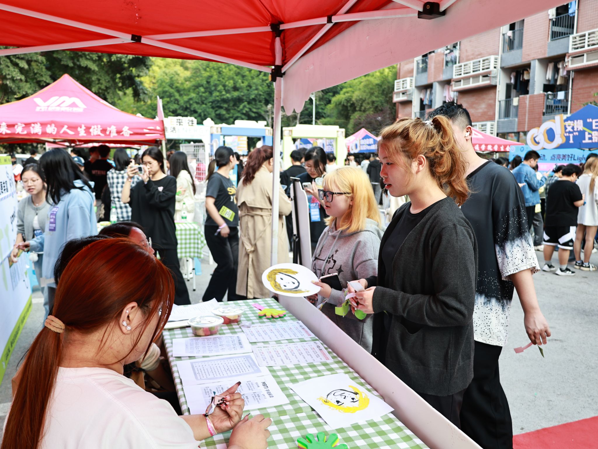 与自己对白,开启一场探索自我的青年社交局。活动现场邀请同学们以绕线签到的方式进行MBTI互动式测试,解锁专属“MBTI大会”代表证,以此开启向内求索、寻求同频好友的奇妙之旅。用具象化“ID”,发现更真实的自己。同学们利用不织布、装饰配件等材料制作专属人格名牌,以个性化的方式表达多样化的自己,同时活动现场打造16人格Soc象限互动区域,引导同学们学会自我剖析、找准性格定位。以自白彩鸦展现个性的无限魅力,同学们以胶画形式绘制MBTI自画像,塑造独一无二的个人IP形象,重庆市合川区精神卫生中心医生们以彩绘艺术性心理疗愈为切入点,进行一对一绘画心理解析,助力移通学子健康成长自己,开启美好校园生活。