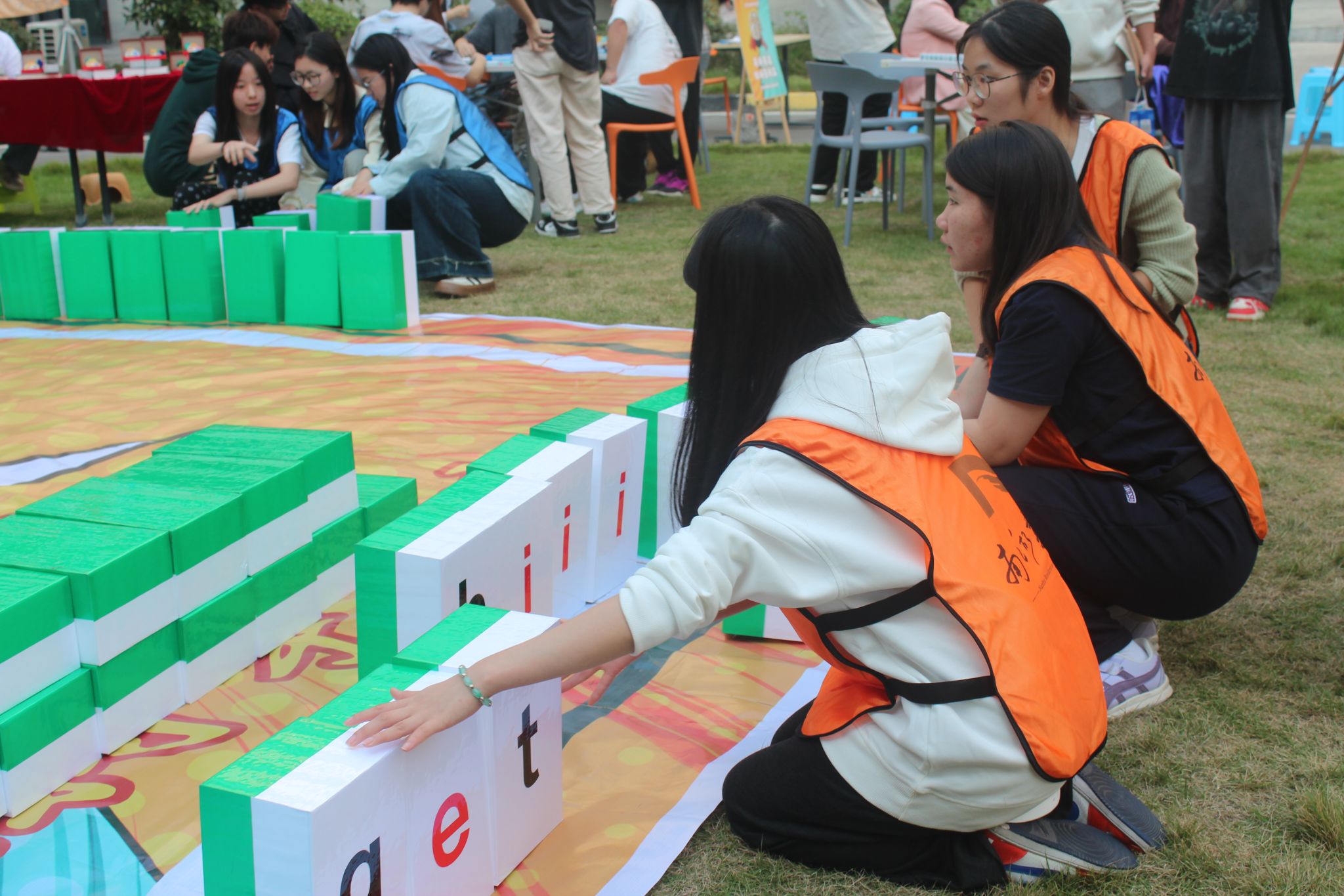 与往届活动不同的是,本届活动增设了团队巨型麻将体验项目。在团队协作战中,来自不同书院和学院的师生们组成了8支队伍,通过学习积分赛规则,各参赛队伍在激烈的比赛中充分展现出了他们的团队默契与独特的创新策略。巨型麻将让同学们在操作中奇妙地感受到单词词法、语法、句法的魅力,在团队协作的排兵布阵博弈中充分感受词汇较量中的脑力燃烧,将传统麻将与现代外语学习巧妙结合,为同学们提供了一个全新的趣味性学习方式。