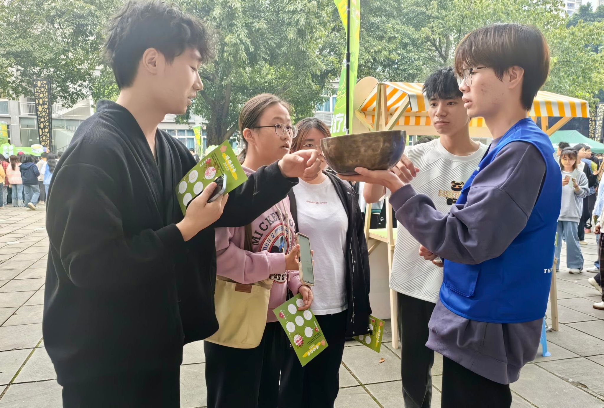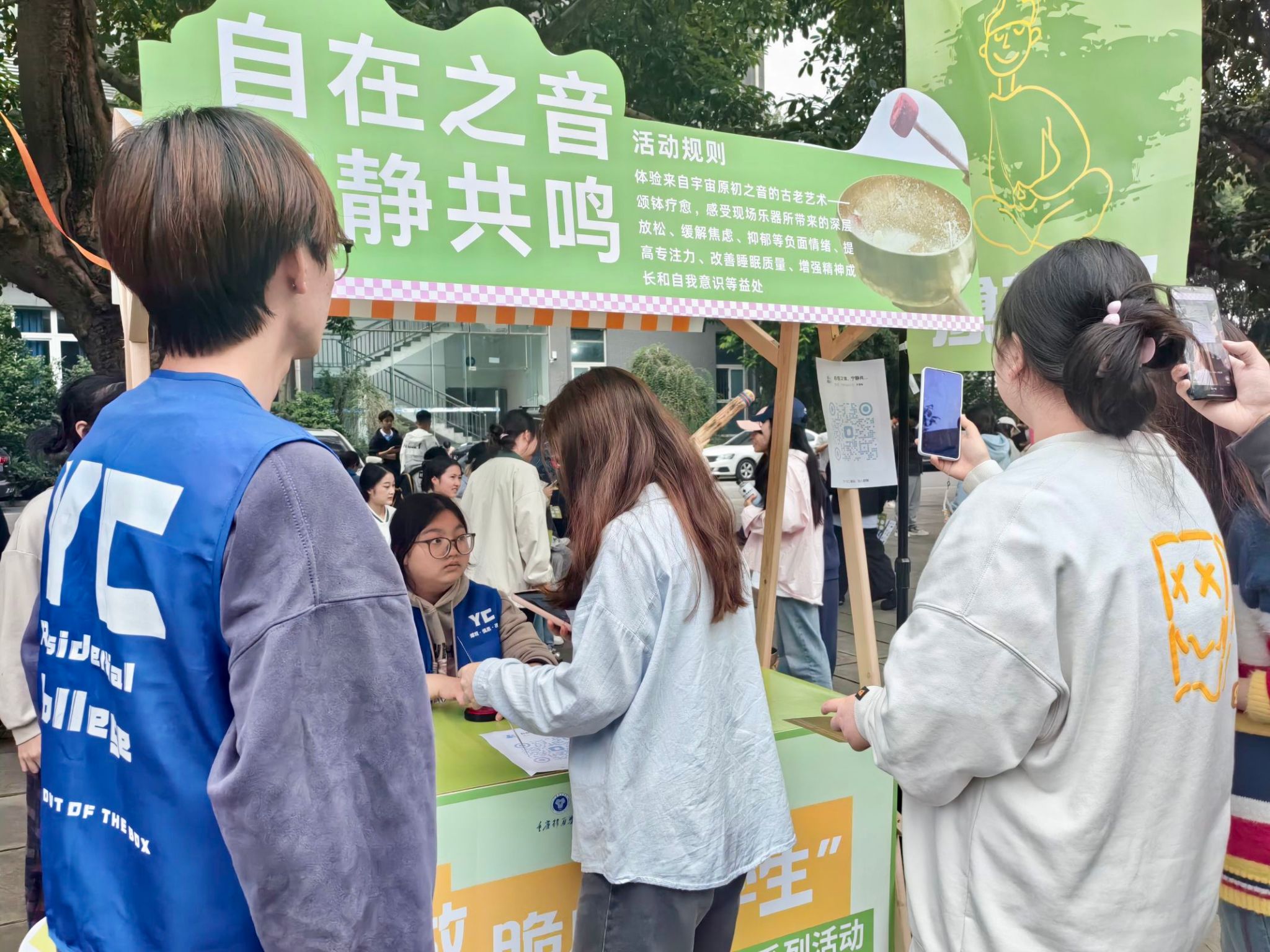 现场摊位点通过颂钵声音的力量为学生们带来内心的自在与宁静,让学生们在轻松愉快的氛围中参与互动。可以与同龄人交流分享自己的健康经验和心得,互相支持和鼓励。同学们在音乐和各种自然、和谐的声音中找到共鸣、舒缓压力、促进的心理健康,提升心灵的愉悦感和宁静度。