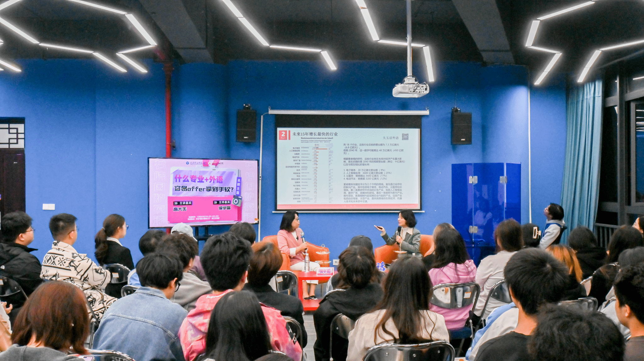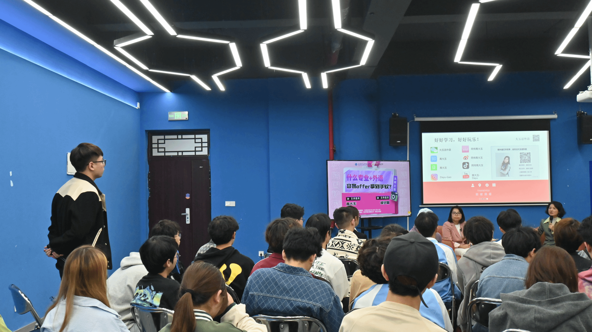 高老师表示在当今全球化的时代背景下,随着国际贸易和文化交流的不断深入,掌握一门或多门外语已经成为职场竞争中的关键优势之一。特别是在云计算、汽车、数字广告、半导体、网络安全等领域的企业对外语交流能力尤为看重。侯院长也为在场学生讲解我校毕业生凭借外语和本专业的结合找到心仪工作的案例,认为外语能力不仅是求职过程中的“金钥匙”,更是个人综合素质的重要体现,尤其是对于与国际接轨紧密的新兴行业中更为明显。