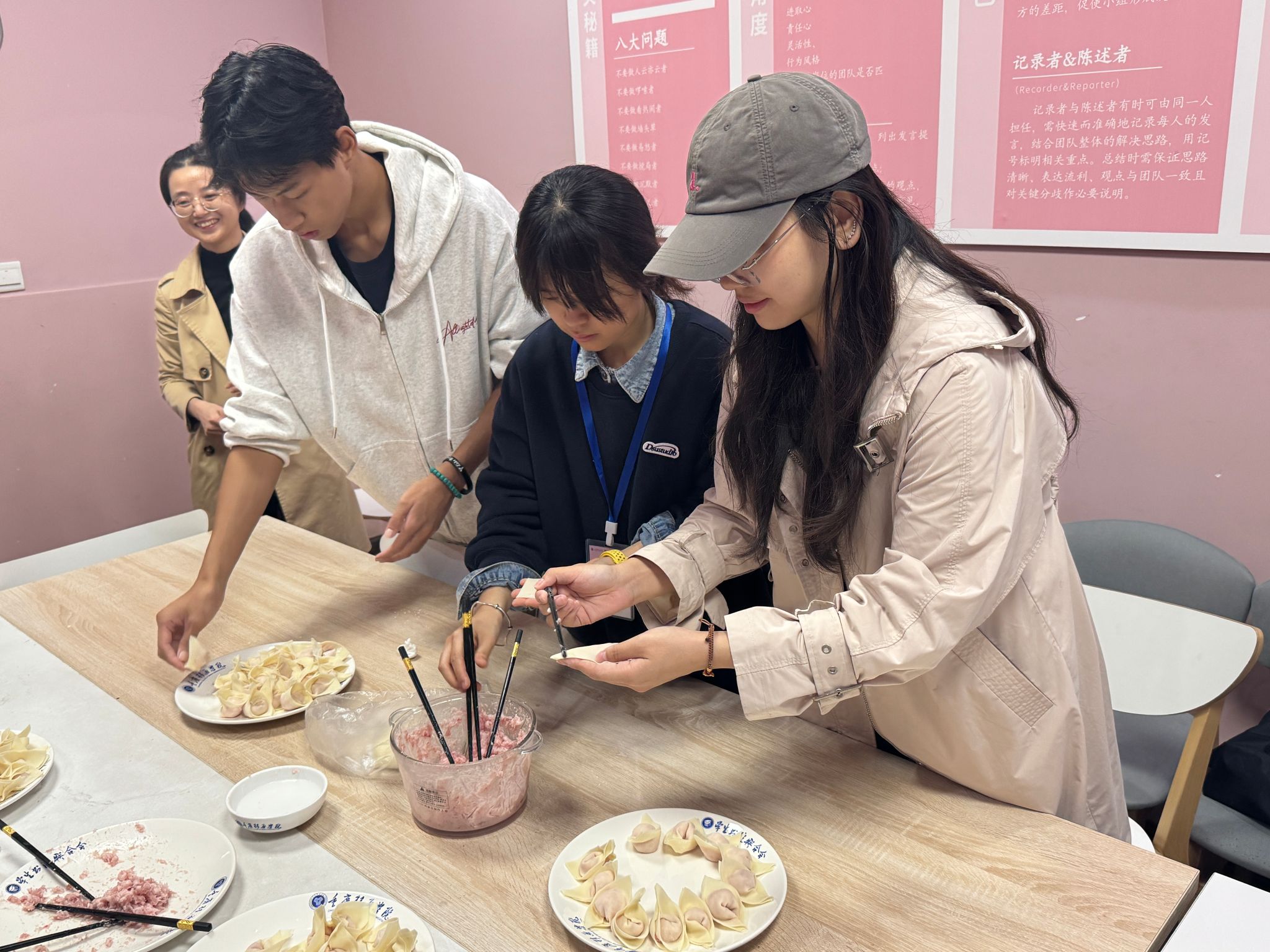 10月31日9:00,“零距离·邻聚里”书院师生早餐会第七期于别都书院就创指导站开展。艺术传媒学院胡磊老师、通信与信息工程学院李林燕老师、教务处代蕊岚老师与其异科班同学一同参与到早餐制作与生活分享中。大家分工合作,绞肉、调馅儿、蒸煮,每一个环节都充满了欢声笑语。代蕊岚老师更是亲自上阵指导,耐心细致地指导李承泽同学包抄手,两人之间的互动温馨而有趣,李承泽同学表示:自己从来没包过抄手,没想到第一次包抄手竟然是在学校。此次活动在推动双院融合及异科导师进书院的同时也促进师生之间的交流与互动,加强了学生的人际交往能力。
