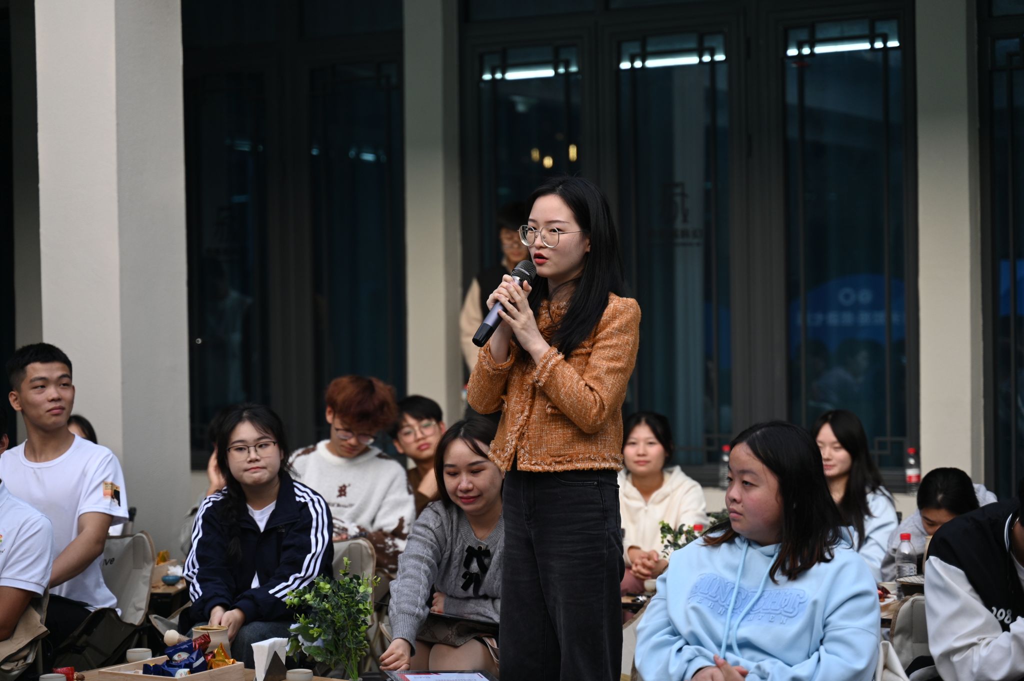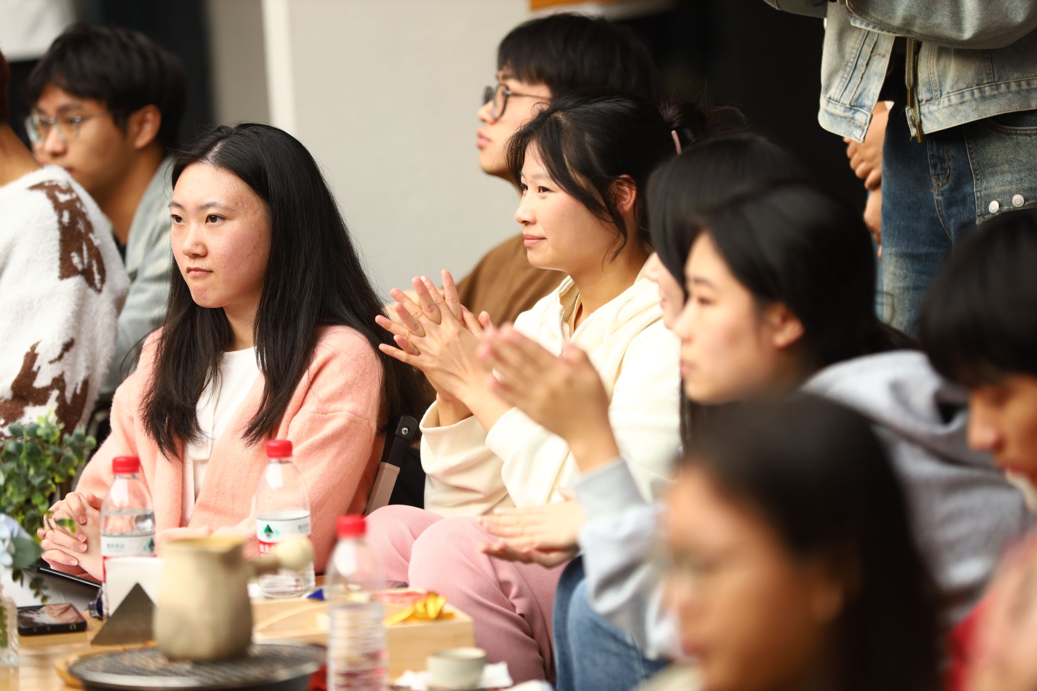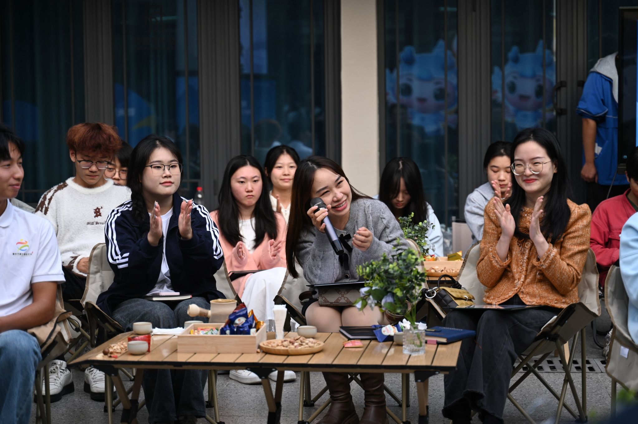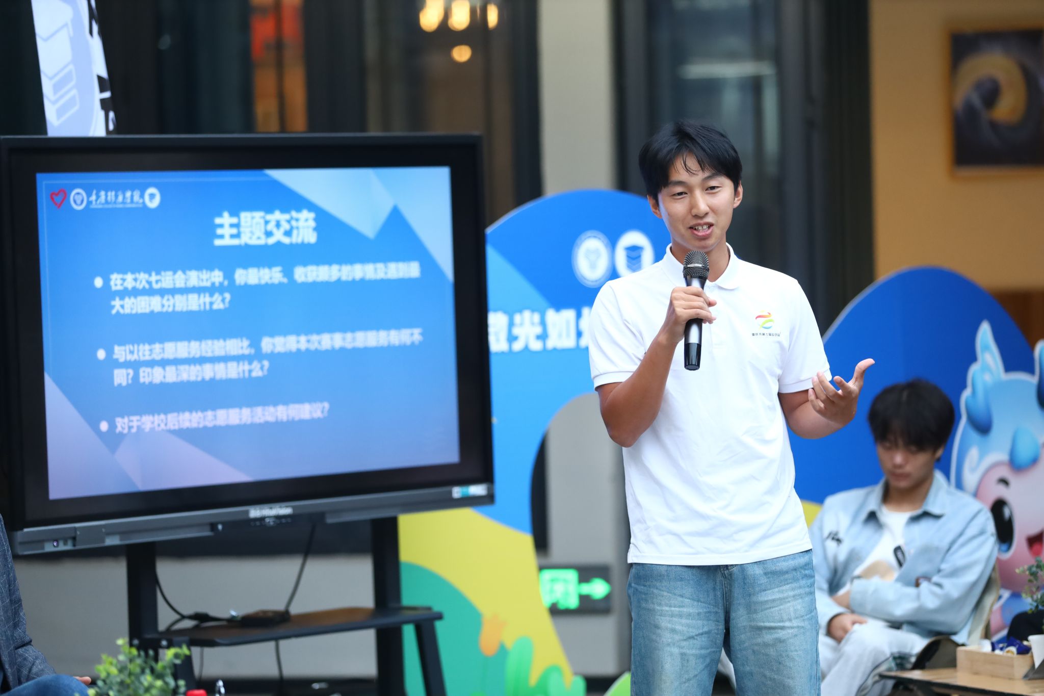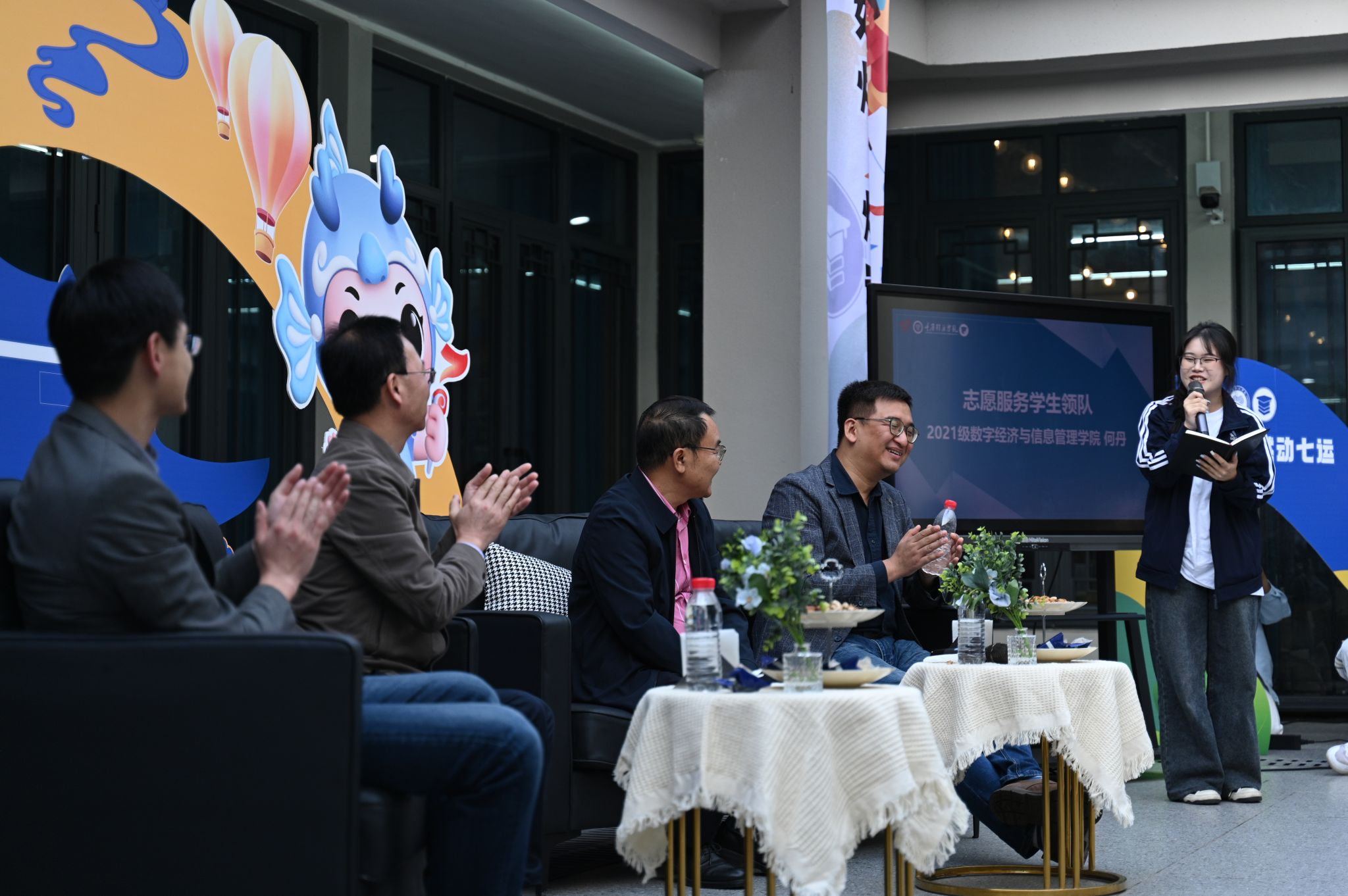 三名七运会开幕式表演人员、赛事志愿服务人员代表及一名带队老师代表与在场43名师生共话本次七运会经历与感受。来自2022级淬炼商学院的向颖作为开幕式演职人员代表向在场师生讲述一名非专业舞蹈人员的体验,深刻领悟到团队合作的重要性,既有家文化的温暖感受,又有心灵洗礼与成长。来自淬炼商学院2022级的李元媛向大家分享她与七运会的志愿故事,参与乒乓球、篮球等十余项赛事服务与技术培训,积极对接赛事、媒体,捕捉七运会志愿暖心时刻,收获成长的同时也充满探索未来的动力。来自2021级数字经济与信息管理学院的何丹同学担任本次市七运会移通志愿者领队,从“七运会半程马拉松”“4至6月的最大考验期”“7至8月的炎暑志愿奉献”“赛会志愿者身份初遇新生”四个阶段分享本次七运会的志愿服务经历,并在最后以即将毕业的大四学生的身份感慨自我成长与蜕变。智能工程学院辅导员刘桃老师参加了此次七运会排演组织工作,从选拔与组建、排练与磨合、组织与应对等多方面讲述七运会表演的初见雏形与大放异彩,展现出一名高校教师对教育真谛的深化理解,对教学内容跨学科交叉融合的不断探索。