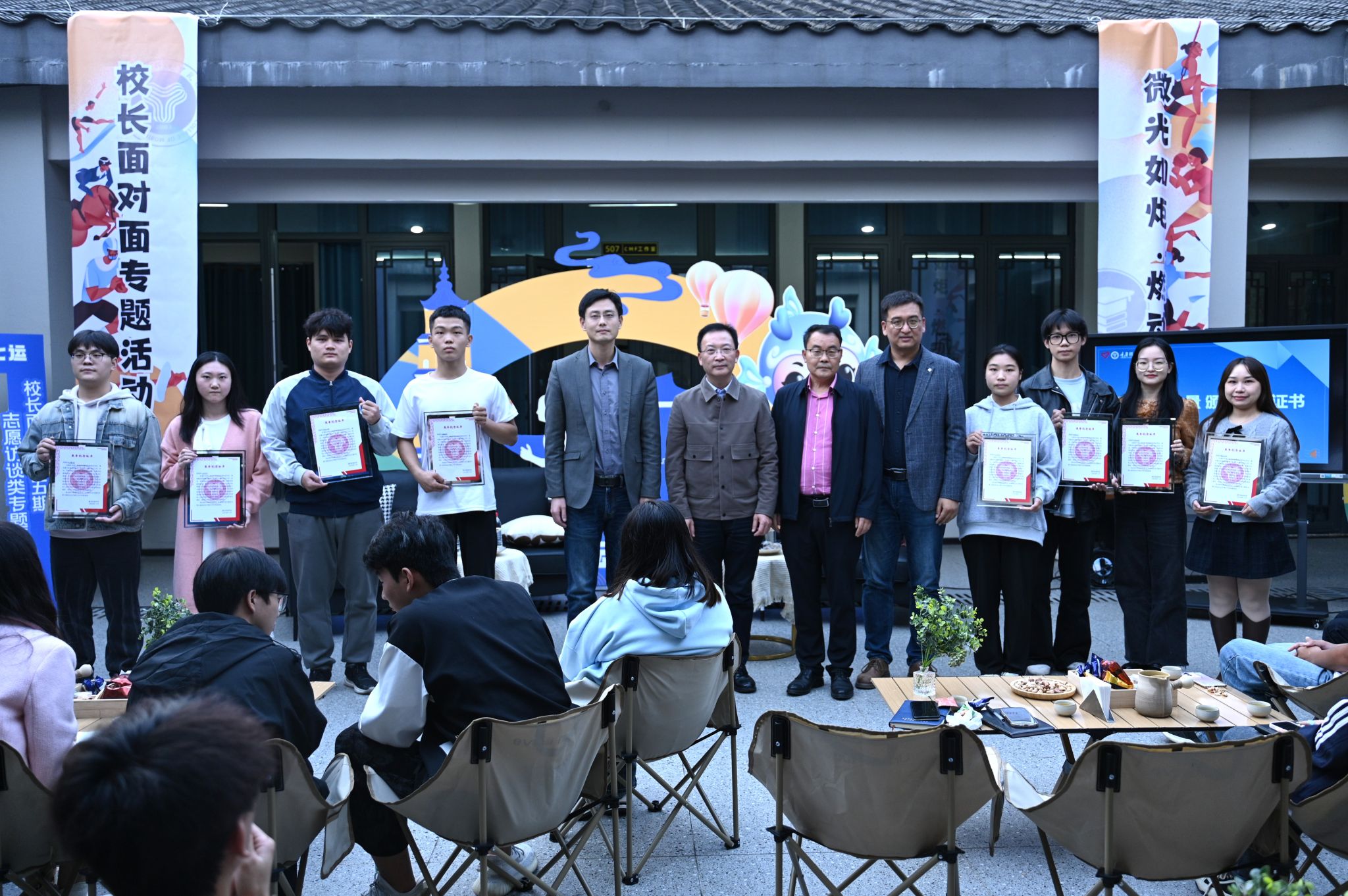 与会校领导代表与本次七运会志愿服务及演职人员代表深入交流,认真听取在场师生的分享与建议,并分别对本次校长面对面专题活动进行总结发言。周校长回顾本次七运会经历,谈到学校领导、各部门做好协调与保障工作的同时,也为所有参与七运会工作的师生提供力所能及的服务,使得整个组织更加有序,并向付出艰苦努力的参与七运会的所有师生表达肯定、感到自豪,祝福与会师生携移通精神奔赴美好未来。何书记再次向参与本次七运会过程中付出艰苦努力的开幕式演职人员与赛事服务人员表示感谢,希望各位师生能把顽强拼搏的体育运动特点与奉献、友爱、互助、进步的志愿精神带入生活学习与教学工作中,更希望将移通的志愿精神带到全国,带到世界,发扬光大。最后,吕校长向本次参与七运会赛事服务与开幕式演职人员们表达慰问,在七运会舞台上展现学校良好形象,受到合川区领导表扬,更是“最艺术的非艺术大学”的完美诠释,同时移通师生不畏艰难、团结合作的特征也得到充分体现。吕校长提出对我校师生的希冀,希望同学们在更多活动中提升自身综合能力,造就完满人格。活动进入尾声,与会各位领导为本次七运会参与志愿服务与演职工作师生代表颁发第五期校长面对面专题活动纪念品,定格瞬间。
