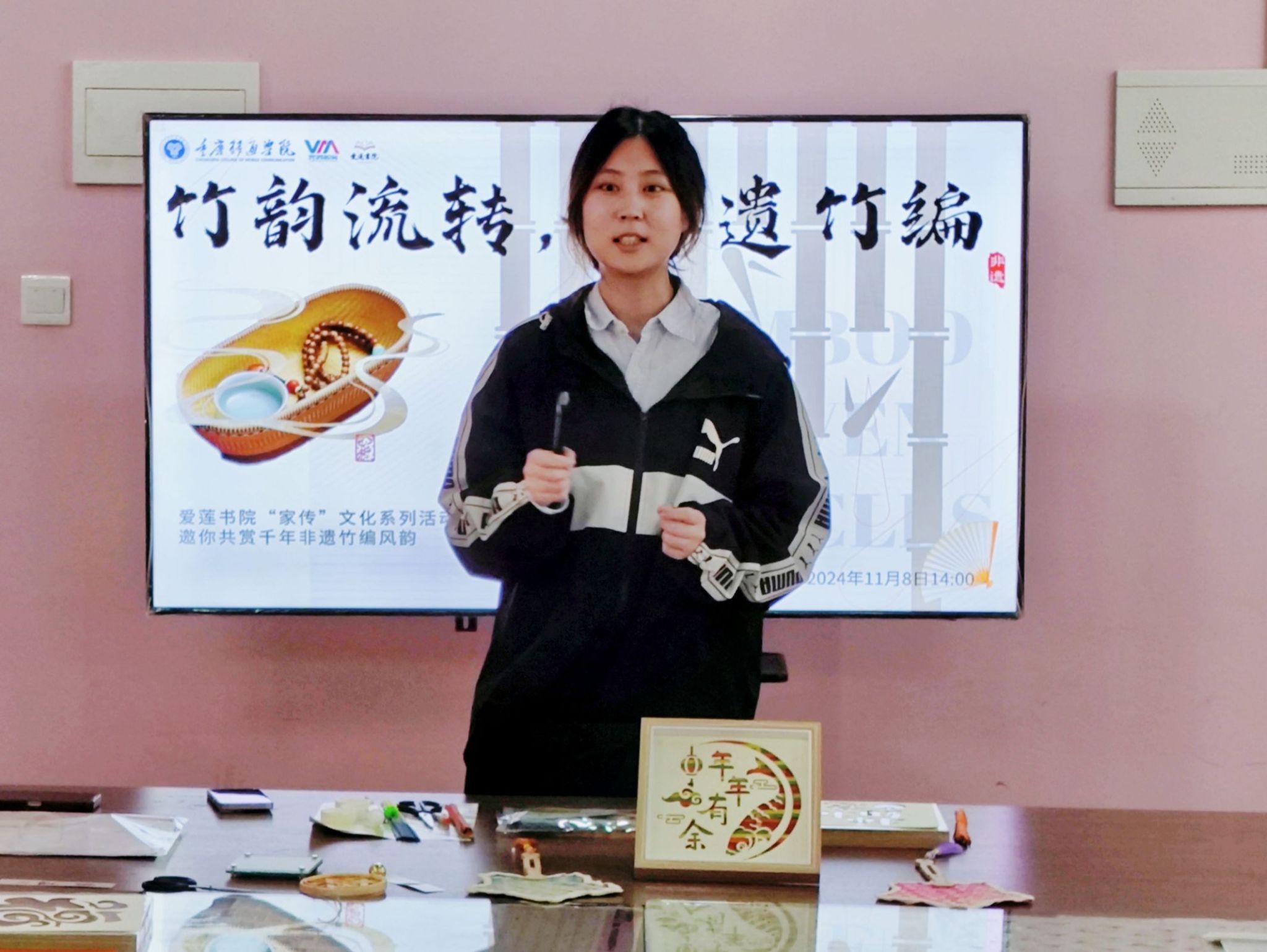 纵横交错的竹丝,编织着岁月的痕迹。活动伊始,爱莲书院学生发展导师刘晨曦从竹编的历史渊源、制作流程、艺术作品、传承意义等多方面为参与学生深入讲解了非遗竹编技艺的相关内容,旨在能够让同学们在理论讲解的基础上对竹编技艺的制作流程、编织手法,以及其历史和文化意义有一个基本的了解。同时,活动中还通过对竹编文化传承相关纪录片的播放和对类型、风格多样的的竹编作品的展示,让同学们能够真正从“听”“看”“摸”多个方位对竹编技艺的传承与演进拥有更加深刻的理解。