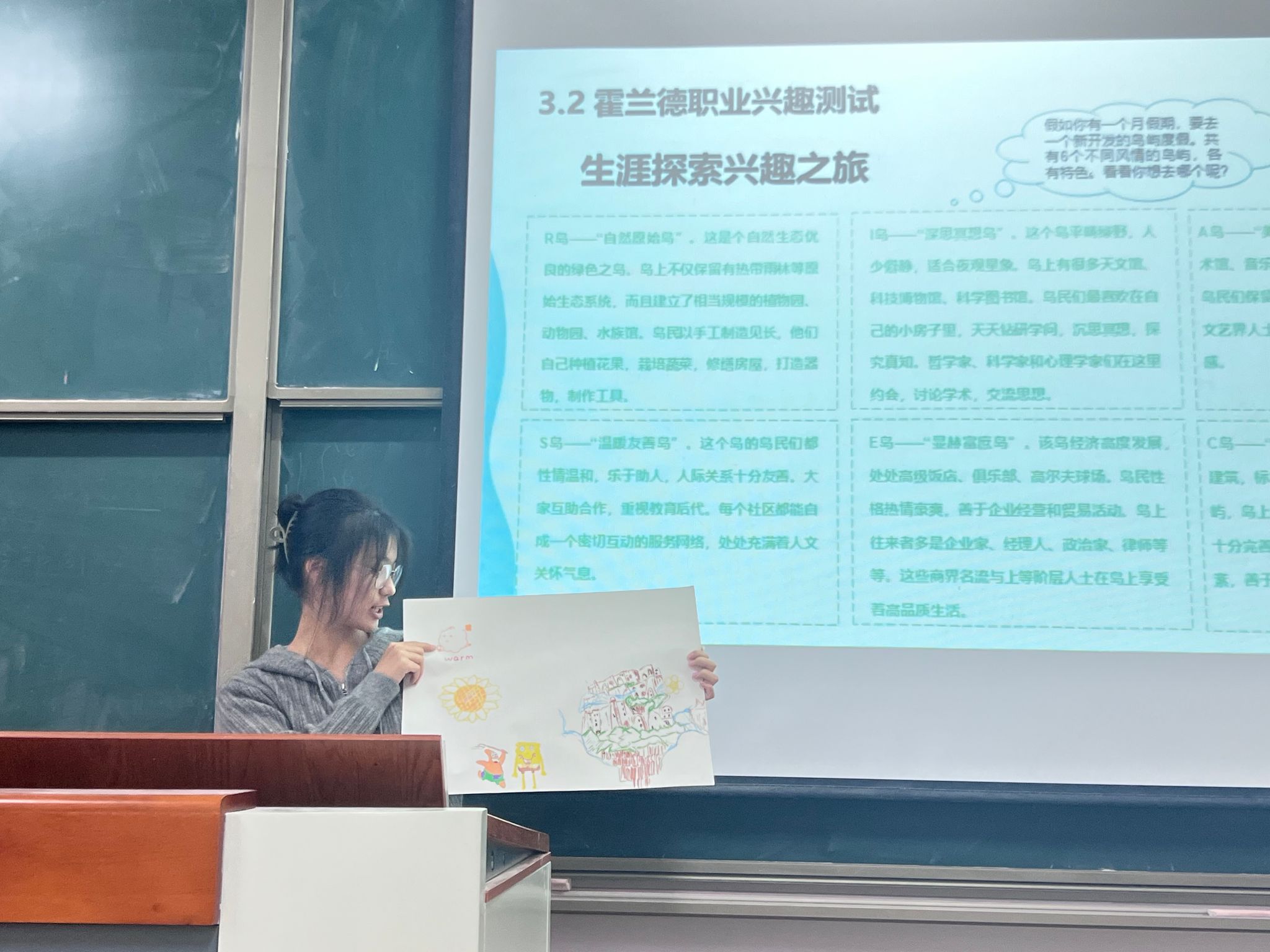 为了帮助英语类的学生更好地了解自己、关照自己,并更加清晰地规划自己的职业生涯,2024年10月16日,由全生异科导师胡慧敏主持,传媒学院于近日举办了一场以霍兰德职业兴趣理论为基础的职业生涯辅导活动。同学们分为五个小组,每组学生需要挑选并绘制一个自己向往的岛屿,岛屿类型包括美丽浪漫的岛屿、深思冥想的岛屿、现代井然的岛屿、自然原始的岛屿、温暖友善的岛屿和显赫富庶的岛屿。在绘制岛屿的过程中,不仅将自己的职业兴趣巧妙地融入其中,还精心设计了未来在岛屿上生活的状态和设定人物。他们用笔触勾勒梦想,用色彩渲染未来,每一幅作品都闪耀着他们独特的职业愿景和人生理想。在共同绘制的过程中,学生们相互启发、彼此借鉴,不仅加深了对自我职业兴趣的认知,还激发了对未来职业生涯的无限憧憬。在活动中同学们不仅学会了如何更好地了解自己、关照自己,还更加清晰地规划了自己的职业生涯。此次活动将学生的所学专业与其未来从事的职业更好地连接起来,通过趣味性的方式激发学生对职业兴趣的探索。