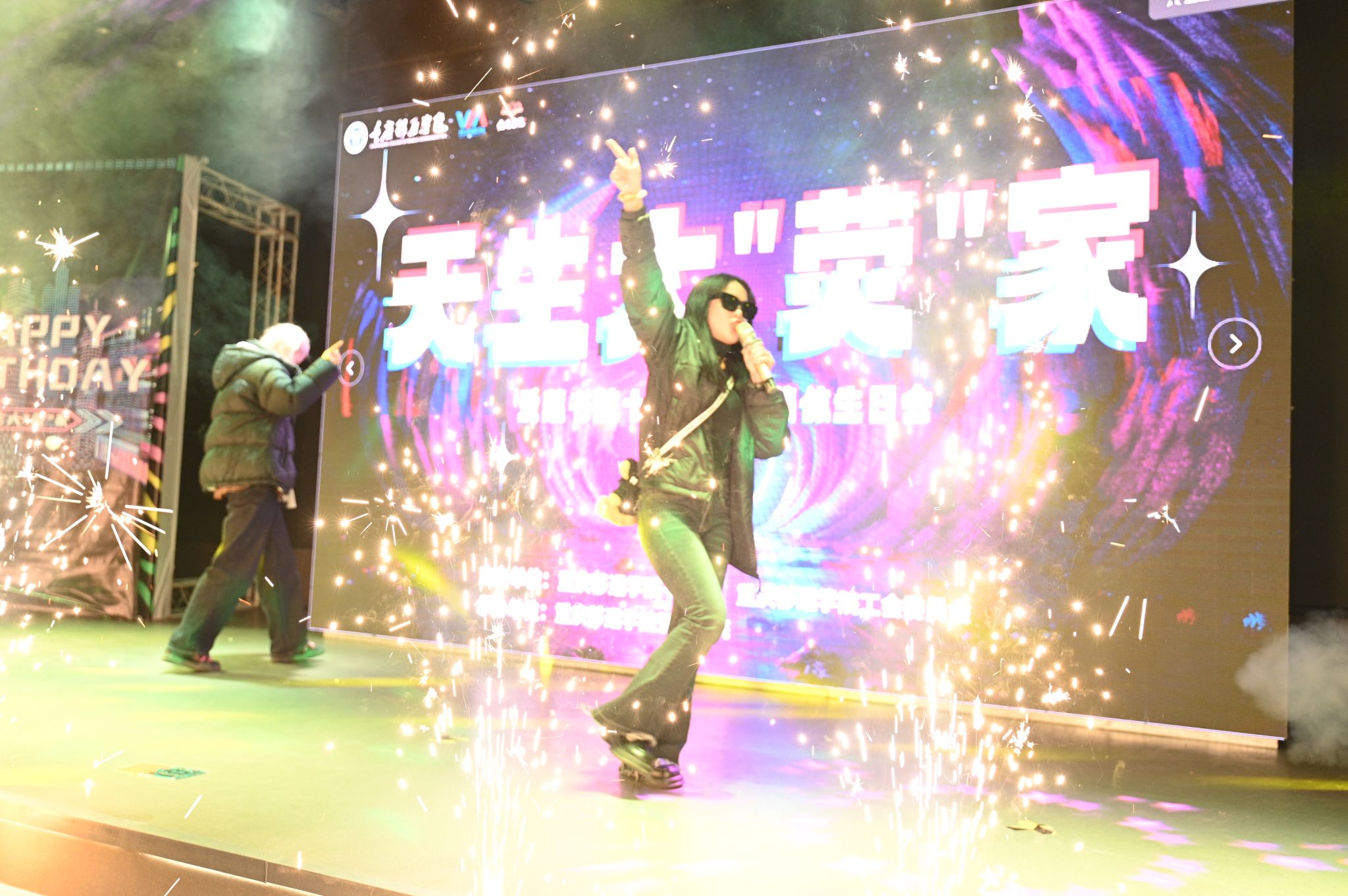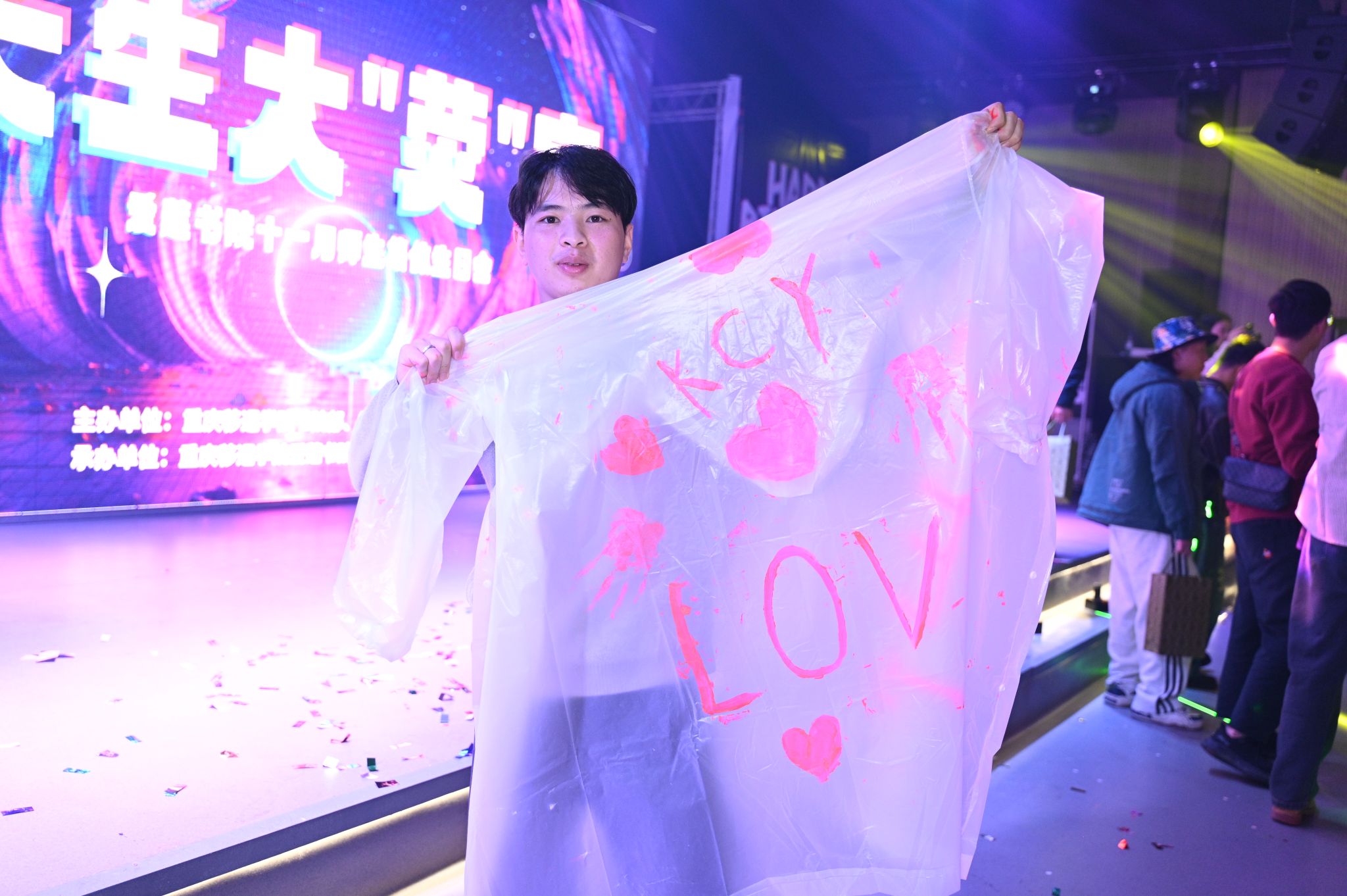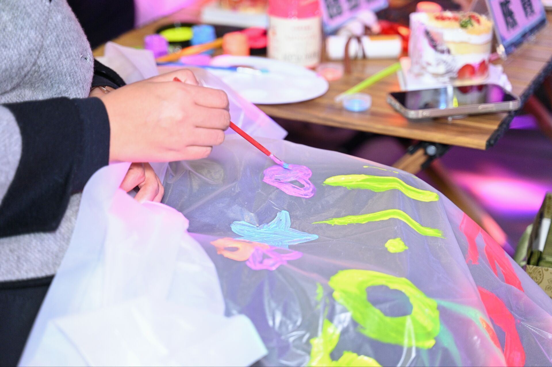 送完生日祝福,温馨的氛围萦绕着整个会场,但这并不是结束的信号,而是另一个高潮开始的过渡。随着帷幕渐渐落下,一场别开生面的荧光派对正式开启。本次派对以“After party”的形式展开,将电音、DJ说唱等潮流元素完美融合,为师生们带来了一场视听盛宴。炫彩灯光下,现场师生们身着由自己手绘的荧光雨衣,跟随DJ的动感音乐和rapper们的活力说唱律动。这一刻,现场仿佛变成了一个梦幻的荧光世界,每一个人都在这里找到了属于自己的舞台,享受着这份难得的欢愉与惬意。