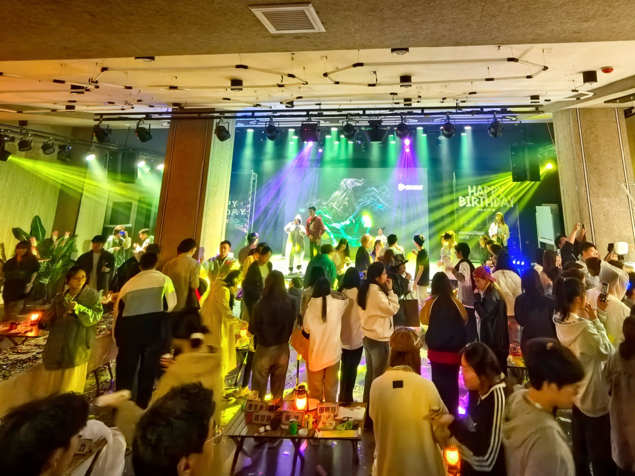 本次生日会由德国工程学院刘老师的数字魔术拉开序幕,纸牌在其手指间的不断变换配合着生动有趣的故事讲解,为现场的氛围增添了几分神秘感与趣味性。动感的音符律动、炫彩的彩饰灯光、朋克的现场布置,共同为寿星、观众们打造了一个充满惊喜的奇幻世界。
