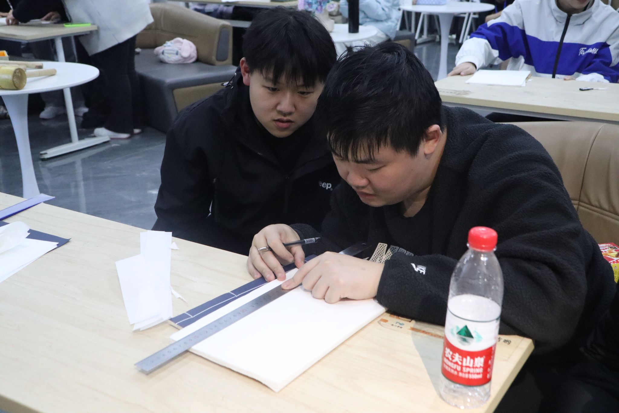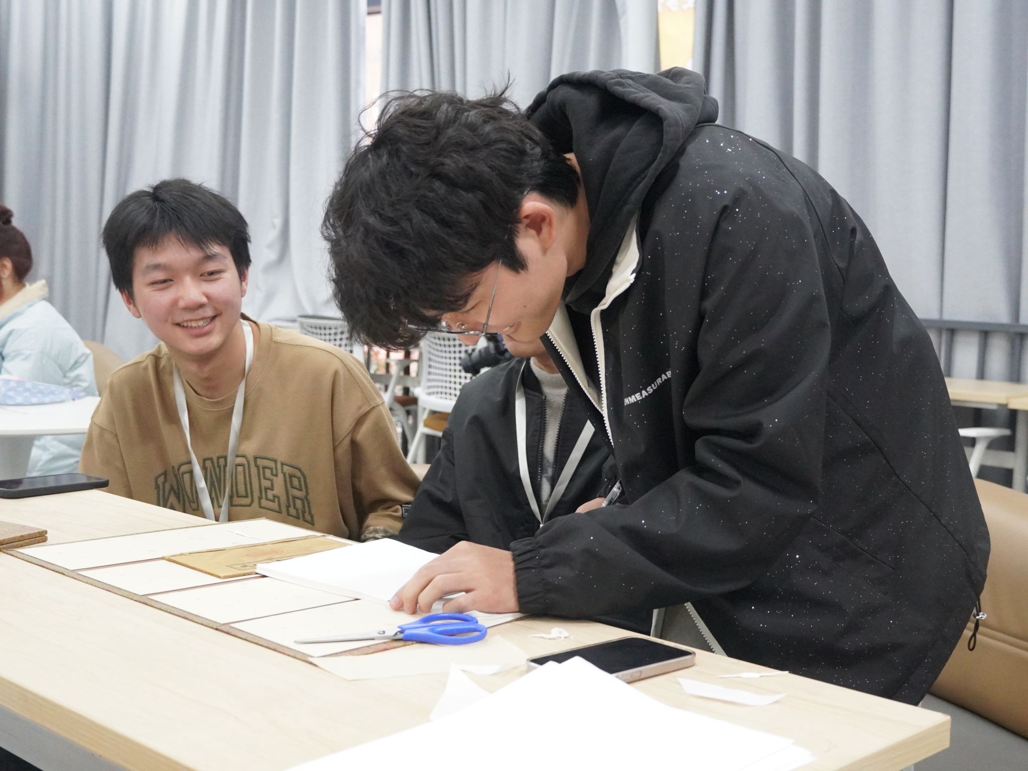 在了解了装帧的相关注意事项后,胡老师将30名同学分为6组并为各组选出组长。在组长的带领下,同学们利用现场提供的工具与材料开始了有趣的蝴蝶装制作体验。他们小心翼翼地折叠纸张,精心排列书页,耐心粘贴,并发挥创意为书籍设计独特的封面。