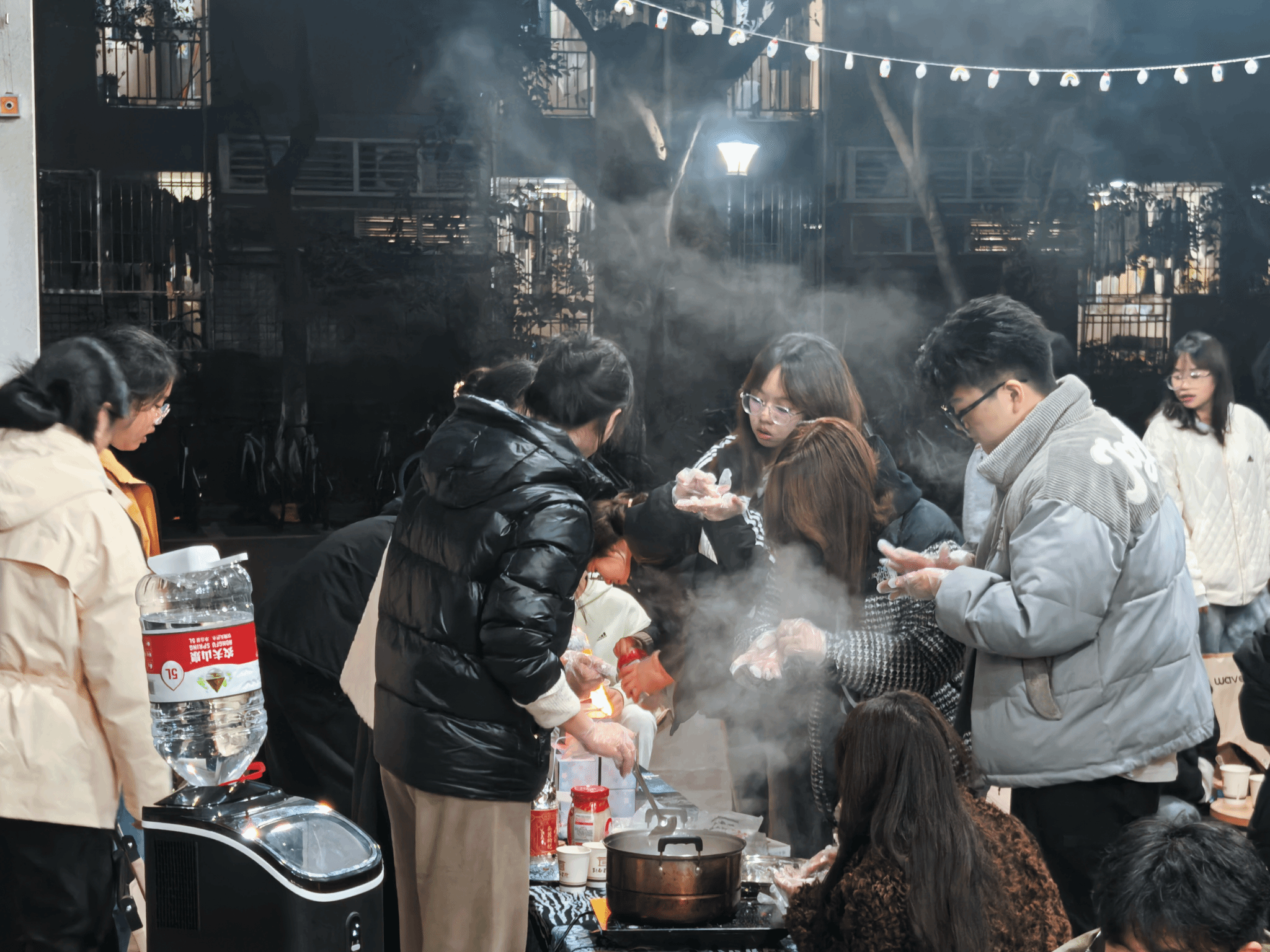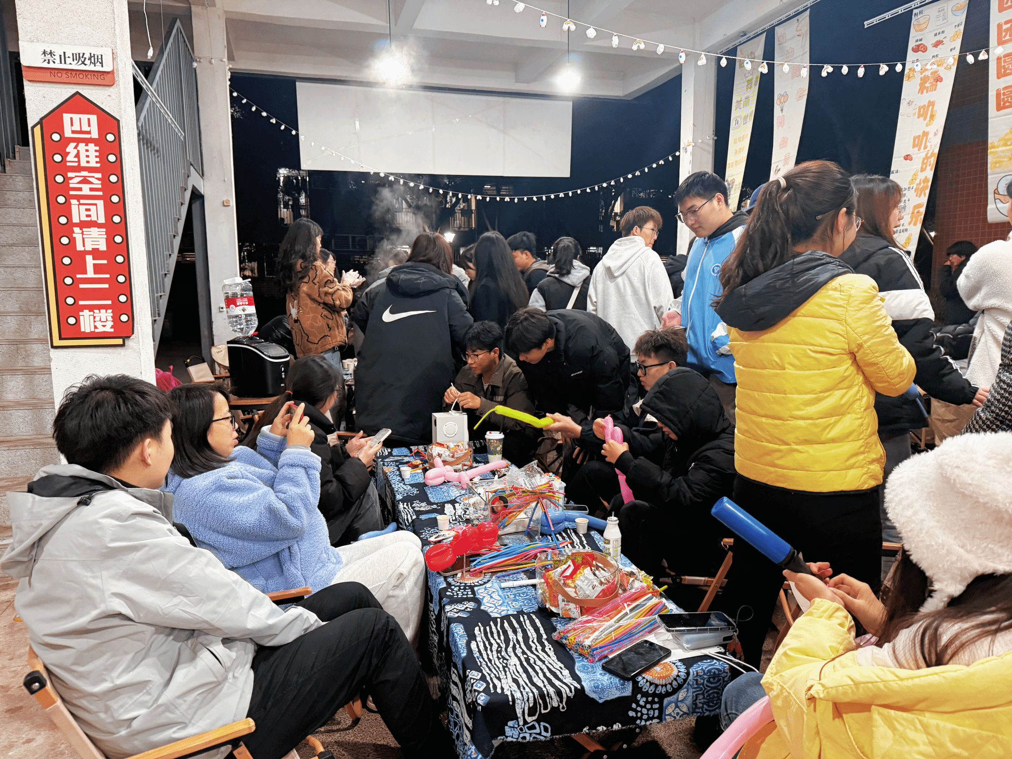 这不是普通的夜晚,而是“移通er”课后的特别时刻。来自别都书院、通信与信息工程学院、淬炼商学院、别都书院异科导师团队的黄新燕、孙怡、陈颖、林森、郝志宽、陈露桦等20余名教师化身摊主,在这片被温暖照亮的空间里设立了各自特色鲜明的小摊位与同学们进行深入的互动交流。“糯叽叽的快乐”摊位提供了软糯的小汤圆,让同学们在享受美食的同时感受到家一般的温馨;“奈柿·TEA”摊位中一杯杯现煮奶茶,师生们在这里品“茗”聊天;“自由舞者”鼓励大家放下束缚,随着音乐尽情舞动身体;而“心灵解压站”与“和焦虑say拜拜”则为那些感到压力山大的同学提供了一个放松心情的好去处,通过一系列轻松有趣的互动帮助同学们缓解紧张情绪;“真心话大冒险”让大家能够在轻松愉快的氛围中相互熟悉。同学们围坐在摊位前,品尝着甜蜜关怀的同时也分享起自己在生活、学习中的趣事,空气中充满了欢声笑语,大家手牵手共同为这个冬日的夜晚演绎出一曲曲美妙动听的“旋律”,在这个没有固定讲台和听众席的空间里,每个人都可以自由地展现自我、倾听他人,从而构建了一个更加开放包容的学习社区。