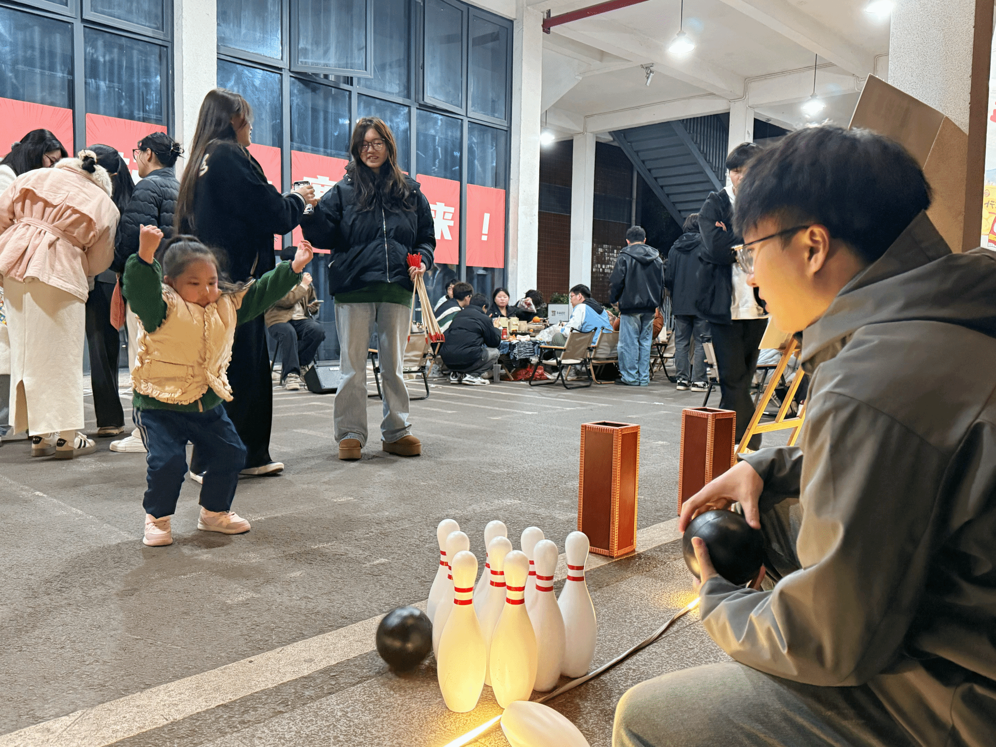 除了要和所有的“emo”说拜拜,还要和所有的“快乐”说嗨嗨!为了增加活动的趣味性和互动性,本届师生夜市特别设置“进击保龄球”、“投壶大作战”、“自由K歌”以及“自助桌游”等互动环节。在这,无论是老师还是学生都暂时放下了日常的身份标签,纷纷化身为“游戏小达人”,在游戏中挑战自我,享受着轻松愉快的氛围。“进击保龄球”成为了最受欢迎的项目之一,参与者们不仅能够通过这种方式释放压力,还能体验到球类运动的乐趣。而在另一边,“投壶大作战”也同样吸引了不少人的目光,这项看似简单实则考验技巧与耐心的游戏让参与者们跃跃欲试。同学们目标明确地瞄准了远处的壶口,现场也充满了鼓励的话语,这样温馨而又充满正能量的场景,使得整个夜市更加温馨和谐,也让每个人的心灵得到了治愈。