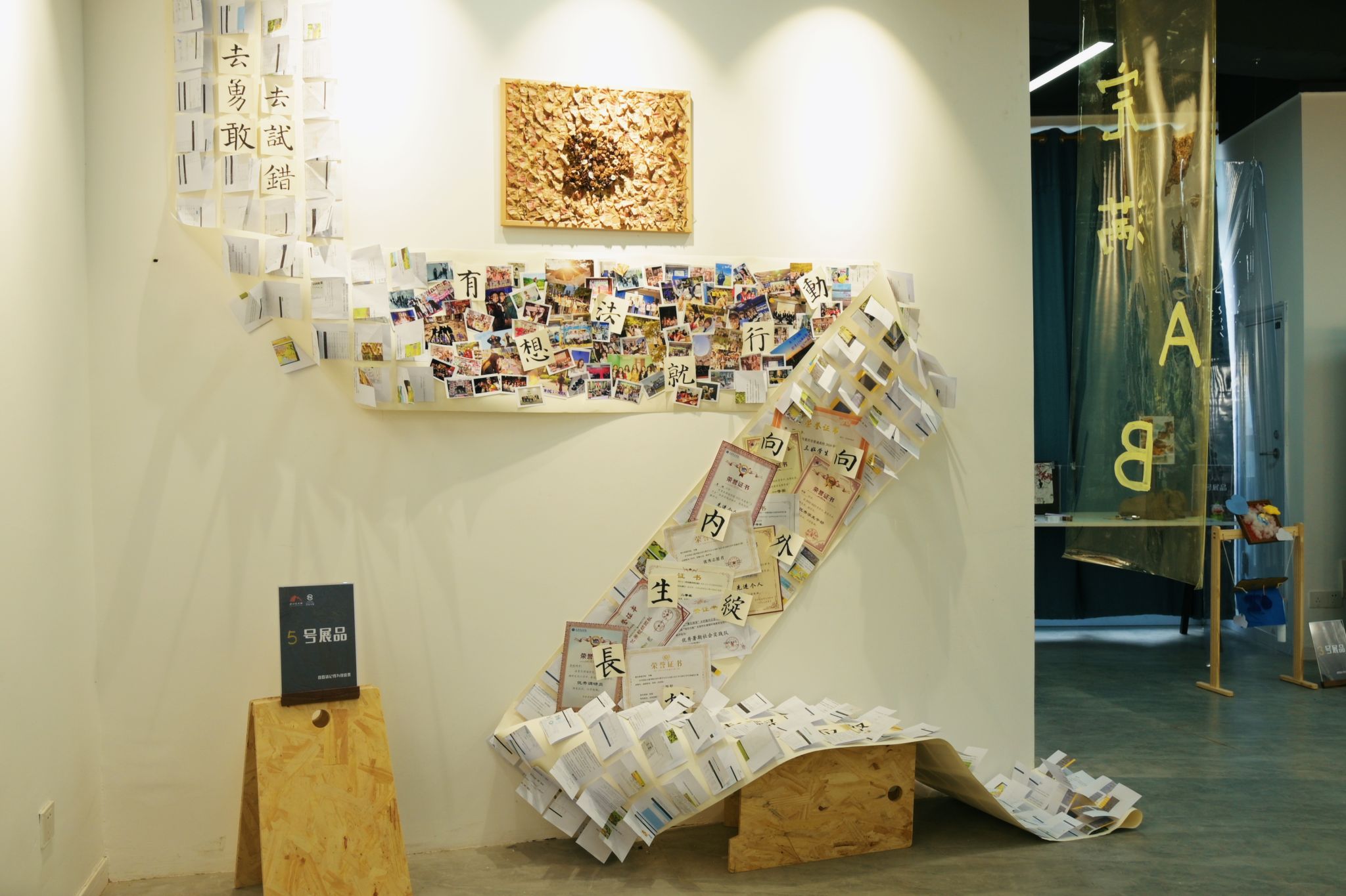 以前我常常会去美术馆或者博物馆,很少参观过与我们学生生活息息相关的艺术展馆。我满怀期待来到展厅,想要看看有关学生的展览是什么样子的。在展厅里,所展览的手工艺品、照片、音频,让我的脑海中浮现在课堂上认真学习的瞬间,在完满教育工作的点点滴滴。让我触动最深刻的是“一百次校园初见”之中,我似乎又看到那个提着厚重行李箱,背着书包第一次踏进校园,对一切都充满好奇的自己。