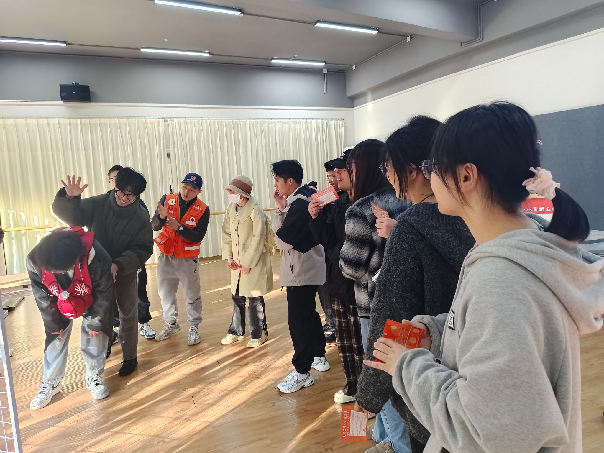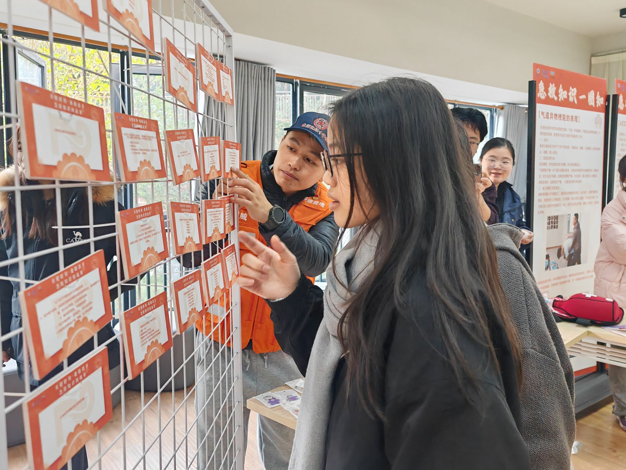 自救互救梦工坊则专注于应急救护知识的普及与实践。“心肺复苏胸外按压深度是多少?”“心脏骤停后救助患者的黄金时间为?”一系列应急救护相关知识被精心制作成20张题卡,等待同学们来回答、学习。而在实操区域,田威教练与工坊同学则亲自进行海姆立克急救法的教学,并鼓励每位同学进行实践练习,确保掌握急救技能。
