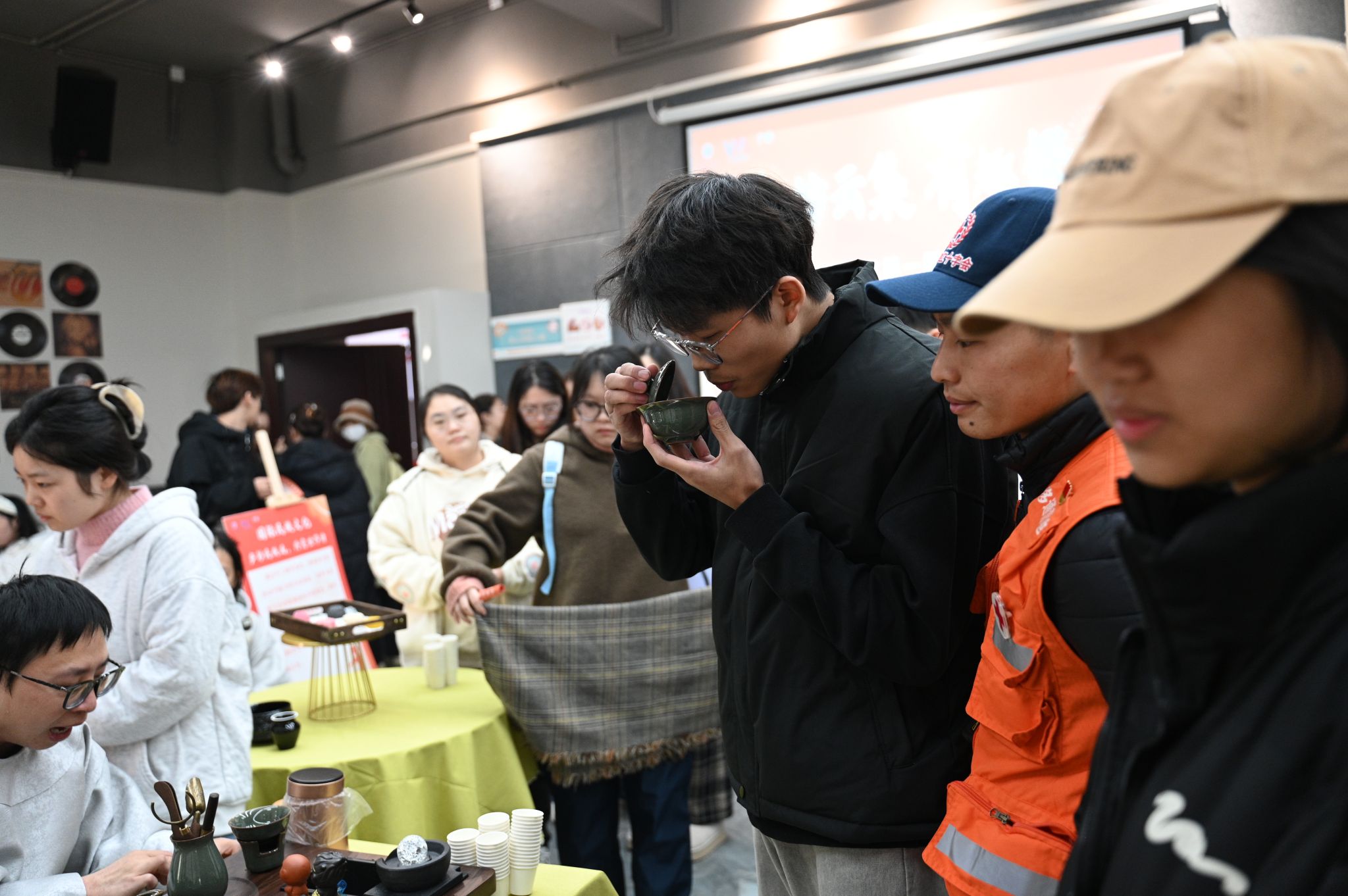 另一侧,陈明波老师身着汉服,为同学们进行茶道展示,讲解鞠躬礼、伸掌礼等饮茶礼仪。随着茶汤缓缓倒入茶杯,同学们也迫不及待地端起茶杯,细细品味着茶汤的香气和口感。