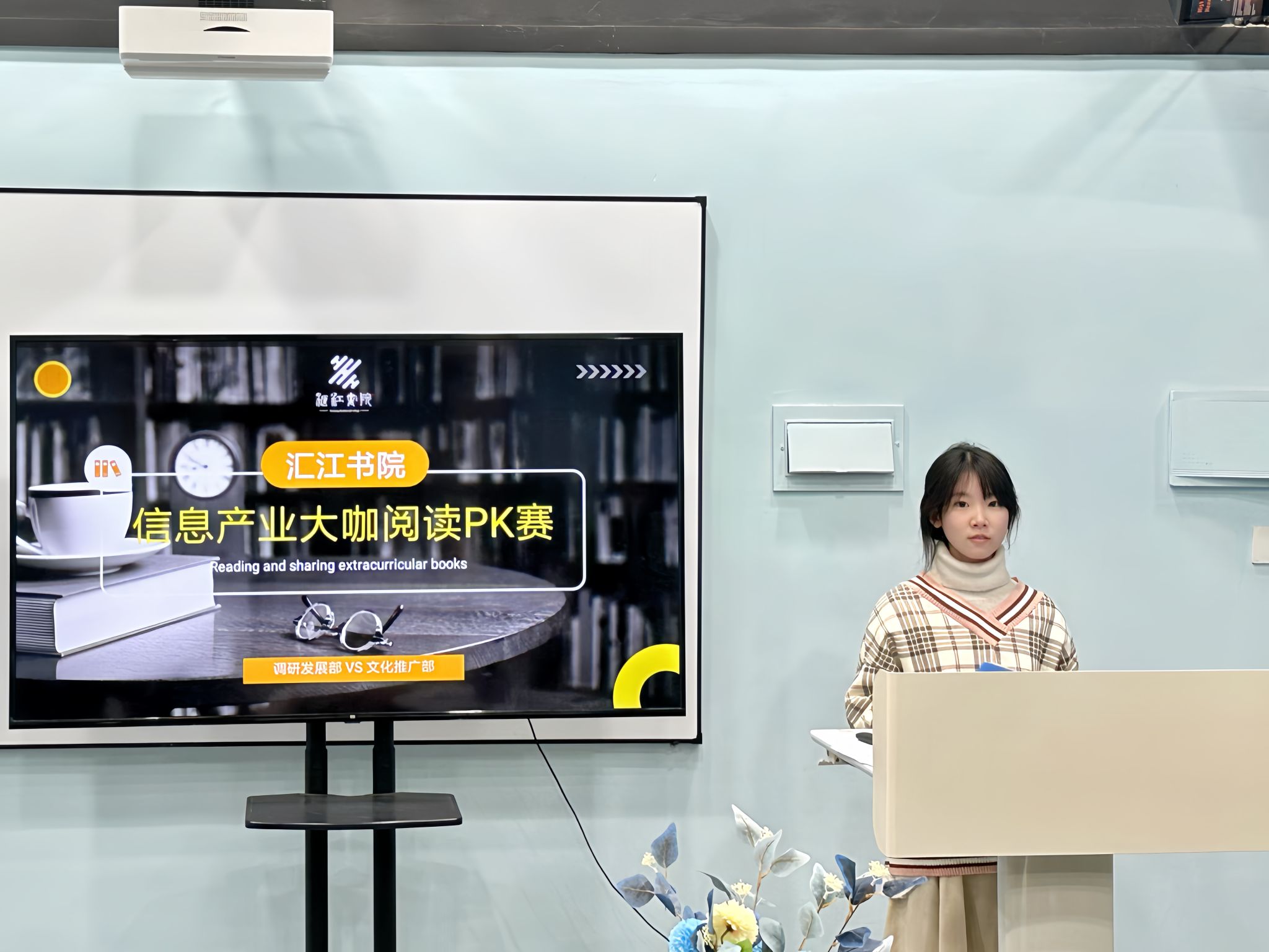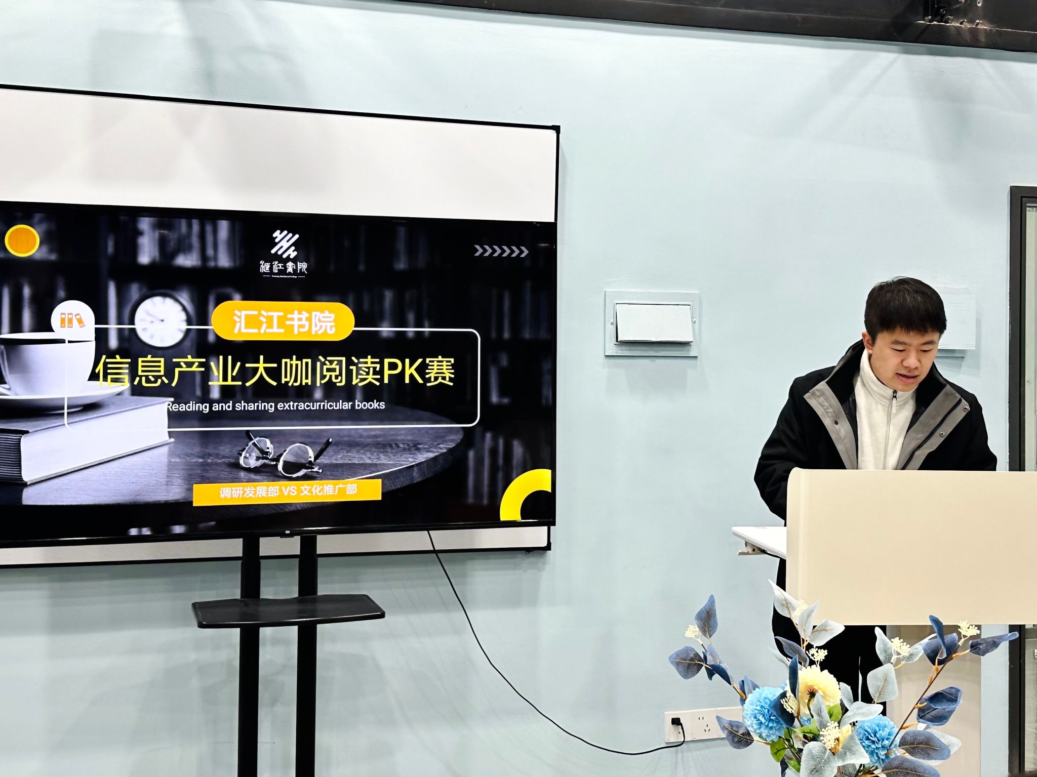 11 月 8 日,汇江书院创意翱翔屋迎来了一场精彩纷呈的信息产业大咖阅读分享 PK 赛。本次比赛中,汇江书院学生自治委员会的调研发展部和文化推广部的代表以演讲形式,聚焦名人传记、分享阅读感悟。