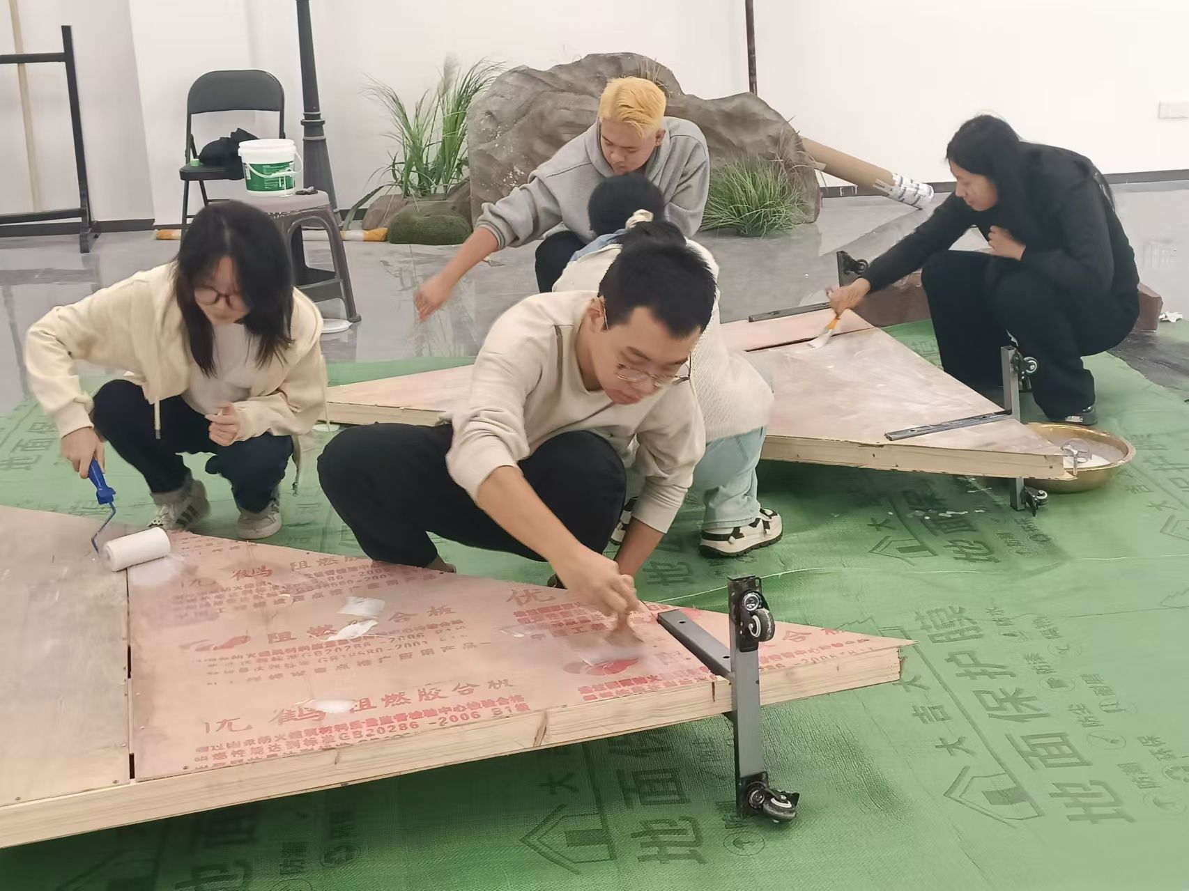 在寻求创新的十一月,群青工坊通过道具制作、装置设计等多种手段,为校园原创戏剧《蝴蝶飞跃时间海》和舞剧《挣扎》的舞台模型、道具进行了修复和完善。张胜杰老师开展模型制作实践课程,带领工作室成员积极创作,提升艺术理解和设计能力。从精心设计到最终舞台呈现,舞美工作室不仅助力剧目在视觉和效果上的呈现,也加深了学员们对舞台艺术的全方位理解,培养创作思维和团队协作能力。工作室成员的通力协作,使得舞台作品更加生动、精致,为校园的文化艺术创作注入了更多的创新元素。
