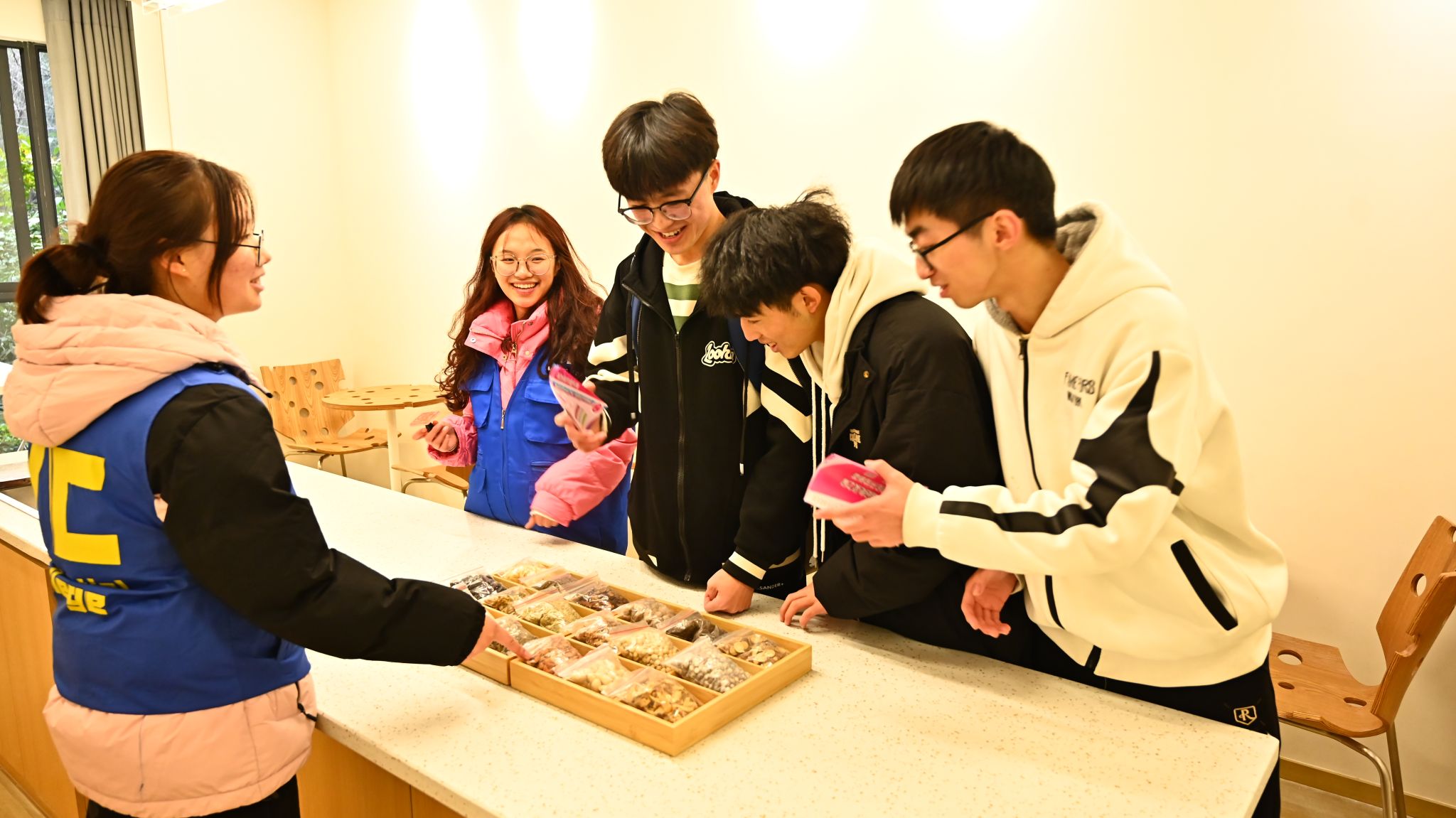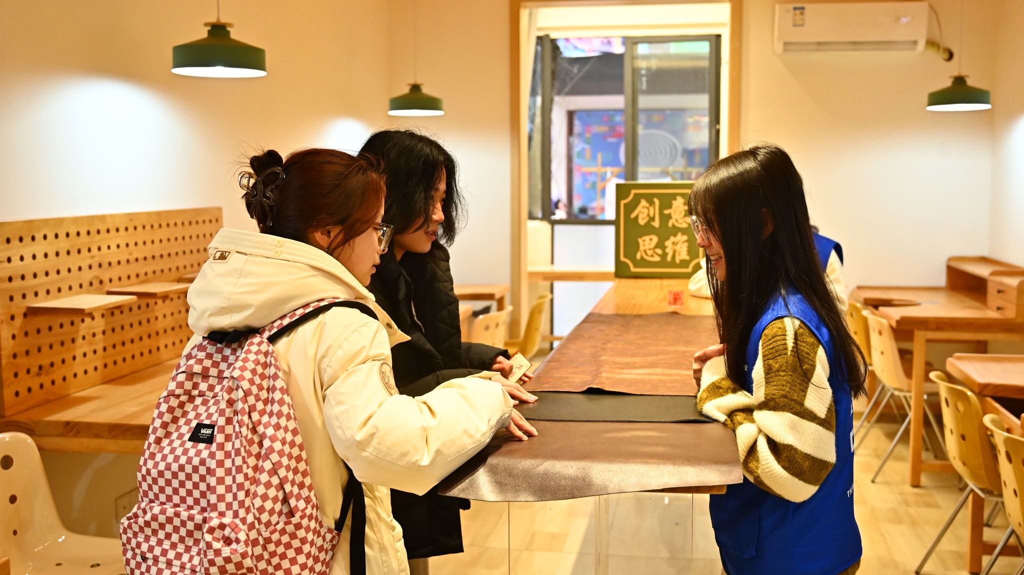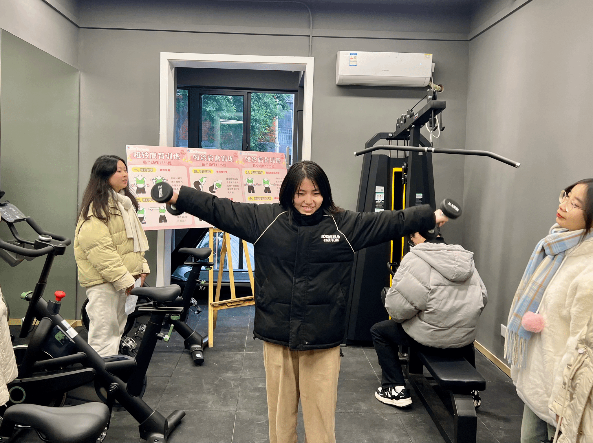 从活力四溢的户外天地踏入极简温馨的室内空间,感受室内“冬藏万物”主题精彩互动体验;“情比GYM肩”——双氧健身房里,同学们挑战哑铃练背,体验健身的乐趣,促进良好锻炼习惯;只说“食”话——冷餐厨房里,师生们一起探索中药材的奥秘,根据定制 “中国药材图” ,山东、山西、重庆“中药地图”了解不同产地中药材名称及功效,普及中药知识,传承传统文化;“宪”在行动——普法工作室内,同学们朗读民法典手册段落,增强法律意识,提升法治素养,为鱼城之声传播力量;小菜一盘——飞盘主题屋里,则通过打倒“负面情绪”飞盘保龄球体验,帮助同学们释放坏情绪,飞出新高度,盘出完满未来;“国朝生活,艺术家养生”——妙手回春,邀请专业的按摩师通过手法按摩,缓解学生们的肌肉紧张,在情绪花园放松身心;寻找大咖——香氛书房内同学们选择信息产业大咖推荐书籍阅读并写下读后感言,与知识进行深度对话;以手造物——项目工作室内同学们识别各类皮具材质,提升对传统工艺的鉴赏能力。