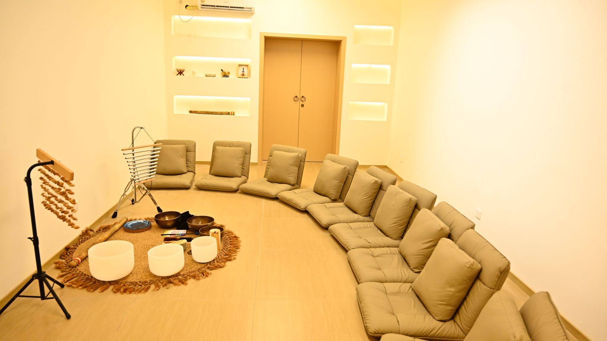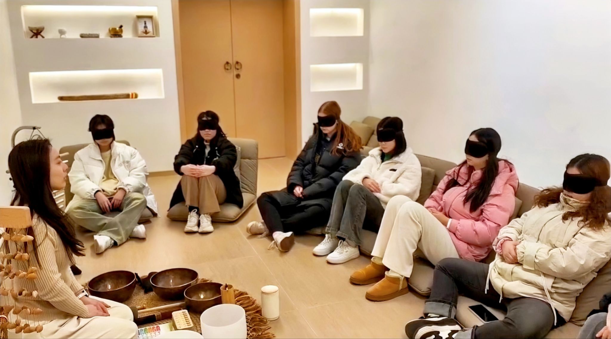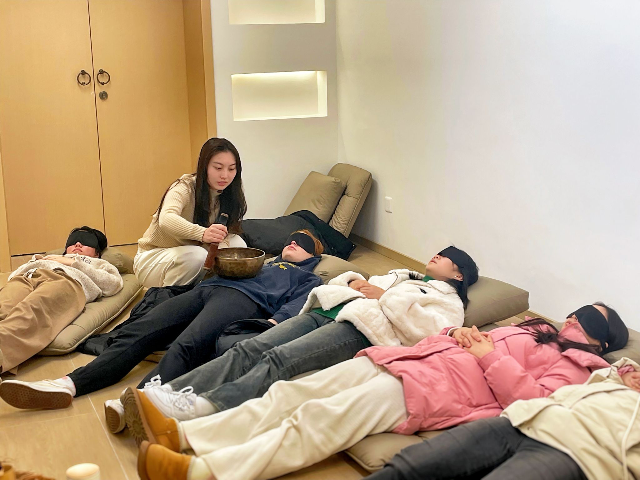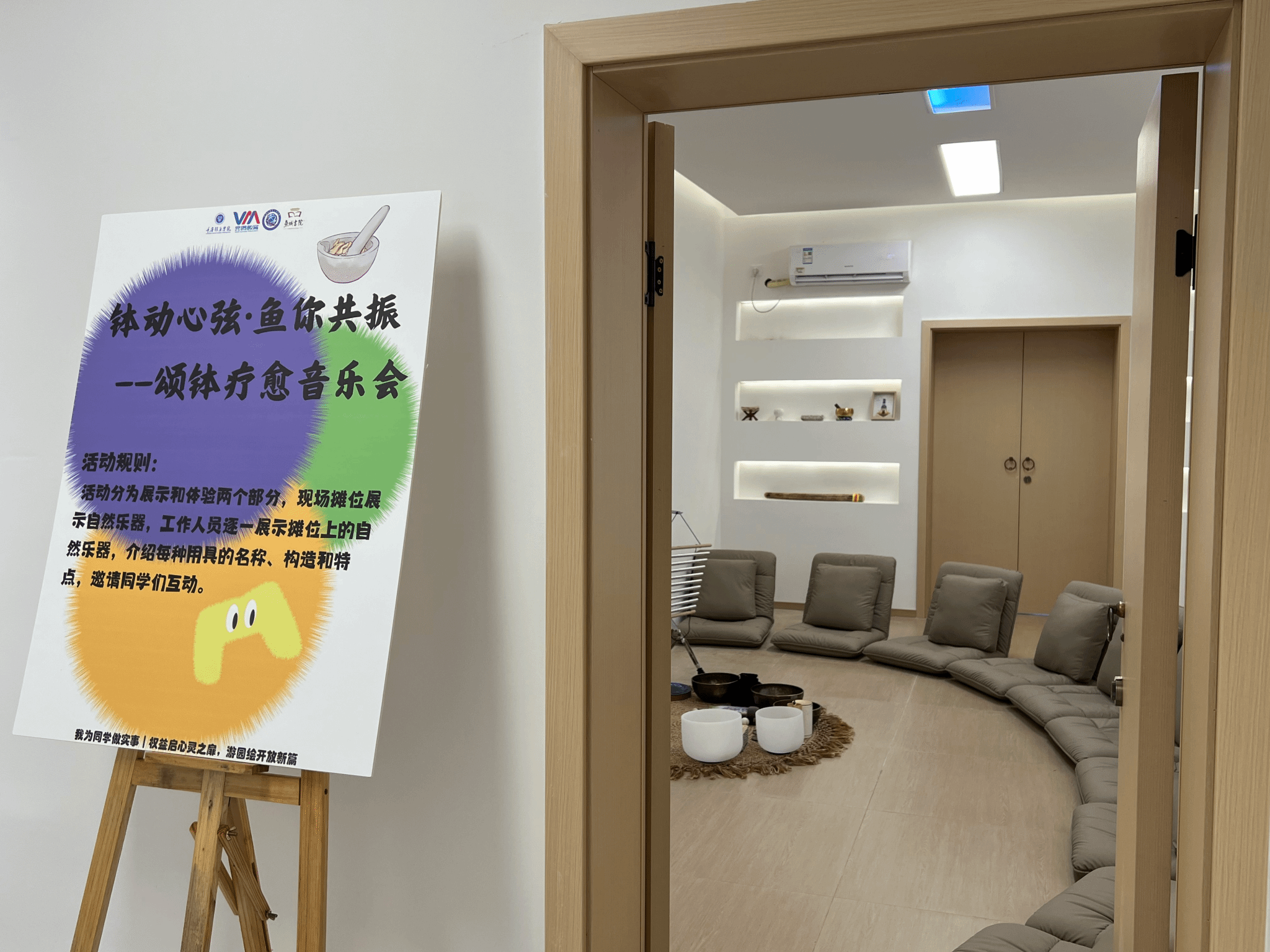 冥想小屋内,宁静致远方,空气中弥漫着淡淡的熏香,踏入房间让人的身心瞬间放松下来;颂钵疗愈音乐会上,鱼城书院学生发展导师赵晨结合心理学理论、七脉轮能量场,讲解情绪与身体能量的关系,以及颂钵声音如何调节情绪,让书院学子们倾听颂钵、水晶钵、雨棍、果壳、风铃等音声乐器,用心感受每一次钵声的震动,体验音乐疗愈所带来的能量。通过颂钵的震动进行“调身、调息、调心”,有助于疏通脉络,调节情绪、舒缓压力、提高睡眠质量。