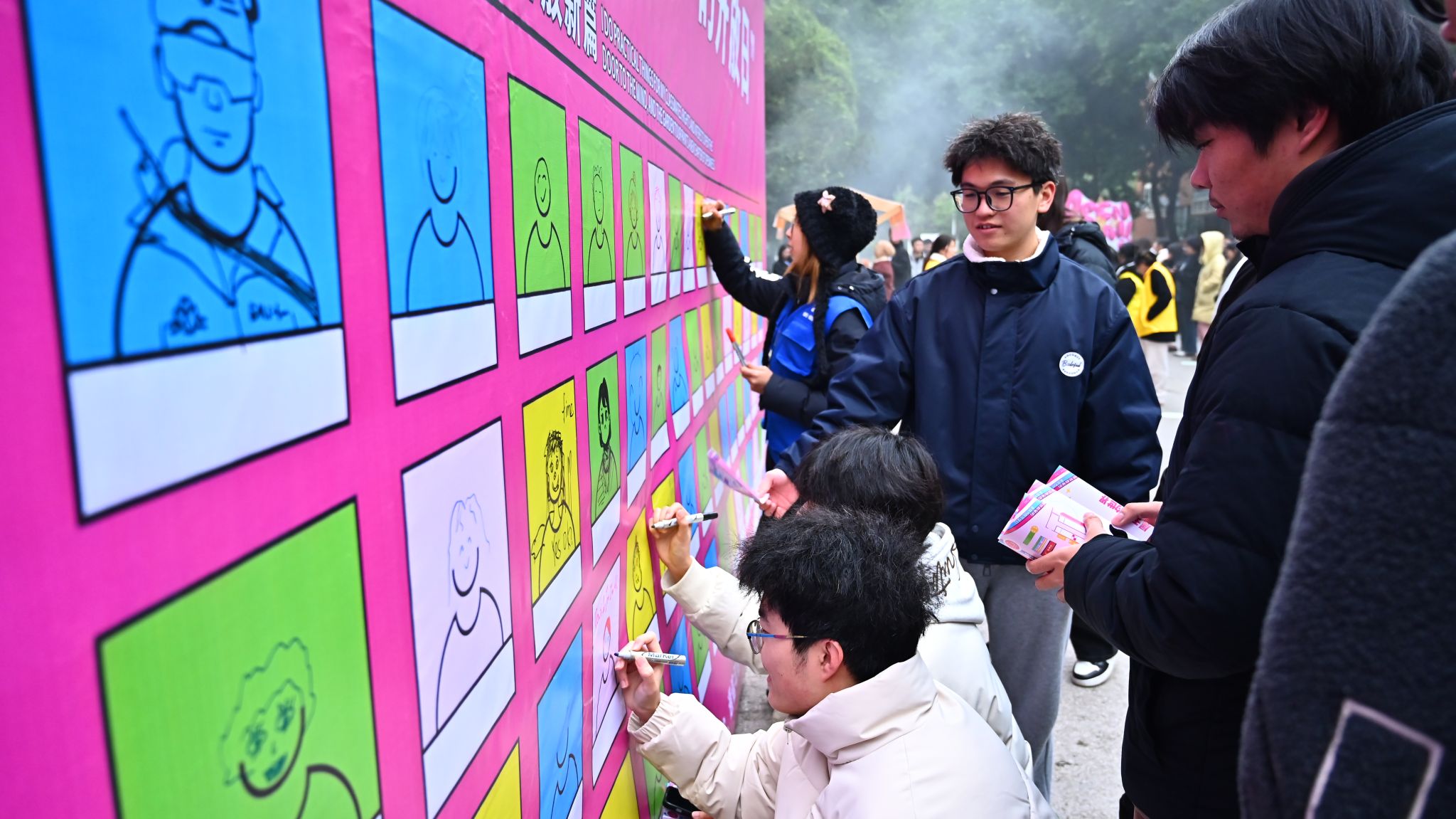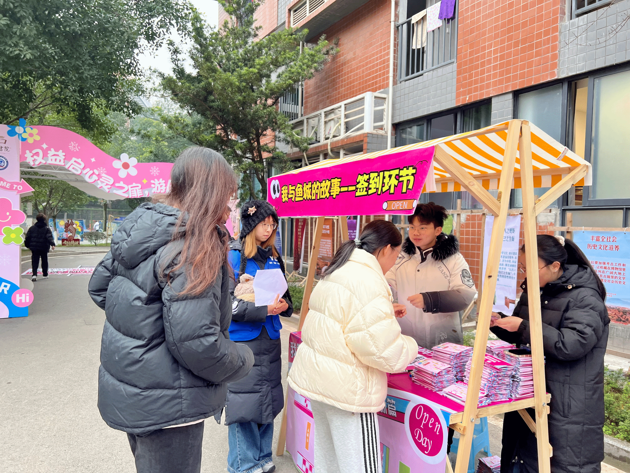 活动伊始,书院学子们纷至沓来,踏过一条入冬播“报”斑马线,进入拱形门,一个个精心布置的活动区域依次映入眼帘。先是领取入院地图集章册,接着进行有趣的“绘制你的专属头像”签到仪式。本次开放日以“怦然心冬的鱼城书院”为主题,分为“室内+户外”两条线,以“权益精灵游园会”、“师生同打八段锦”、“冬藏万物蕴”以及“颂钵疗愈音乐会”四大活动板块,打造“入冬九件套”互动体验。