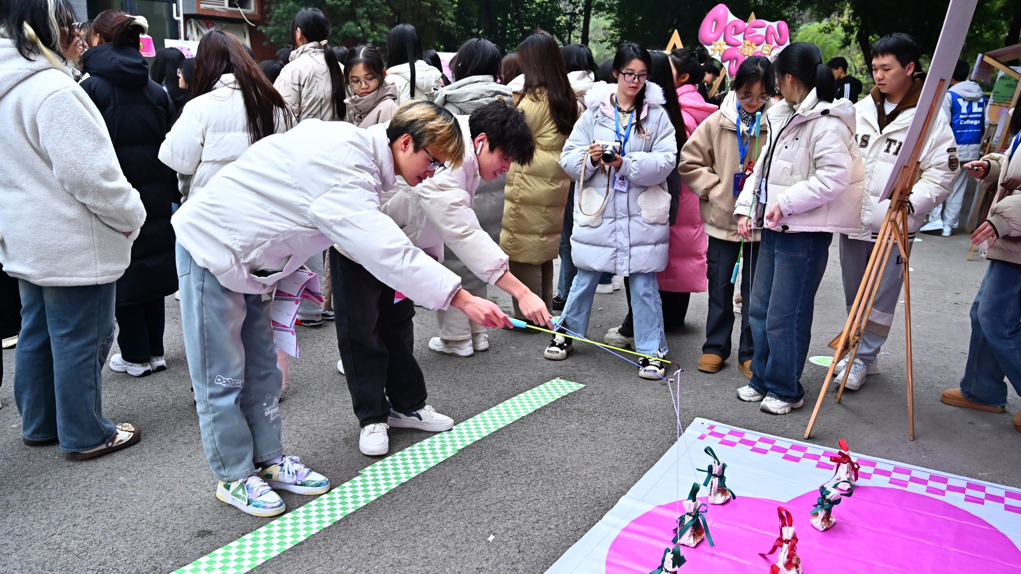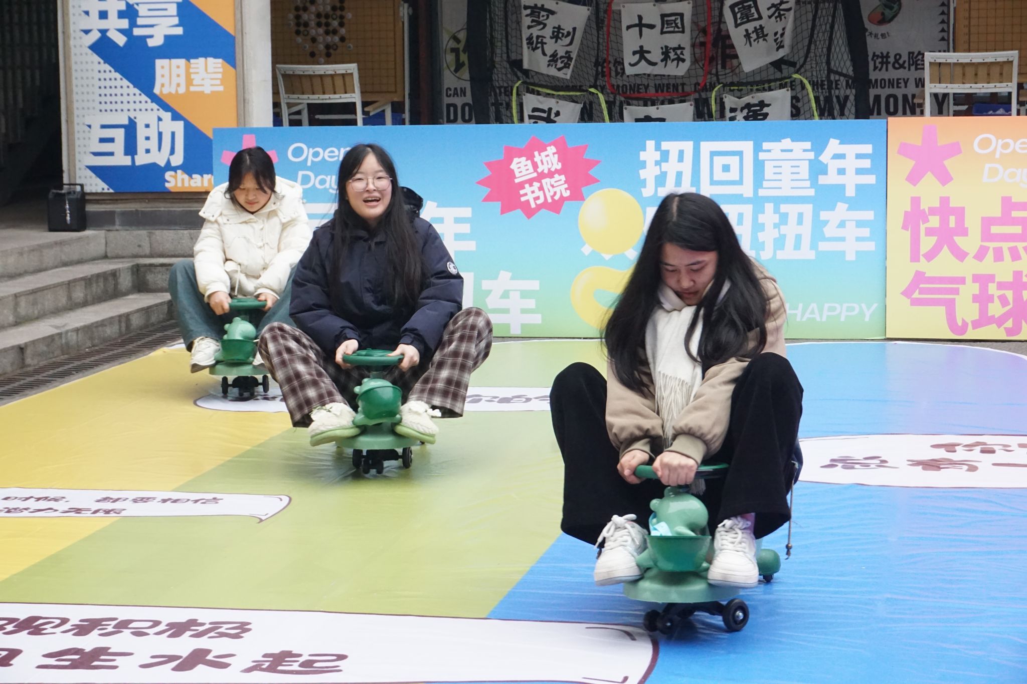 五韵趣味角逐,点燃快乐时光。书院学子们在欢笑中释放压力,传递快乐,感受户外不同互动带来的幸福感;在“风吹‘灵’动——情绪风铃”中,写下自己的困扰或解答他人的疑惑,跟随风铃的轻摇,让心灵得到慰藉;在“快点跑‘鸭’——气球跑跑跑”中考验朋辈互助和团队协作能力;在“爱的抱抱——拥抱通通”环节中,与鱼城书院IP人物“鱼小思”、通信与信息工程学院IP“通小信”来一场轰轰烈烈的拥抱,让爱和温暖充满每一个瞬间,用拥抱传递温暖,营造和谐的书院氛围;在“‘袋’来福气——福气垂钓”活动中,同学们将化身“钓鱼大佬”,用鱼钩钓起满满的福袋,将好运带回家。最后,“‘扭’回童年——欢乐扭扭车”让书院学子们全身心投入其中,不言放弃,在比赛中重拾童年的乐趣,让扭扭车成为连接过去与未来的桥梁,让童年的梦想与快乐,继续照亮书院学子们完满人生之路。