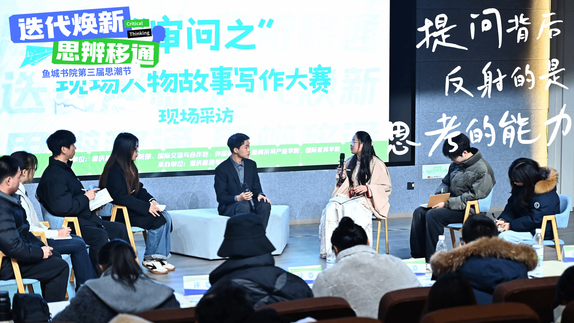 曾经,每一篇通讯、每一张报纸、每一卷胶片、每一频电波都是穿越黑暗的一束光,是文明与历史的存续;现在,每一个提问、每一篇撰稿、每一段视频、每一组数据都是拨开云雾的手,勾勒出真实与鲜活的形象。“审问之”现场采访人物故事写作比赛以《我在书院读大学》项目为蓝本,7名选手现场采访优秀学生代表陈奕博同学,通过三轮问答层层剖析受访者在重庆移通学院特色育人模式下的成长经历,看到关于“完满”的更多定义。受访过程中,陈奕博同学表示:“学校的双创项目为我的就业创业之路提供了专业的指导和丰富的资源,而担任鱼城书院学生自治委员会主席的经历,让我在书院家文化中领悟人情练达的重要性。”