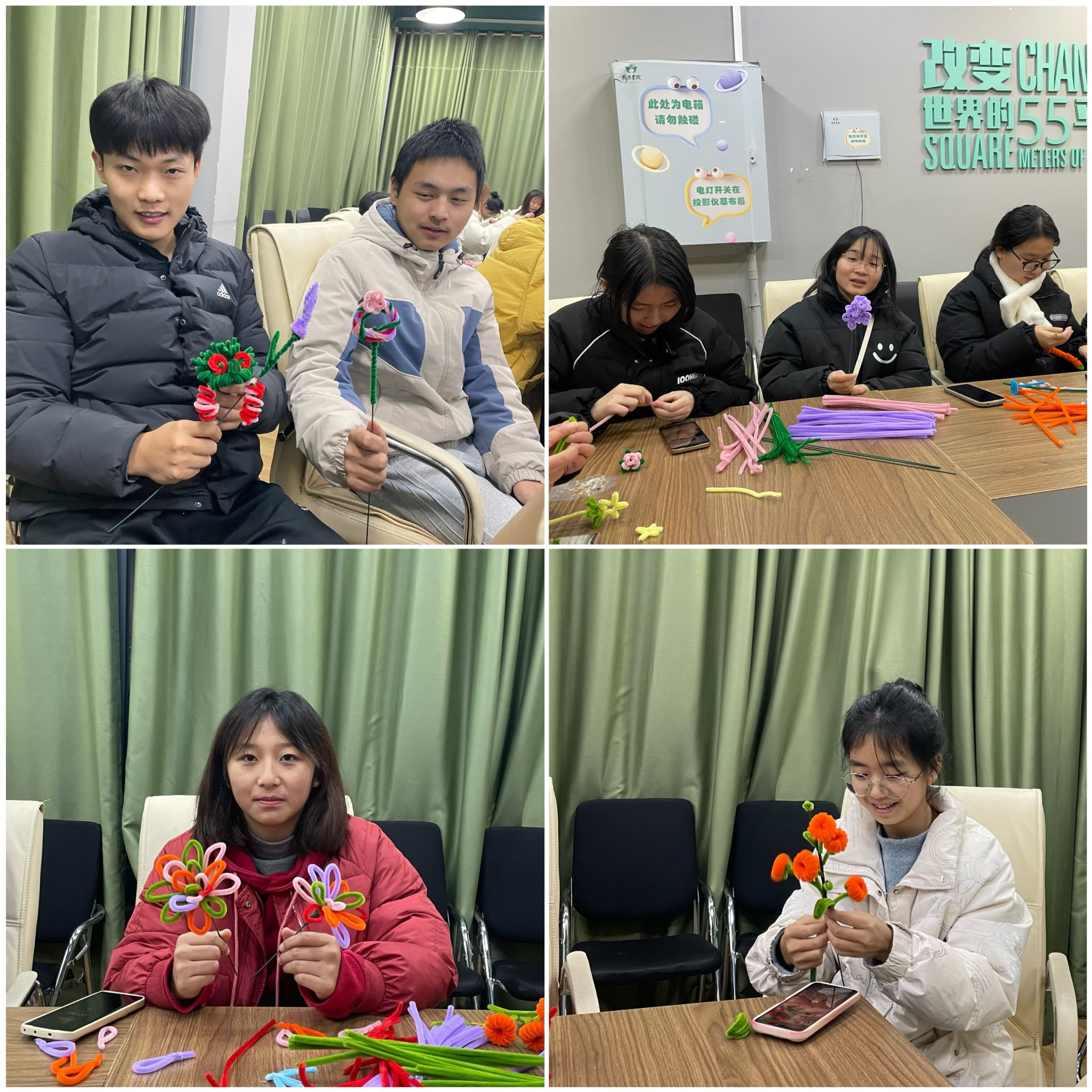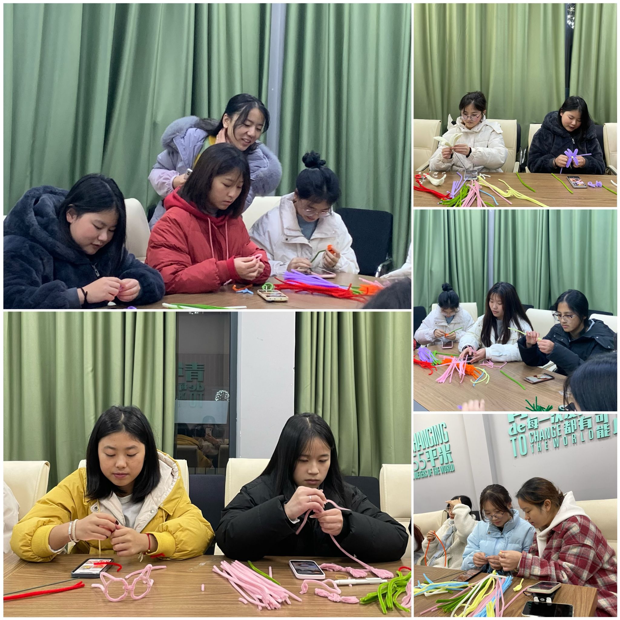 为进一步促进异科师生之间的情谊,激发学生的创新思维潜能,加强班级的团结凝聚力,拓展师生的业余生活体验,廖光燕老师于花果书院大型会议室进行“异科联动,创意绽放”为主题的扭扭棒手工DIY活动。廖老师鼓励同学们尽情挥洒想象力与创造力,将内心丰富的奇思妙想巧妙转化为手中独特而生动的作品,让创意在指尖绽放光彩。随后,各个小组围绕着即将制作的作品类型、选材、配色和步骤,展开了如火如荼且充满热情的讨论。活动中,廖老师不仅为遇到困难的同学们出谋划策,给予专业的建议与指导,更是亲自上阵,与同学们并肩作战于手工DIY的创作之中。五彩斑斓的扭扭棒在师生们手中仿佛被赋予了生命,它们弯曲、缠绕、拼接,创造出一件件独一无二的手工DIY作品,如栩栩如生的柿子、绚烂多彩的郁金香、俏皮可爱的眼镜、精致小巧的戒指、雅致别致的发卡、造型精美的蛋糕等。此次活动不仅加深了师生之间的情感联系,更激发了同学们的创新思维和动手能力。