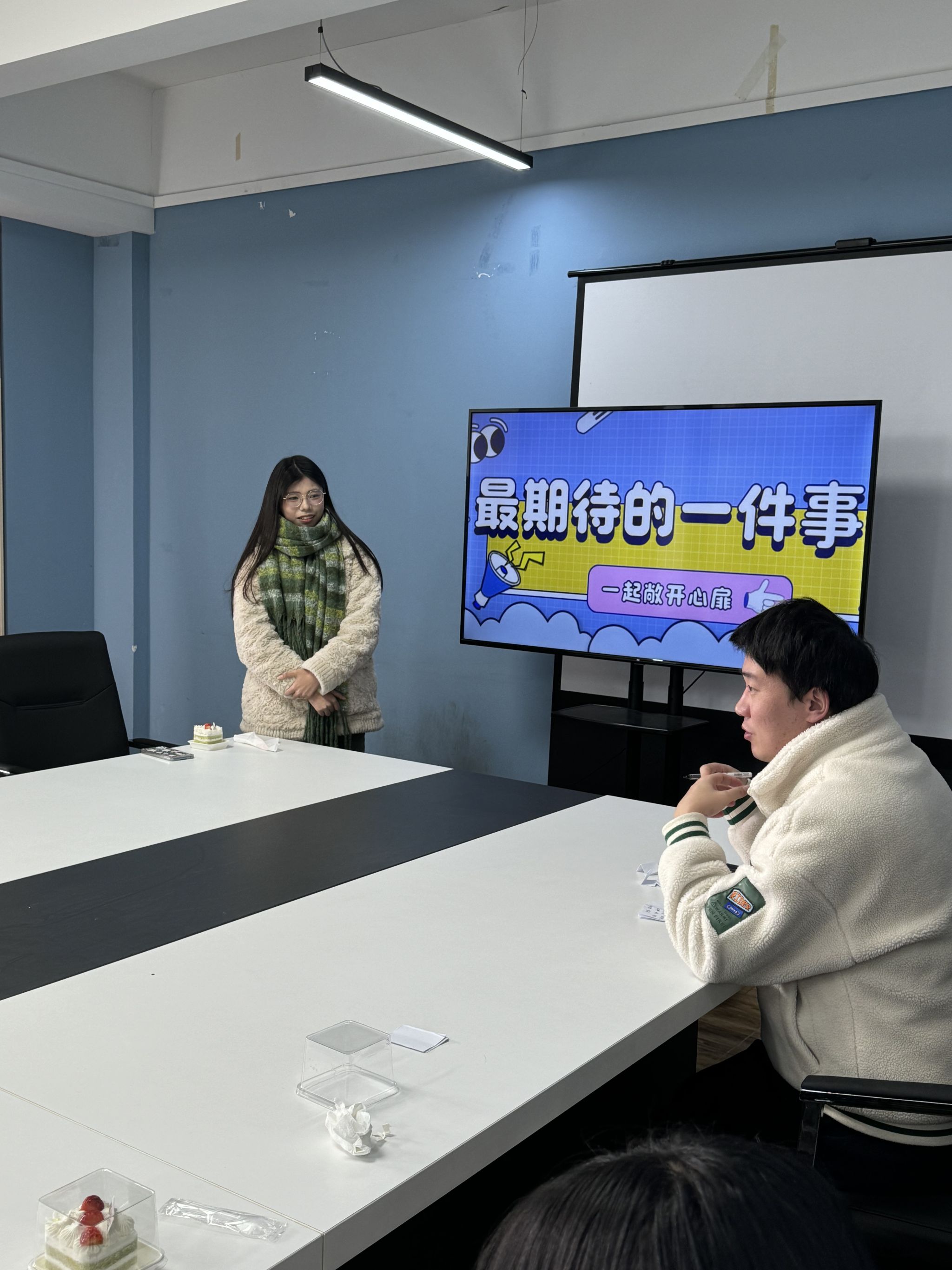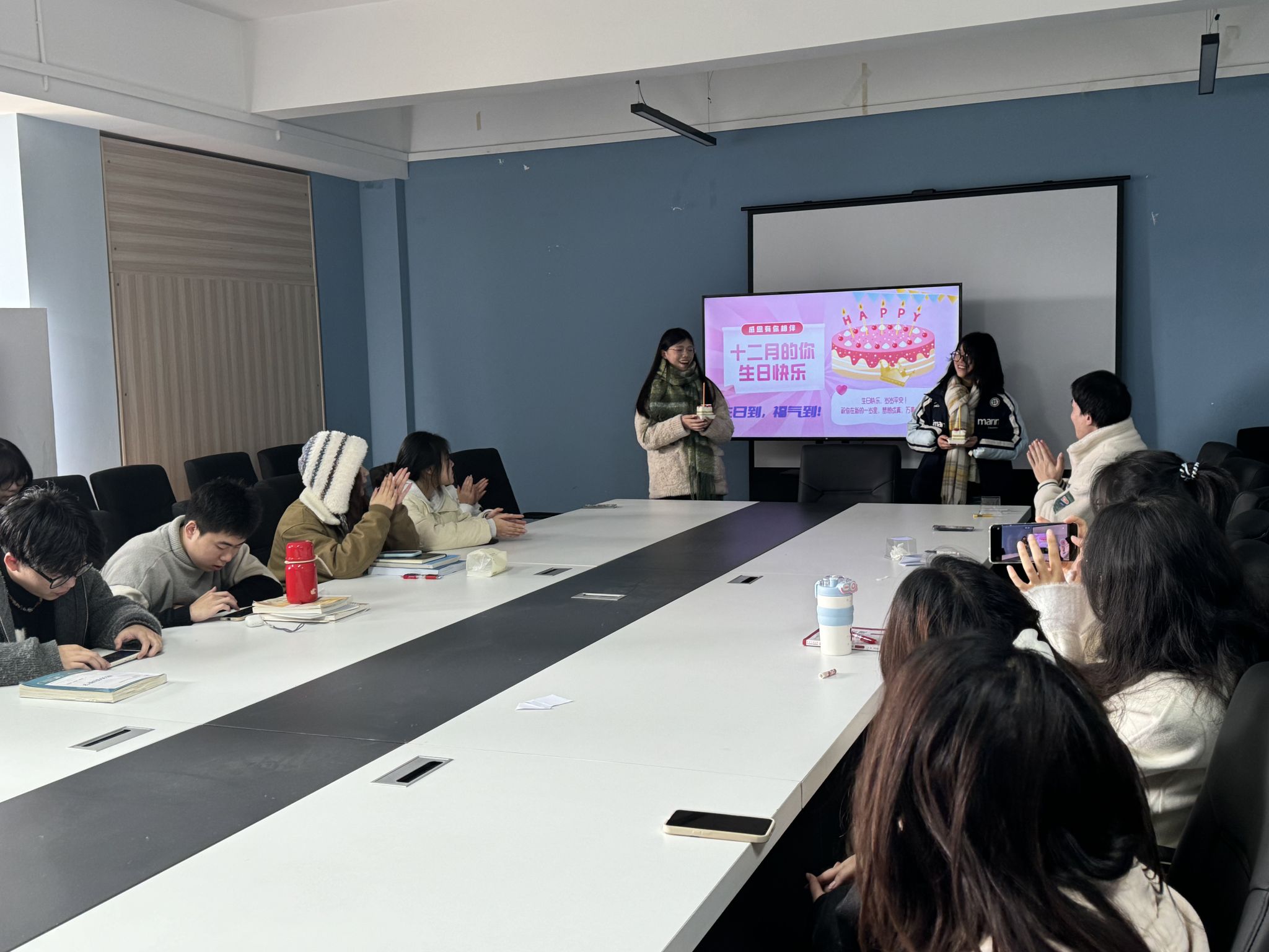 活动一开始,按照惯例,大家先为12月过生日的两位寿星唐杨、卢声容两位同学举行生日祝福互动。当生日快乐的祝福歌声响起,生日蜡烛被点燃的这一刻,两位寿星面带笑容,齐声唱起生日歌,旋律悠扬,洋溢着无尽的欢乐。随着歌声渐渐落下,寿星们闭上双眼,双手合十,心中默默许下对未来的美好愿望,那一刻,仿佛整个世界都为之静止,只留下最真挚的期盼在空中美妙地萦绕,大家感受着来自异科大家庭的温暖与和谐,更加放松地体验生日的喜悦与幸福,仪式感和幸福感充满着活动现场。