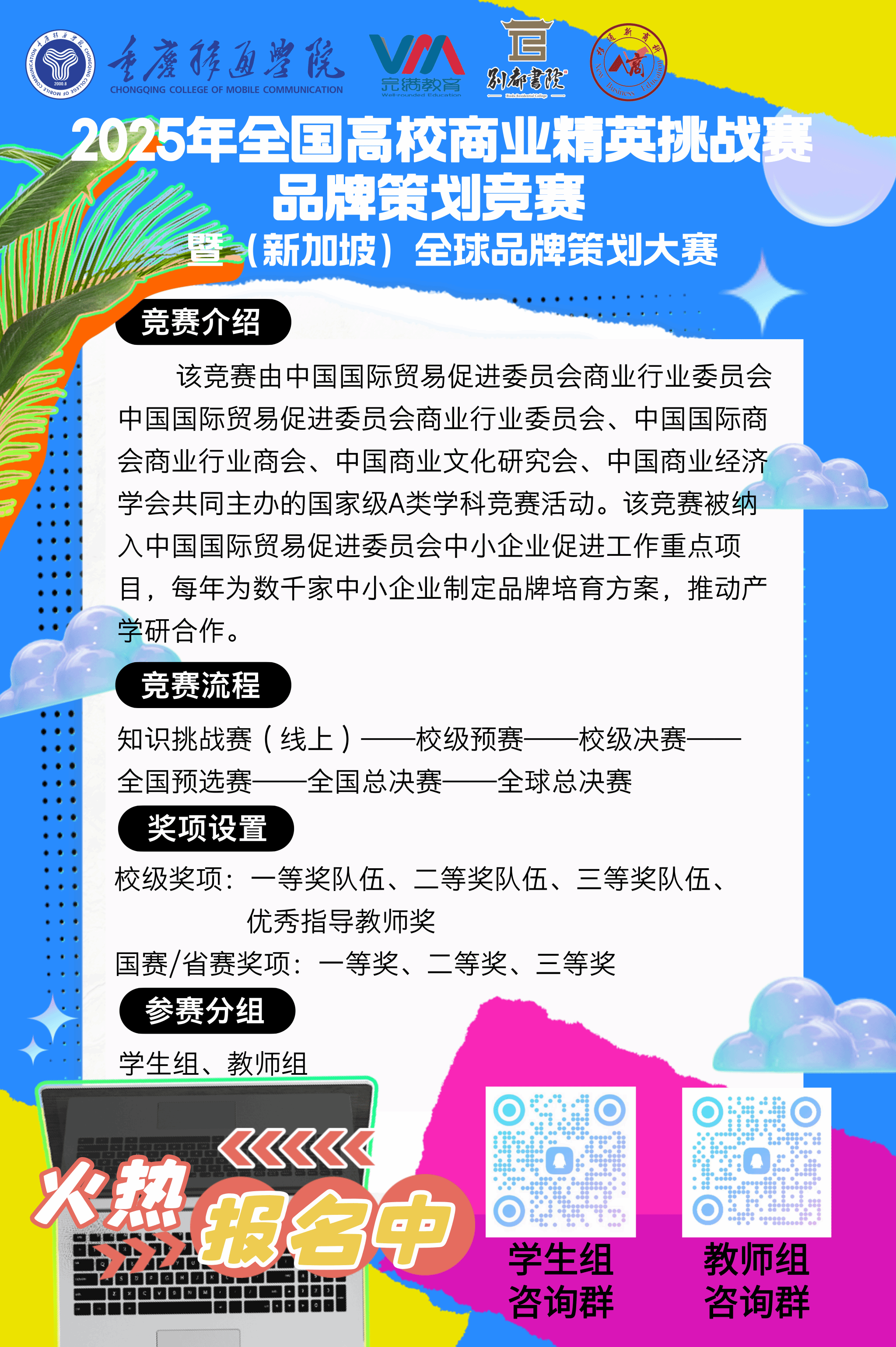 为贯彻落实我校“信息产业商学院”办学定位及“四位一体双院制+特色课程”人才培养模式,培养数字经济时代高情商经营管理人才,由别都书院、新商科教学部商业基础课程教研室联合承办的2025年全国高校商业精英挑战赛品牌策划竞赛暨(新加坡)全球品牌策划大赛校内选拔赛于2024年10月15日正式启动。作为国家级A类学科竞赛,该比赛由中国国际贸易促进委员会商业行业委员会、中国国际商会商业行业商会、中国商业文化研究会、中国商业经济学会共同主办。自2020年以来,我校已成功举办4届该赛事,斩获10个一等奖、14个二等奖及6个三等奖,连续4次荣获“最佳院校组织奖”。2025年,品牌策划大赛再起航,将又一次,为我校师生搭建了风采展示、创新提升的平台,掀起品牌策划的浪潮。