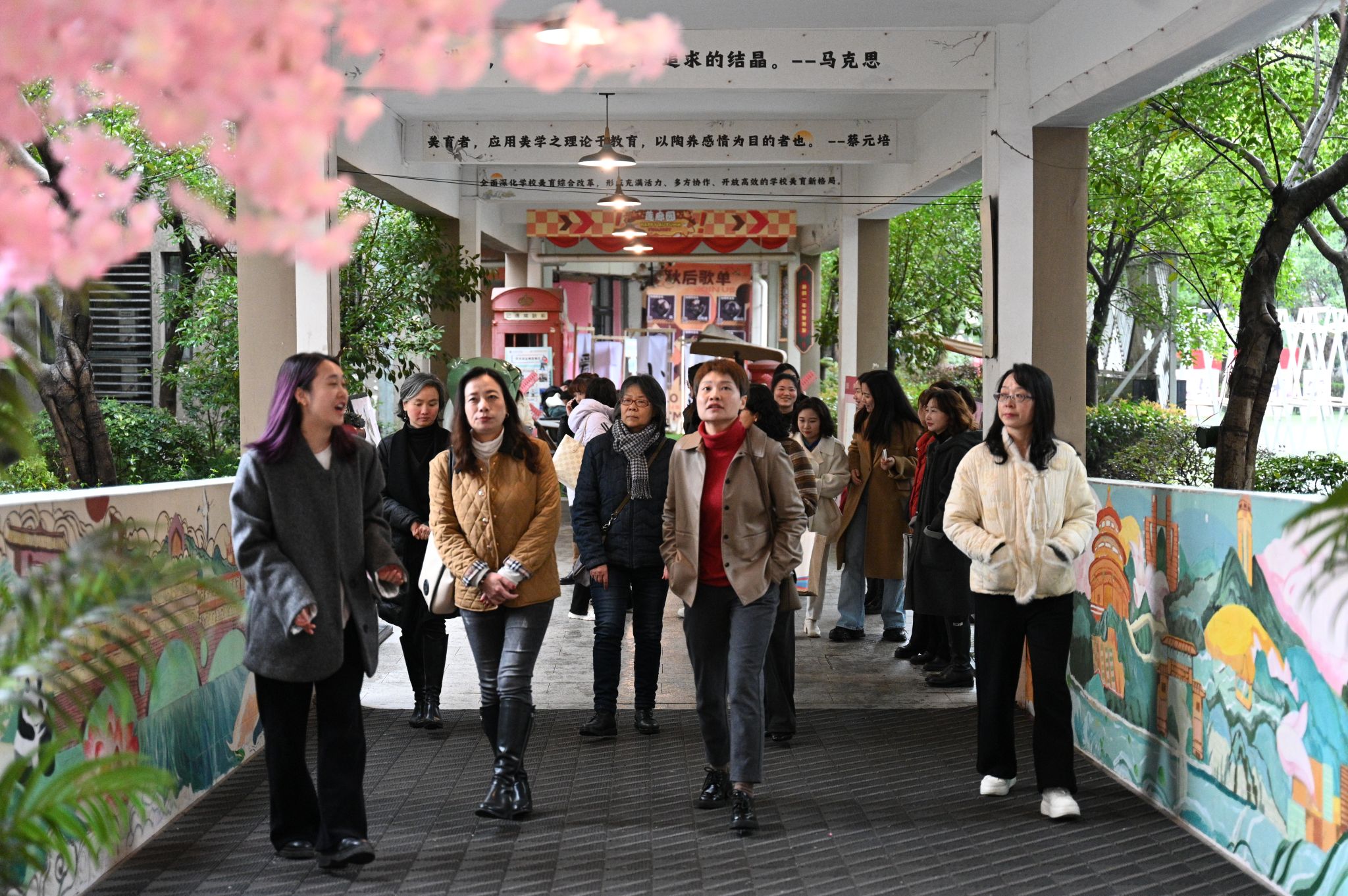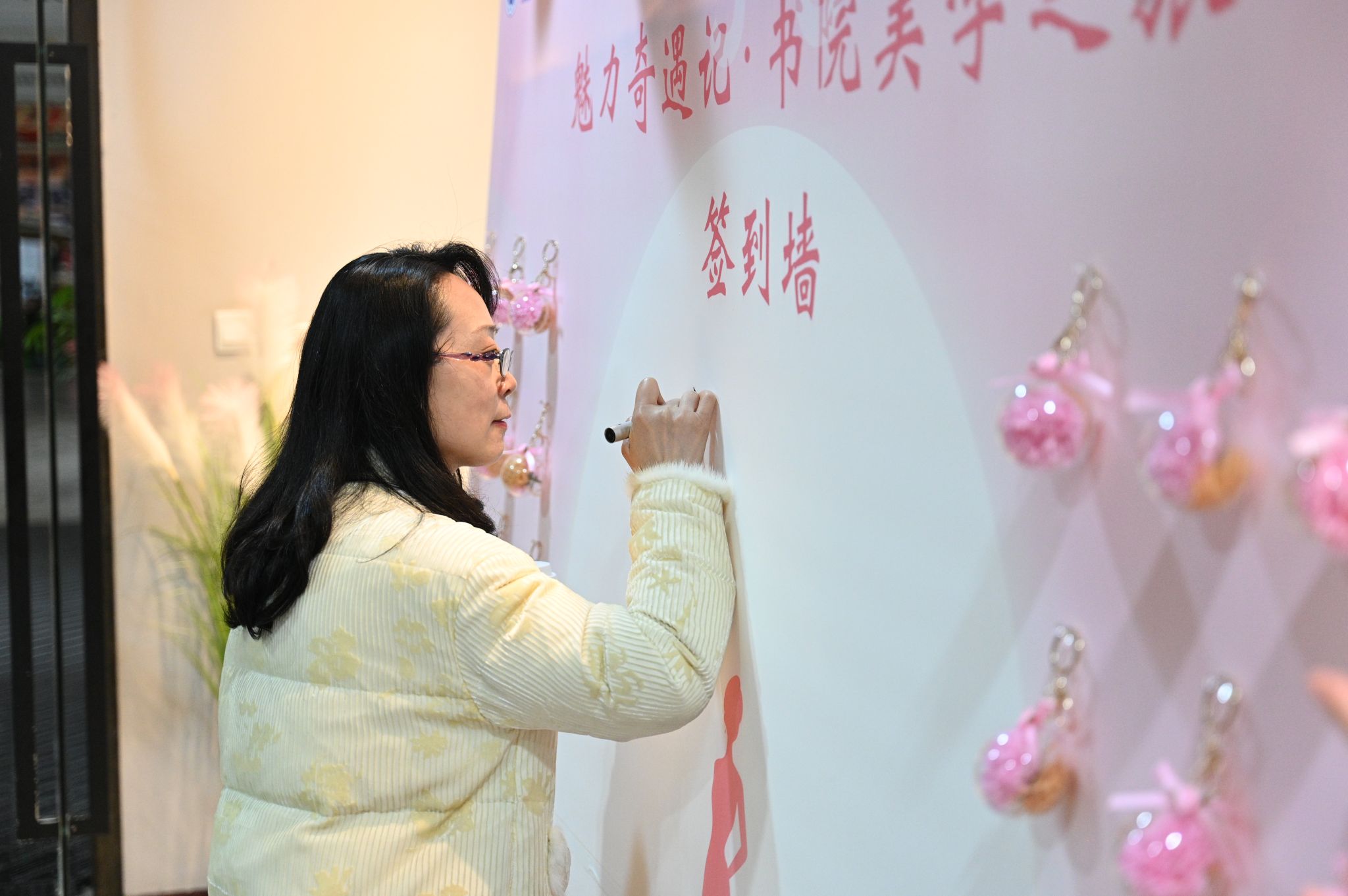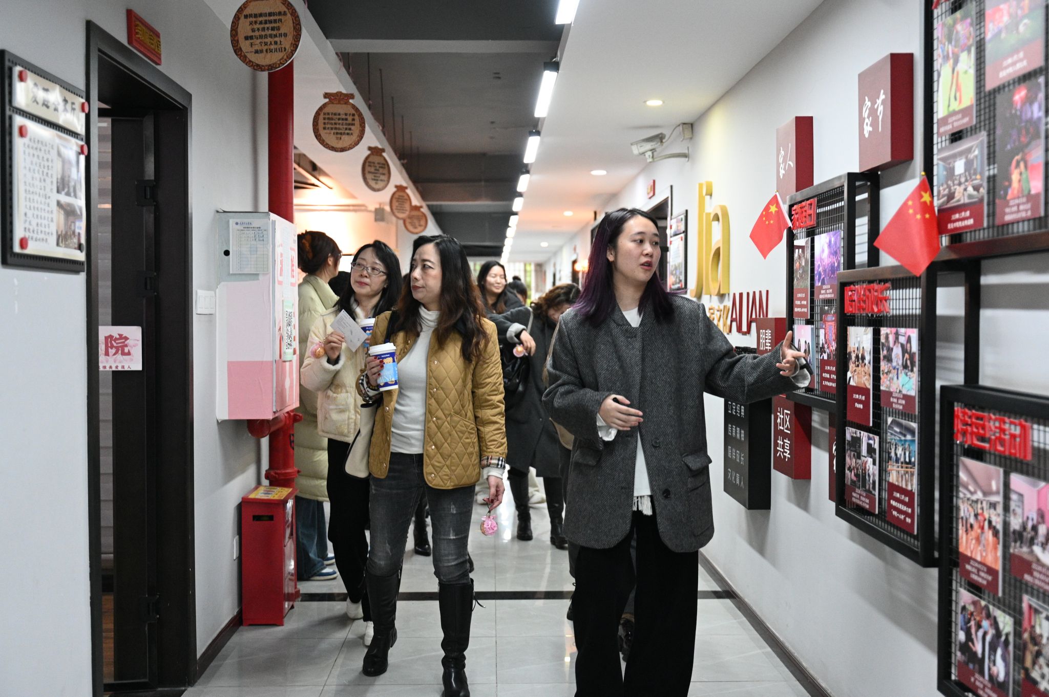 在书院教师团队的陪同下,女职工们深入探访了爱莲书院的文化空间。作为学校书院制改革的标杆社区,爱莲书院以“美育浸润”为核心理念,构建出“生活美学化、美学生活化”的立体育人场域。在美育成果展示区,女职工们驻足欣赏由“浮途文创工坊”出品的十二花神、十二生肖等系列文创作品。爱莲书院综合办公室主任叶芳老师介绍道:“这些作品历经命题创作、团队共创到策展落地的完整流程,真正实现了‘创意孵化-产品转化-价值传递’的育人闭环。”也有嘉宾在参观中指出:“爱莲书院的空间美学极具启发性——从光影交织的沉浸式展厅到承载学生创作的艺术工坊,每个细节都在传递美育理念。这种将课堂延伸至生活场景、让青年成为美学传播者的教育模式,为新时代美育提供了创新样本。”