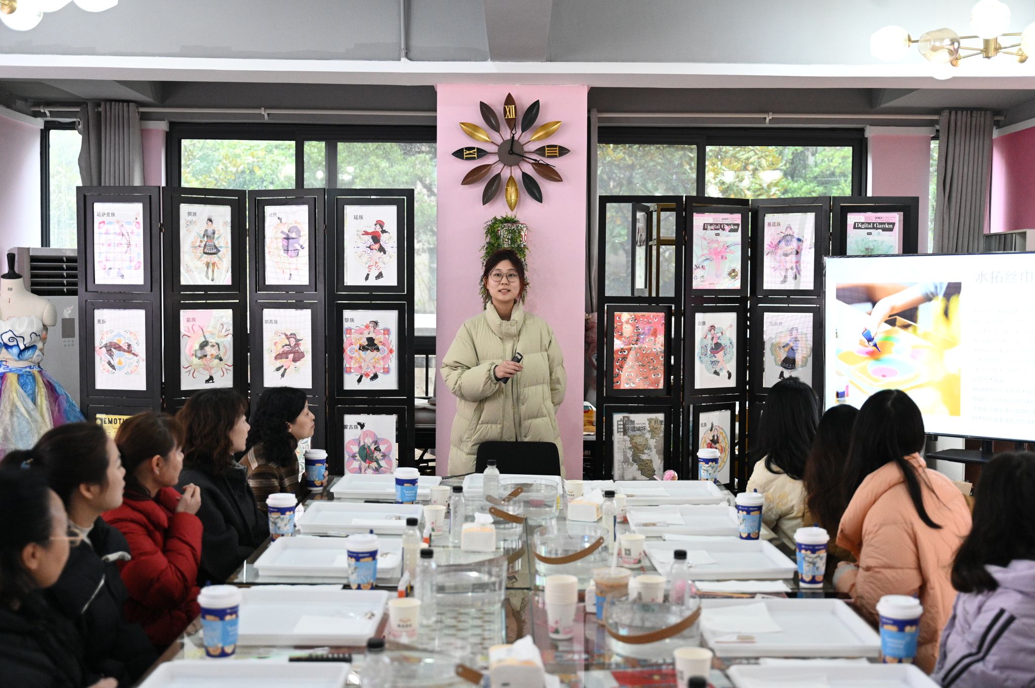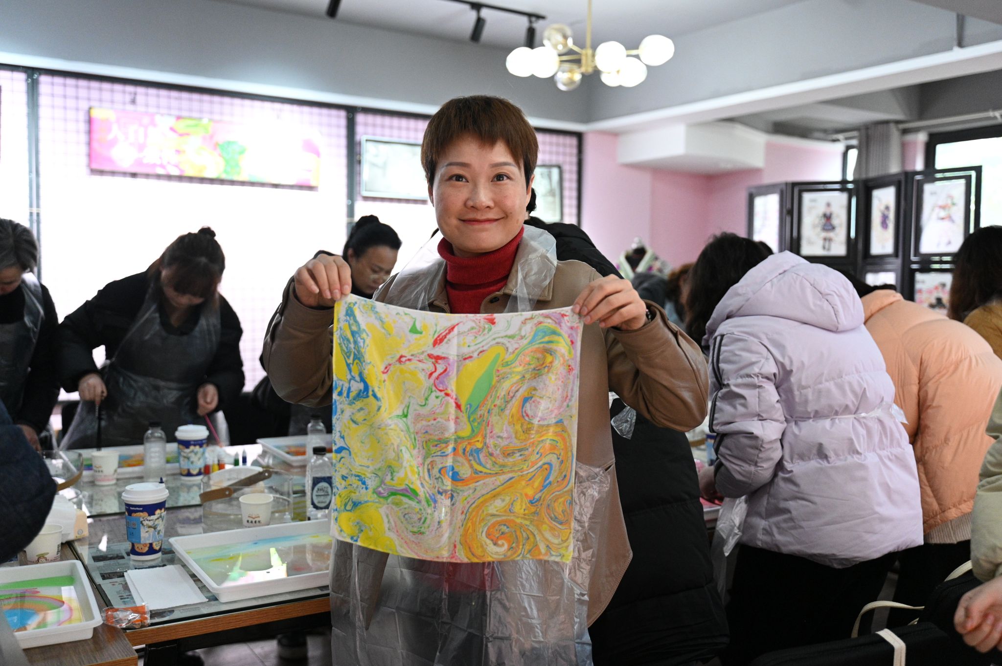“水拓艺术是丝绸之路上‘以水为纸’的浪漫。”在爱莲书院美学空间工坊内,书院发展导师刘晨曦老师从土耳其埃布鲁技艺的颜料悬浮原理,讲到中国水墨意境与丝路美学的融合。女职工们手持画锥,在胶液表面轻点朱红、靛蓝与金箔,随着梳齿划过水面,颜料绽开层层叠叠的涟漪纹路。当丝巾从水中提起时,现场响起阵阵赞叹声。也有女职工表示,非遗技艺的不可复制性,恰如每个女性独一无二的生命之美。