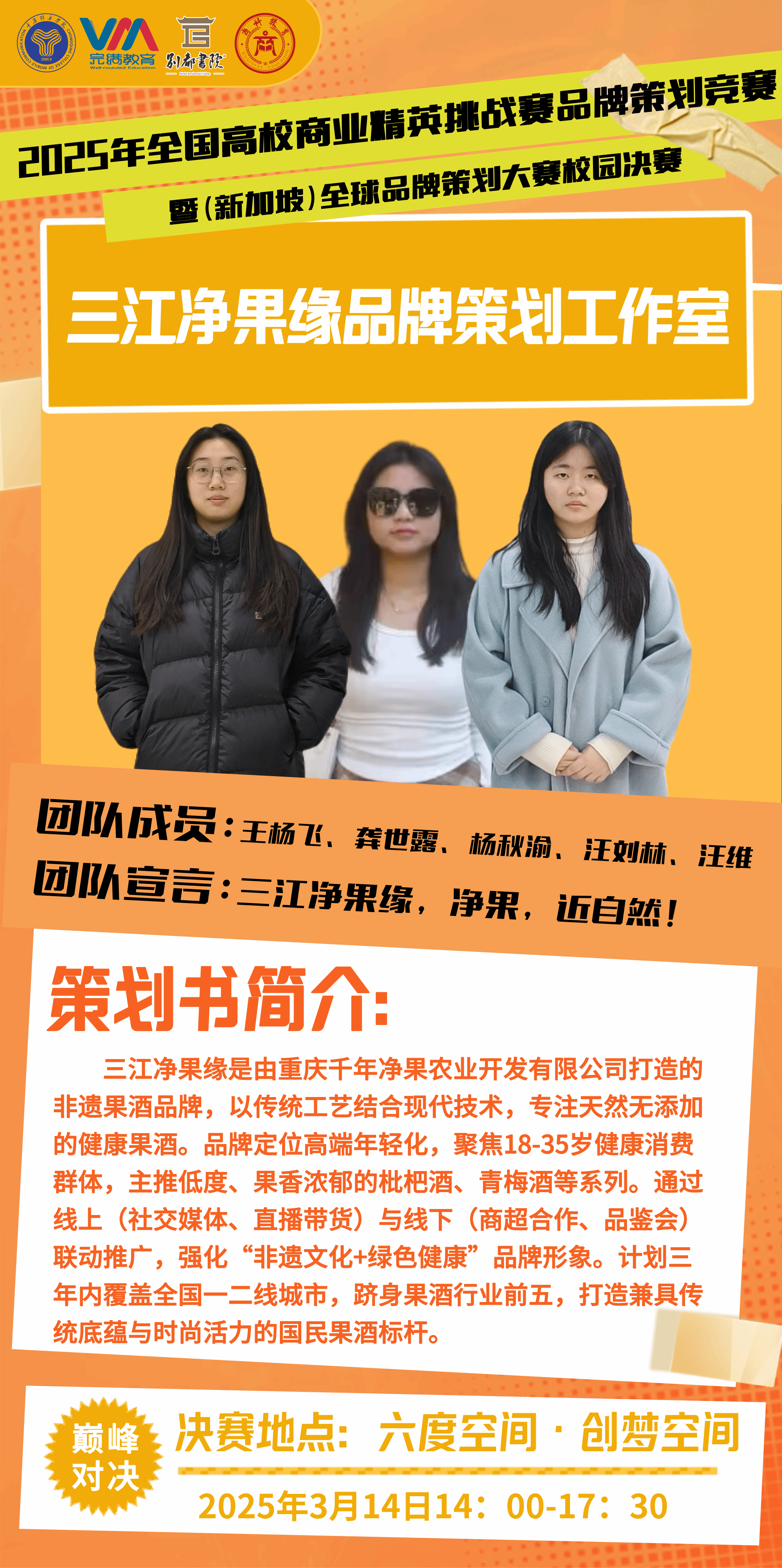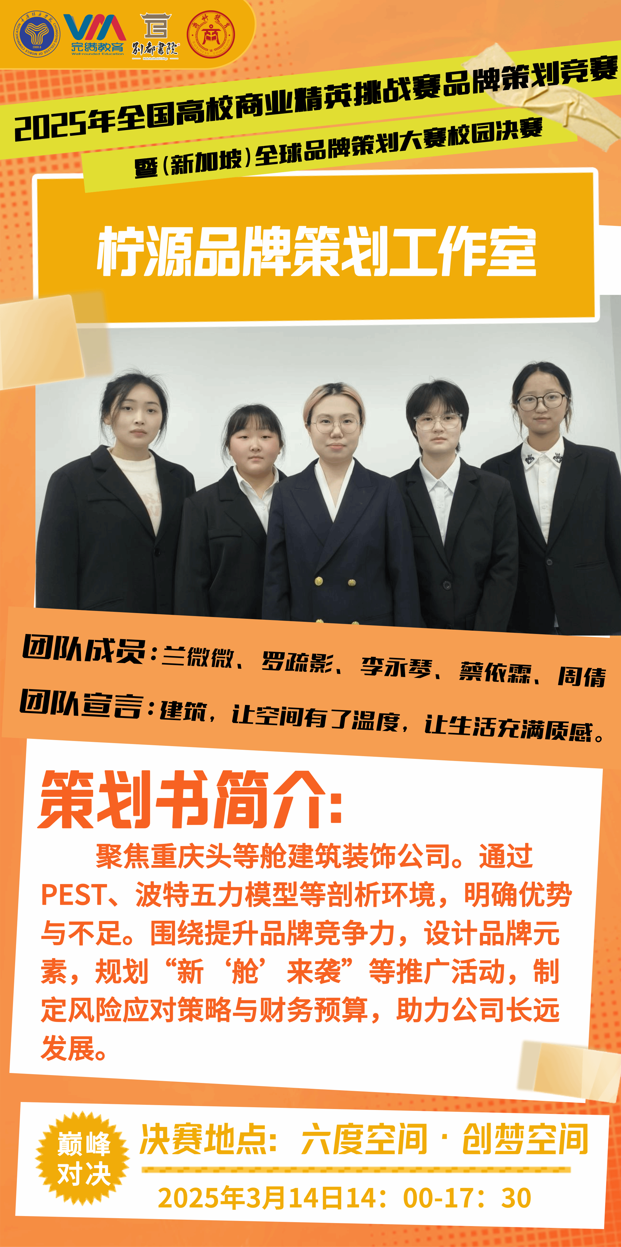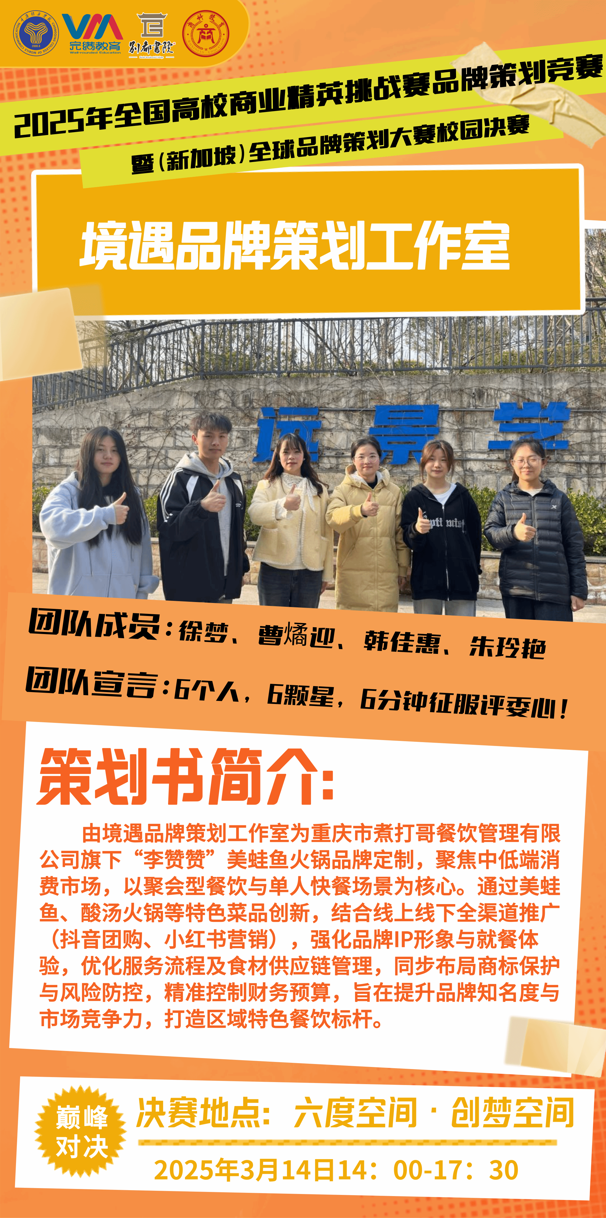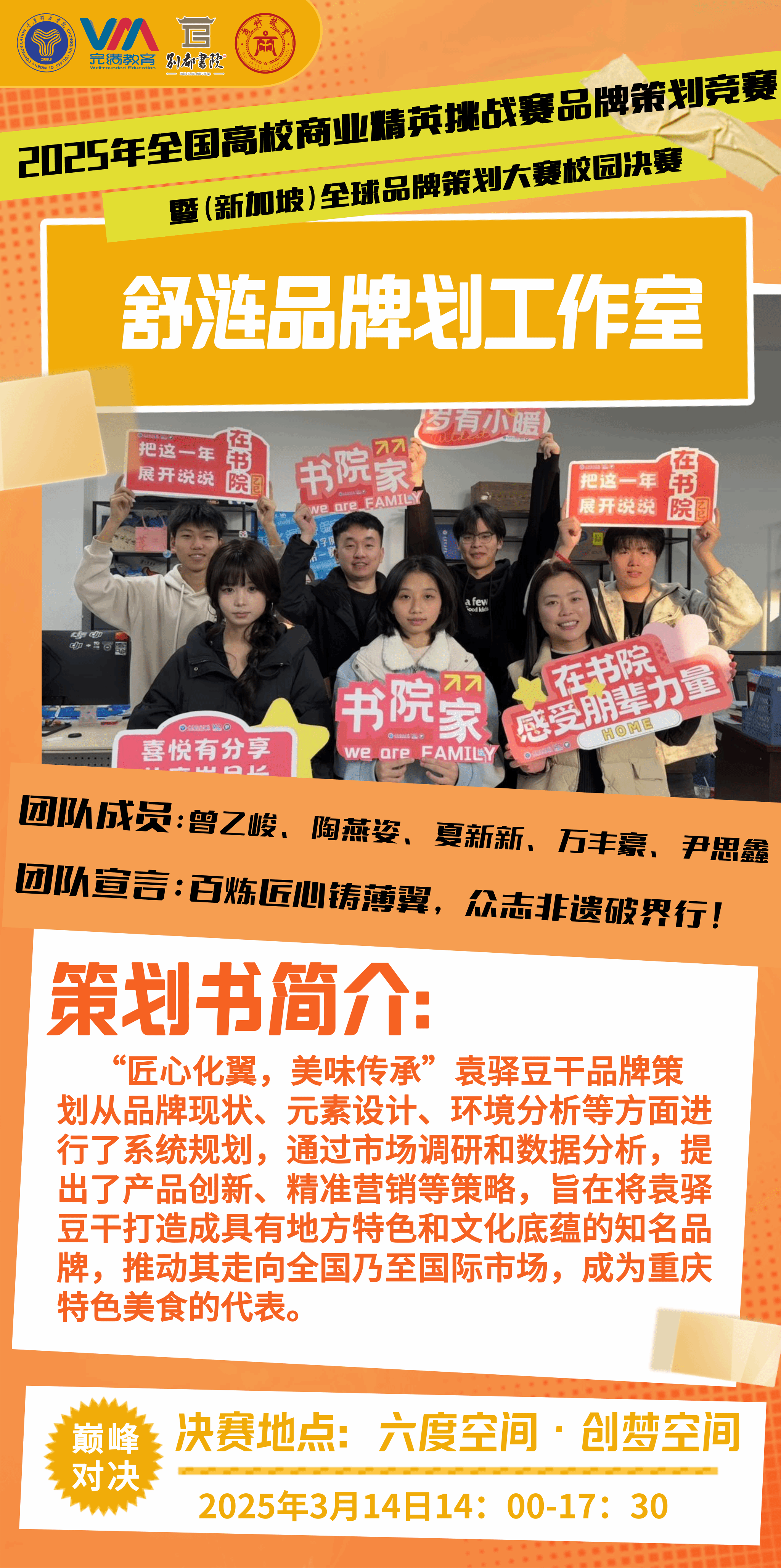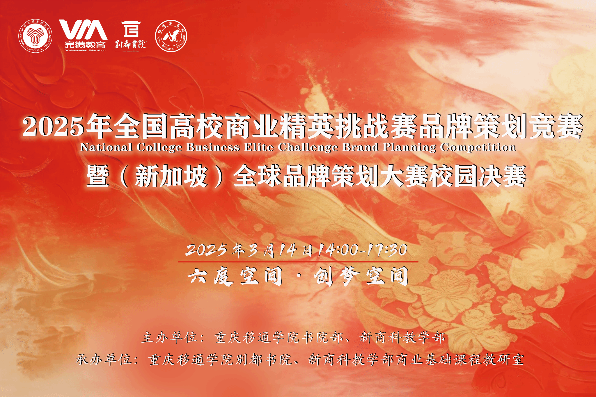 为贯彻落实我校“信息产业商学院”办学定位及“四位一体双院制 +特色课程”人才培养模式,培养数字经济时代高情商经营管理人才,由重庆移通学院别都书院、新商科教学部商业基础课程教研室联合承办的2025年全国高校商业精英挑战赛品牌策划竞赛暨(新加坡)全球品牌策划大赛校内选拔赛决赛将于2025年3月14日14:00在六度空间创梦空间燃爆登场,争夺全国预选赛入场券!