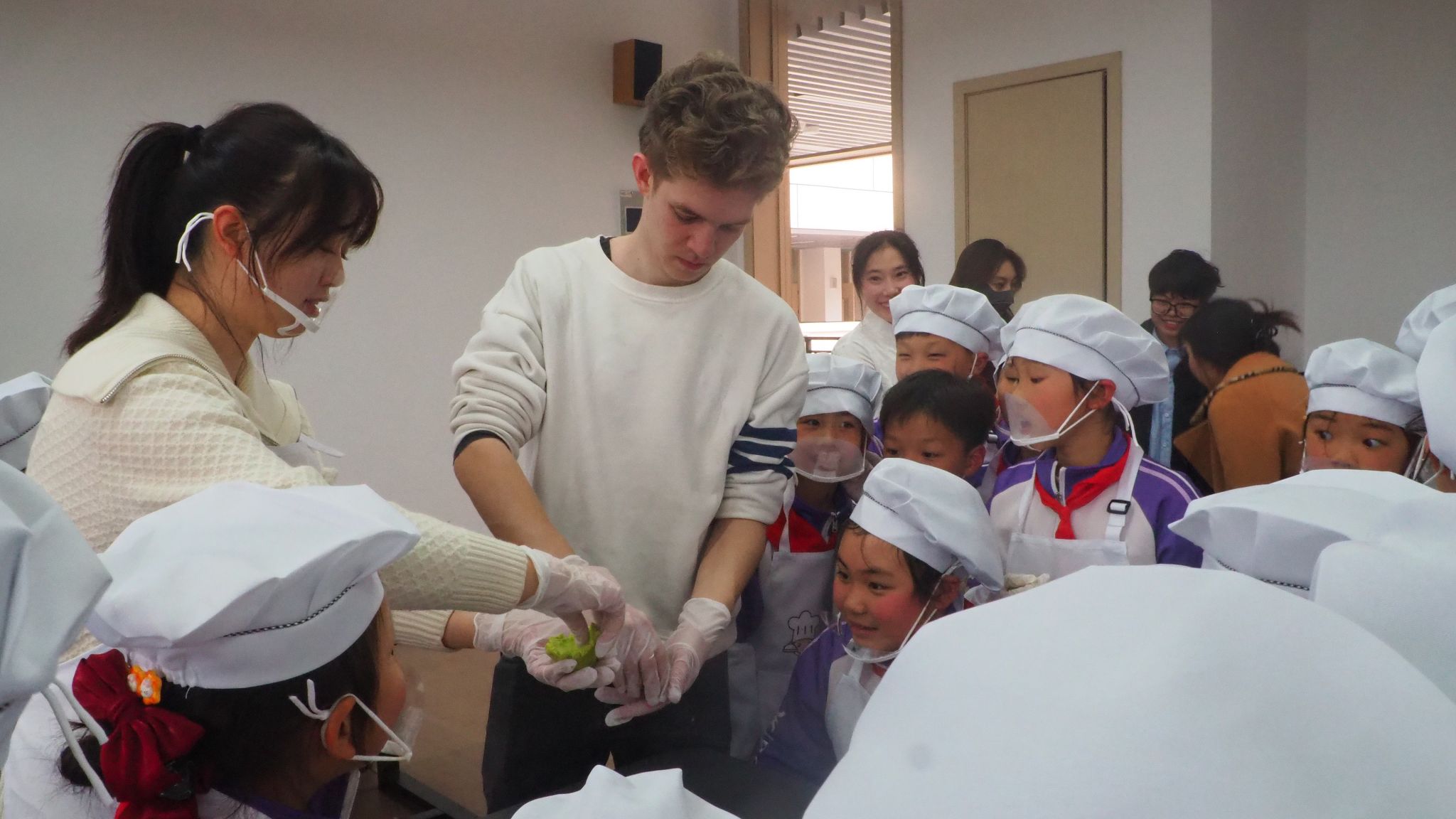 接着,活动转入烘焙教室,鱼城书院师生与三年级学生共同体验了传统美食青团的制作。从揉面、包馅到蒸制,留学生们在动手实践中领略了中国饮食文化的独特智慧。学生发展导师赵晨表示:“食物是文化的载体,青团承载着清明时节的民俗记忆。通过亲手制作,小学生沉浸式体验劳动教育的实践魅力,而留学生不仅能学习技能,更能理解中国人‘以食为天’的文化情怀。”