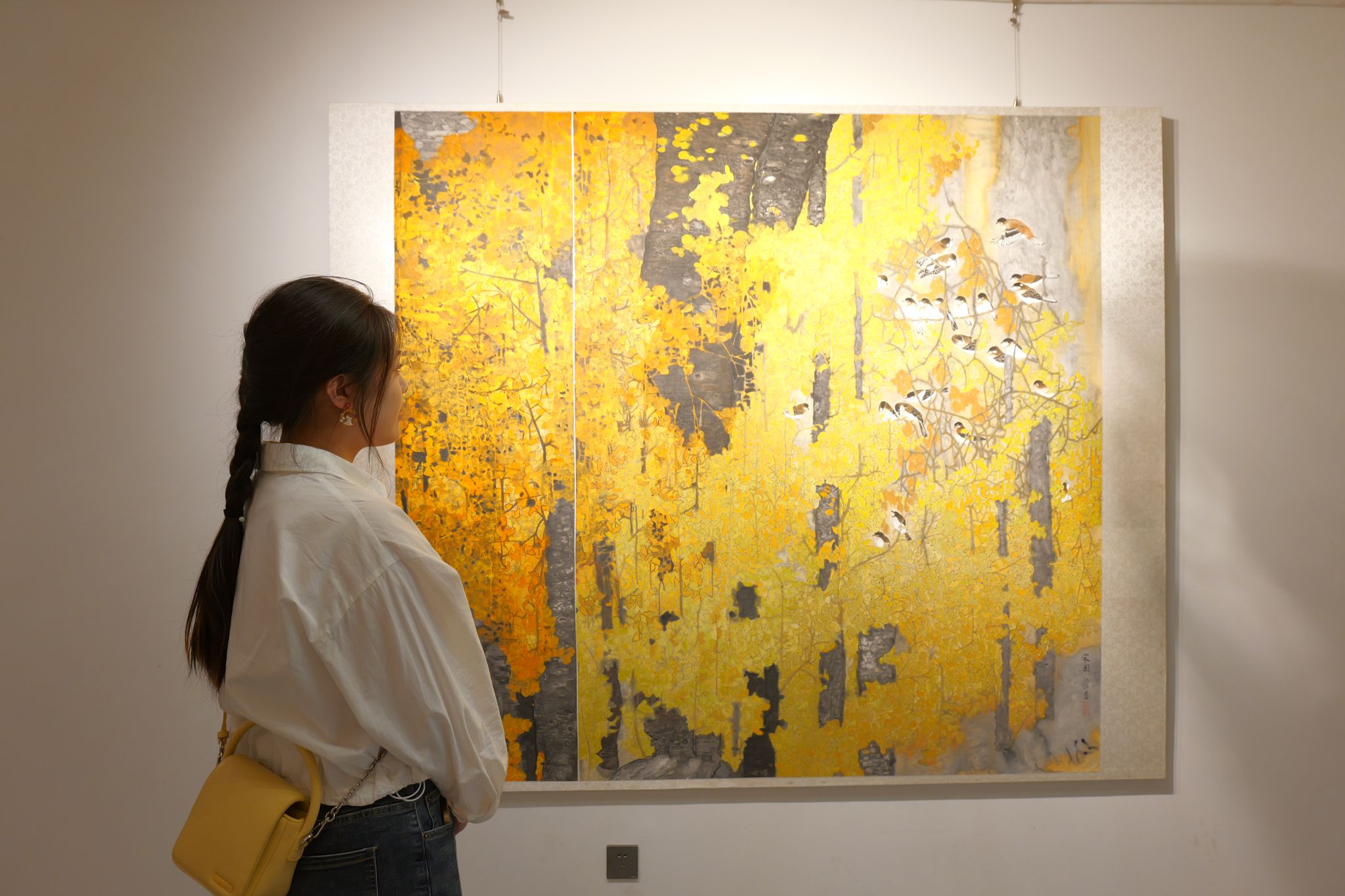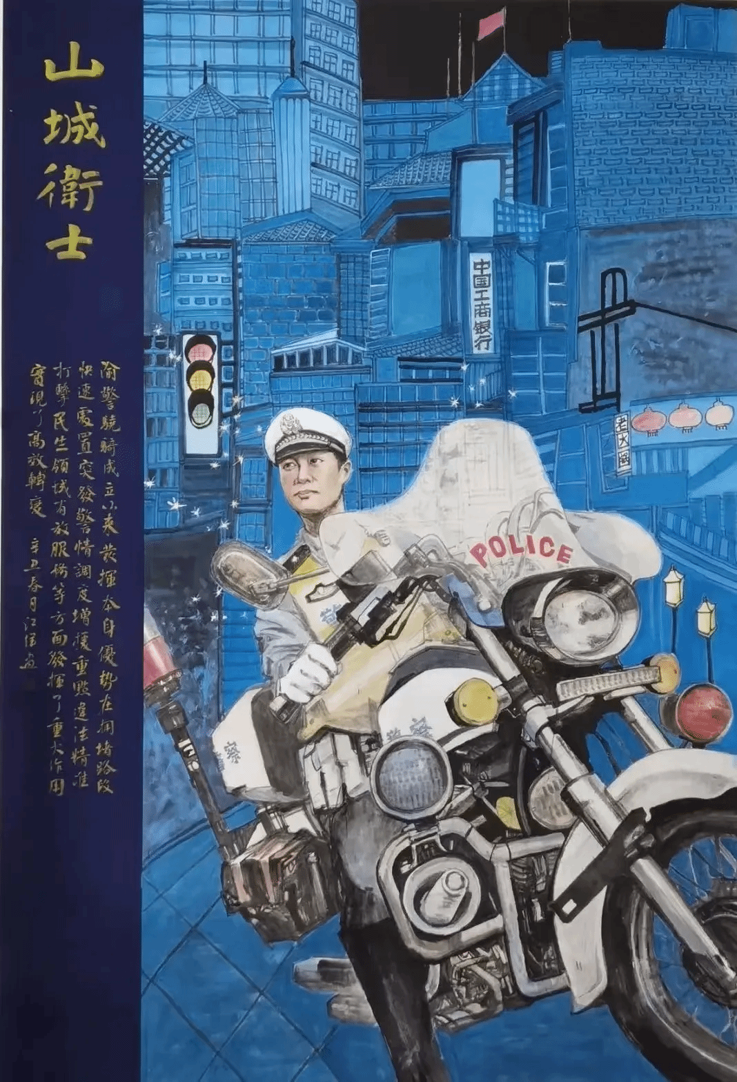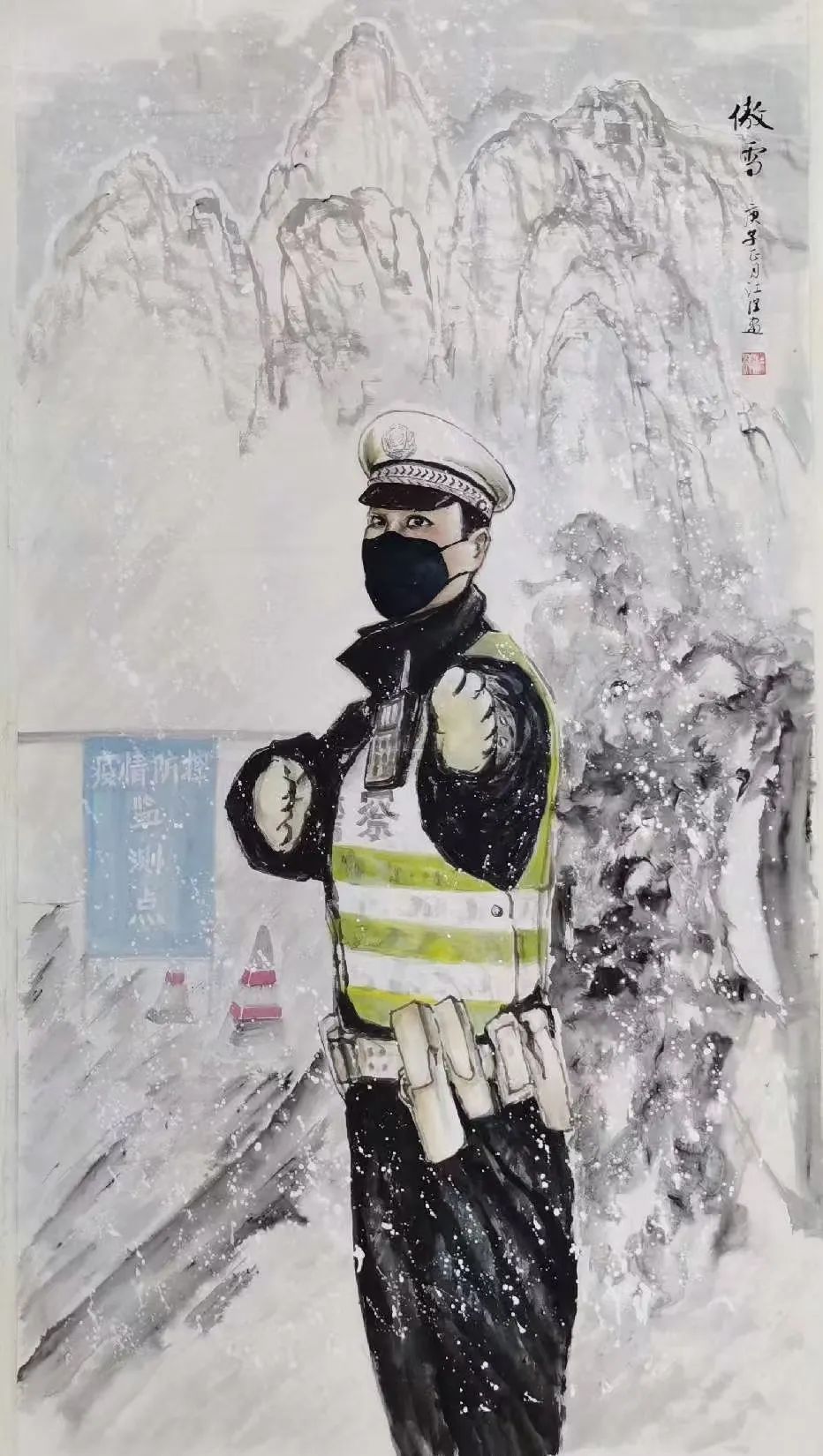 “仿佛能听到这些鸟儿在叫一样”,走进画室,淬炼商学院聂嫒琳的目光就被作品《家园》的大胆用色、骨法笔触、巧妙构图牢牢攫住。在绘画作品中鸟群常常被赋予“人民”的象征意义,看着这幅呼映成趣、色彩鲜明的花鸟作品,她说:“这看起来就很繁华,让人充满了力量和希望。”除画室作品外,江洋院长《岁朝华章》线上画展也在持续开放,作品《山城卫士》凝聚时代精神力量,生动体现渝警骁骑全力以赴做好维护国家政治安全和社会稳定各项工作的决心;《傲雪》画面中交巡警顶风冒雪坚守岗位的场景,体现了基层工作者“负重前行”的担当精神,树立了人民警察无私奉献的“平凡英雄”形象。