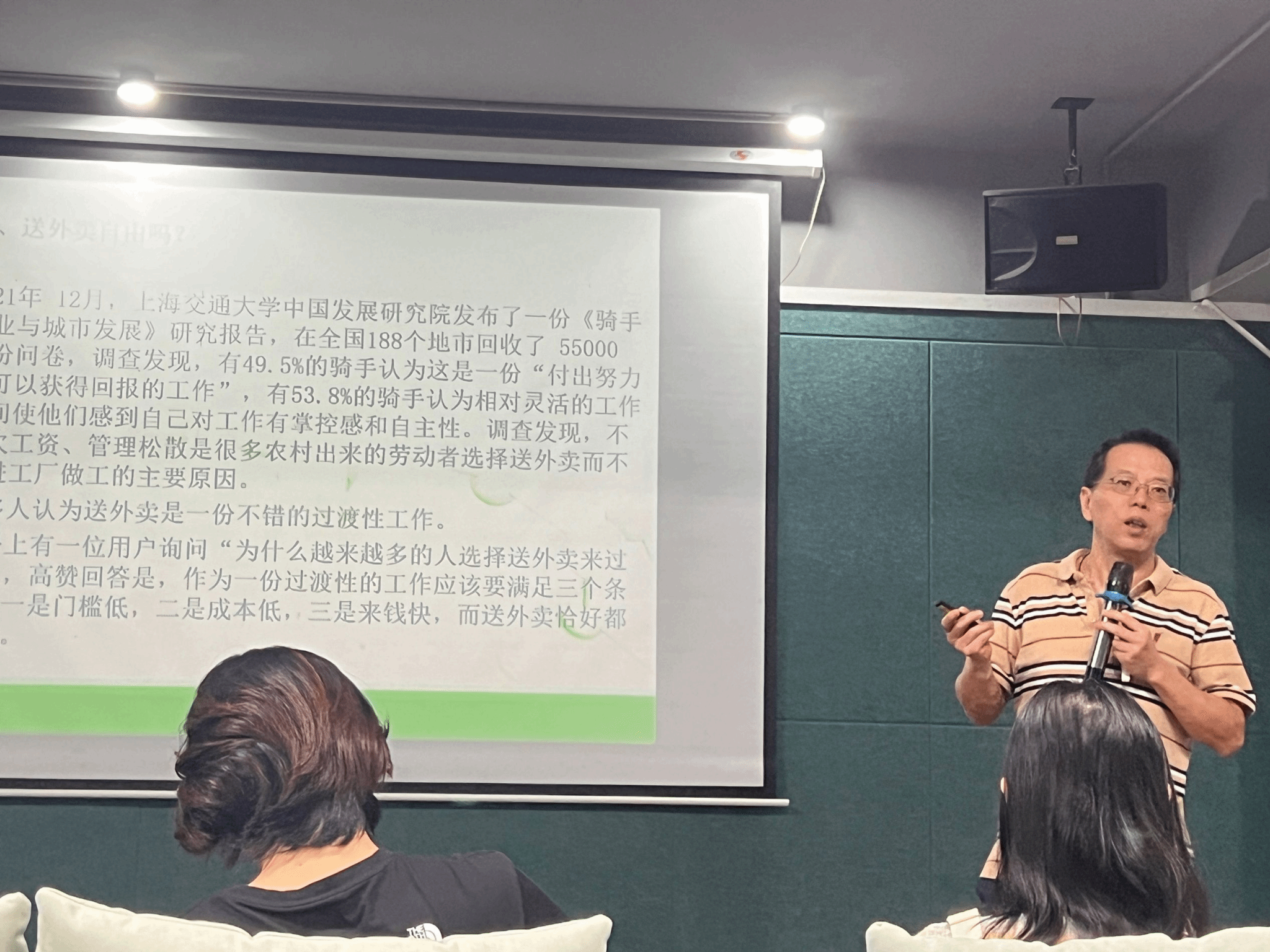 在数字经济蓬勃发展的当下,外卖骑手作为城市运转的“毛细血管”,其生存现状与权益保障日益成为社会关注的焦点,4月18日,林克勤院长以“外卖骑手:时代造就的特殊群体”为题,带领师生透过这一新兴职业群体的生存博弈,剖析数字时代的职业困境与社会责任,助力学生打破信息茧房,深化专业认知,明确学习方向。