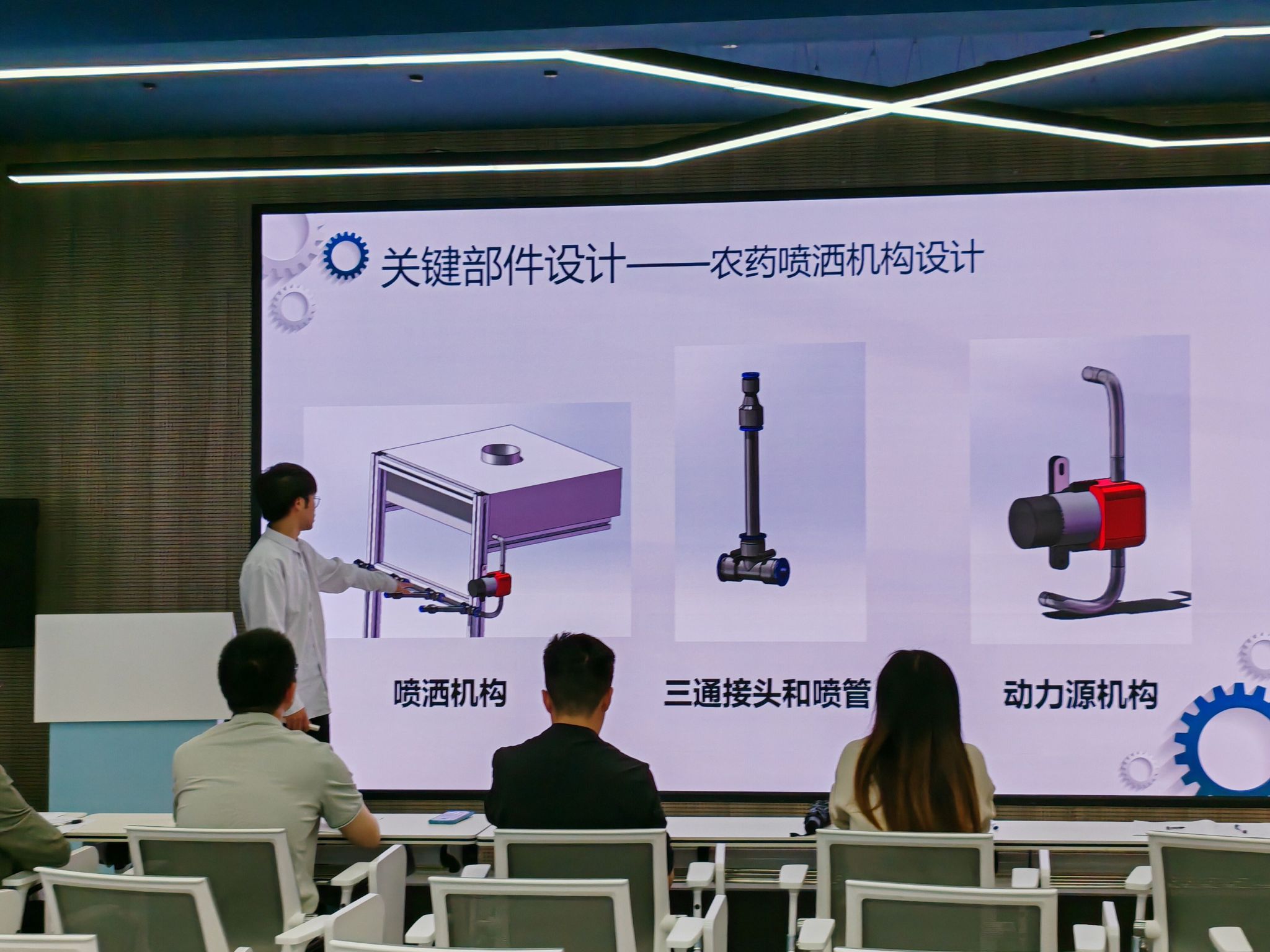 比赛当天,30支队伍依次登台,通过作品展示的精心呈现、答辩陈述的激情演绎,以及实物操作的现场验证,每一支队伍都向评审团展现了他们多元化的创新智慧,犹如一幅幅生动的科技画卷,缓缓展开。此次参赛作品涵盖农业机器、农产品清洗设备、工业设备、消防辅助无人机、自主设计等领域,充分体现了学生对机械技术与社会需求的深刻洞察。