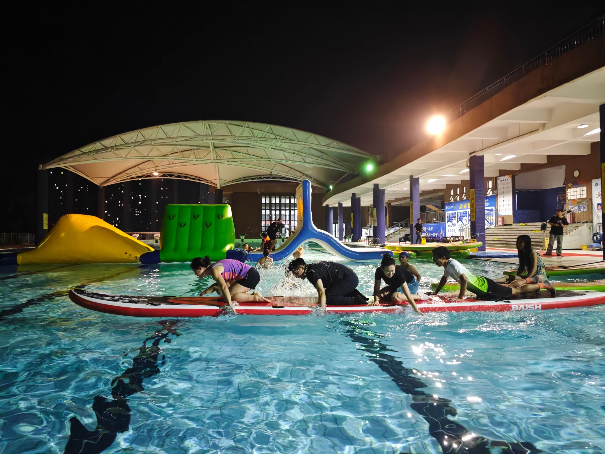 学生赛道以寝室为单位展开激烈角逐。陆地项目中,“同舟共济”考验步伐一致的合作精神,“穿越火线”则挑战身体的敏捷与胆量;水上关卡更是高潮迭起,“激流勇进”溅起阵阵水花,比拼的是平衡与速度,而“乘风破浪”环节则需要整个队伍齐心协作、共渡难关。参赛同学们不仅在闯关中展现出出色的体能和敏捷身手,更在一次次互助与鼓励中深化信任、凝聚共识。尤其在一些特别设计的障碍环节,如需要忍耐与配合的指压板通道、低身钻越的绳网阵等,每一处都成为团队毅力与默契的试炼场——嘶吼声、欢笑声、助威声此起彼伏,青春的张力燃爆全场。这场闯关,不仅是新老生破冰融合的良机,更是寝室这一校园“最小共同体”凝聚力的生动诠释。