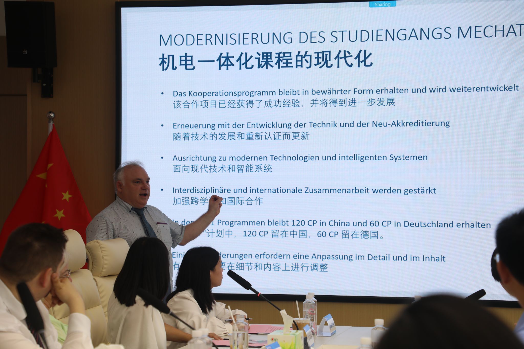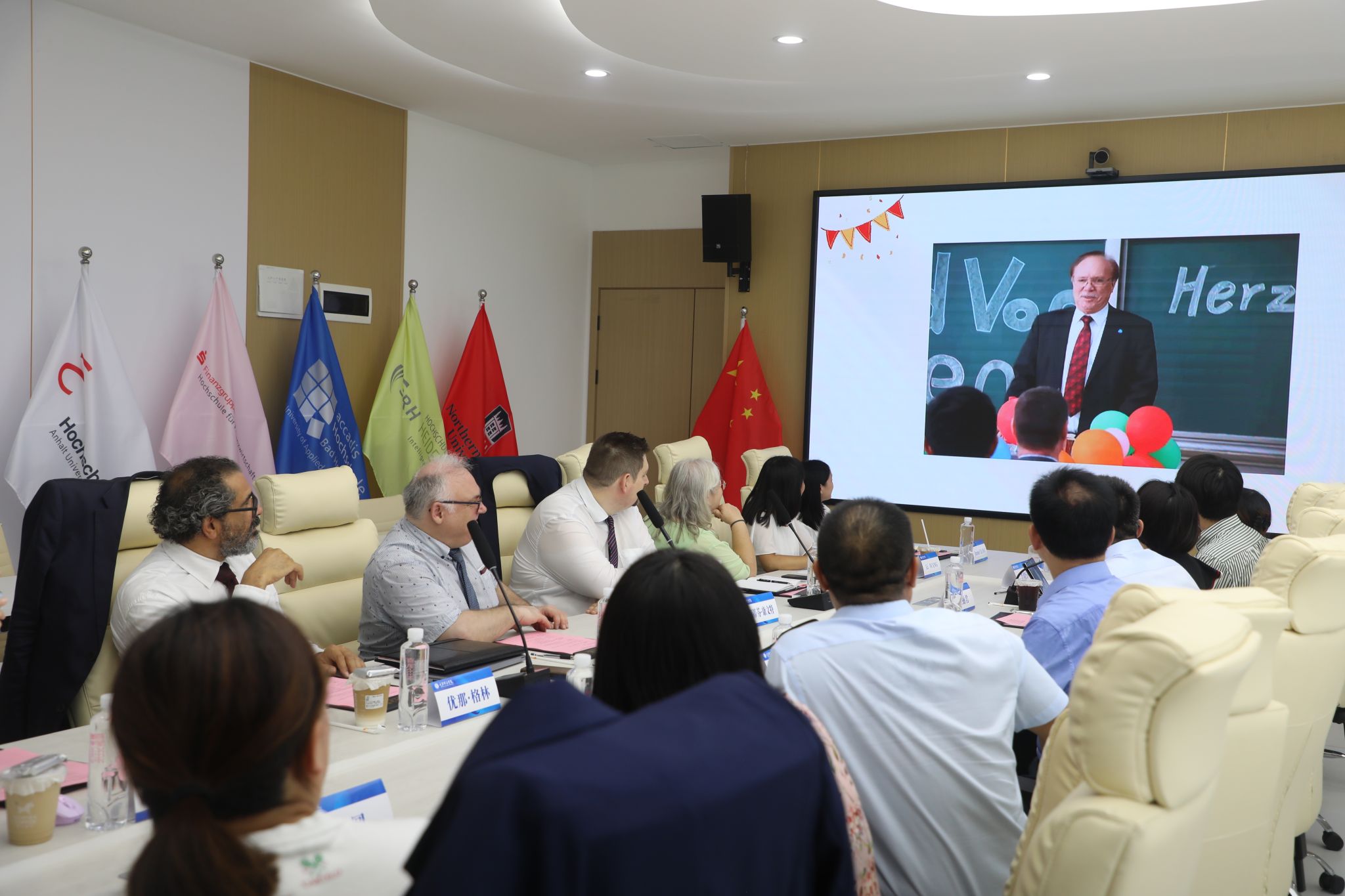 会议议程第一项,由双方学校代表分享关于本科教育计划和教学质量保障措施。我校德国工程学院副院长侯宇晶通过视频向对方代表展示我校与北黑森应用技术大学多年来合作历程,介绍学科建设及发展现况及以往中外办学成果,传达我校推进此次中外合作办学教育项目工作的诚心。