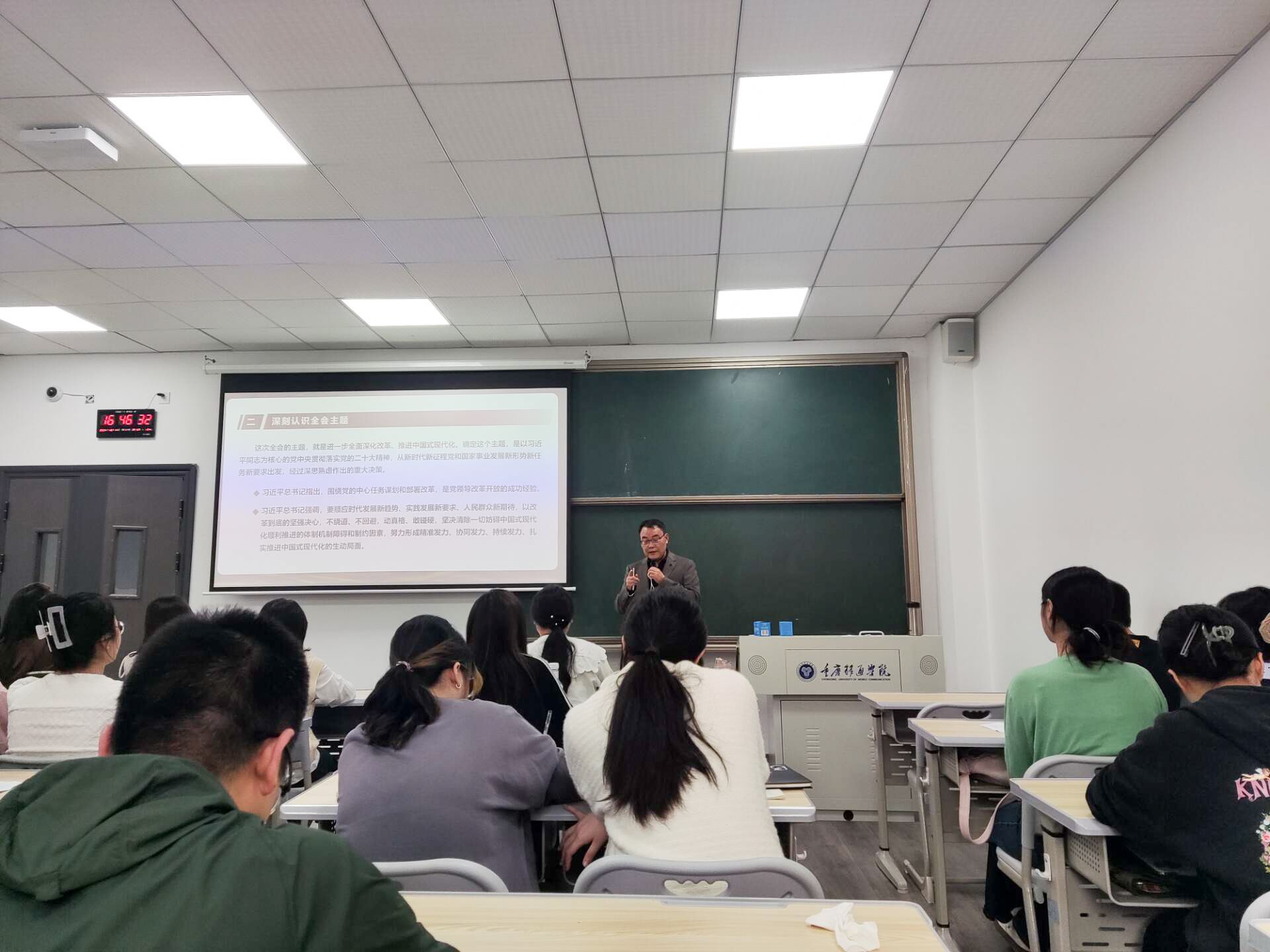 随后,何书记介绍了“贯通学习习近平总书记对重庆改革工作的系列重要指示要求,加快打造全面深化改革先行区”相关内容。他指出,习近平总书记对重庆的改革发展寄予厚望,提出了明确要求,现今重庆正在努力立足西部、服务大局,紧扣“两大定位”、重点打造“六个区”,加快打造全面深化改革先行区。何书记强调,重庆作为西部地区的重要城市,在全面深化改革中承担着重要使命。同学们作为大四学生,要深刻领会总书记的重要指示精神,将个人发展与家乡建设结合起来,积极响应党的号召,为重庆的改革发展贡献智慧和力量。最后,何书记向同学们给予了深情寄语。他希望各位同学作为新时代的大学生,要筑牢坚定理想信念之基,厚植家国情怀,勇担时代之责。要以学习此次全会精神为契机,在未来的学习和工作中,始终保持积极向上的心态和奋发有为的精神状态,用脚踏实地的行动赓续奋斗初心。