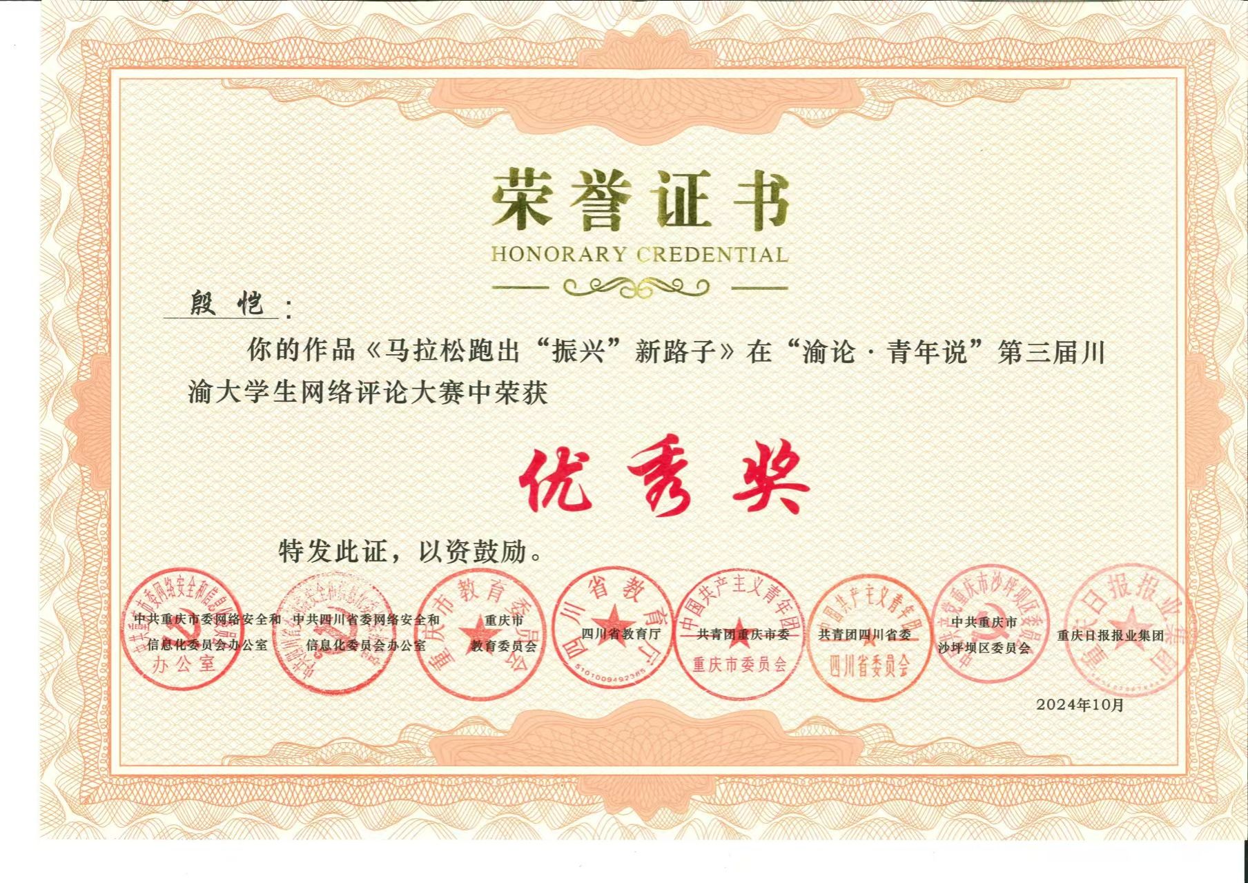 当得知我的作品获奖时,我深感荣幸和自豪。回望过去,自加入新闻采写产业学院以来,在学院指导老师的专业引领下,我已荣获4项省市级以上新闻类奖项,从2023重庆大学生新闻作品展的优秀作品奖,到“与志愿·共青春”2023年川渝大学生志愿文学邀请赛的优秀奖;从第三届全国大学生体育新闻写作大赛的二等奖,直至此番荣获的“渝论·青年说”第三届川渝大学生网络评论大赛二等奖,每一步成就都深深烙印着学院系统新闻教育的痕迹,更是我在实践中不断磨砺专业技能的见证。