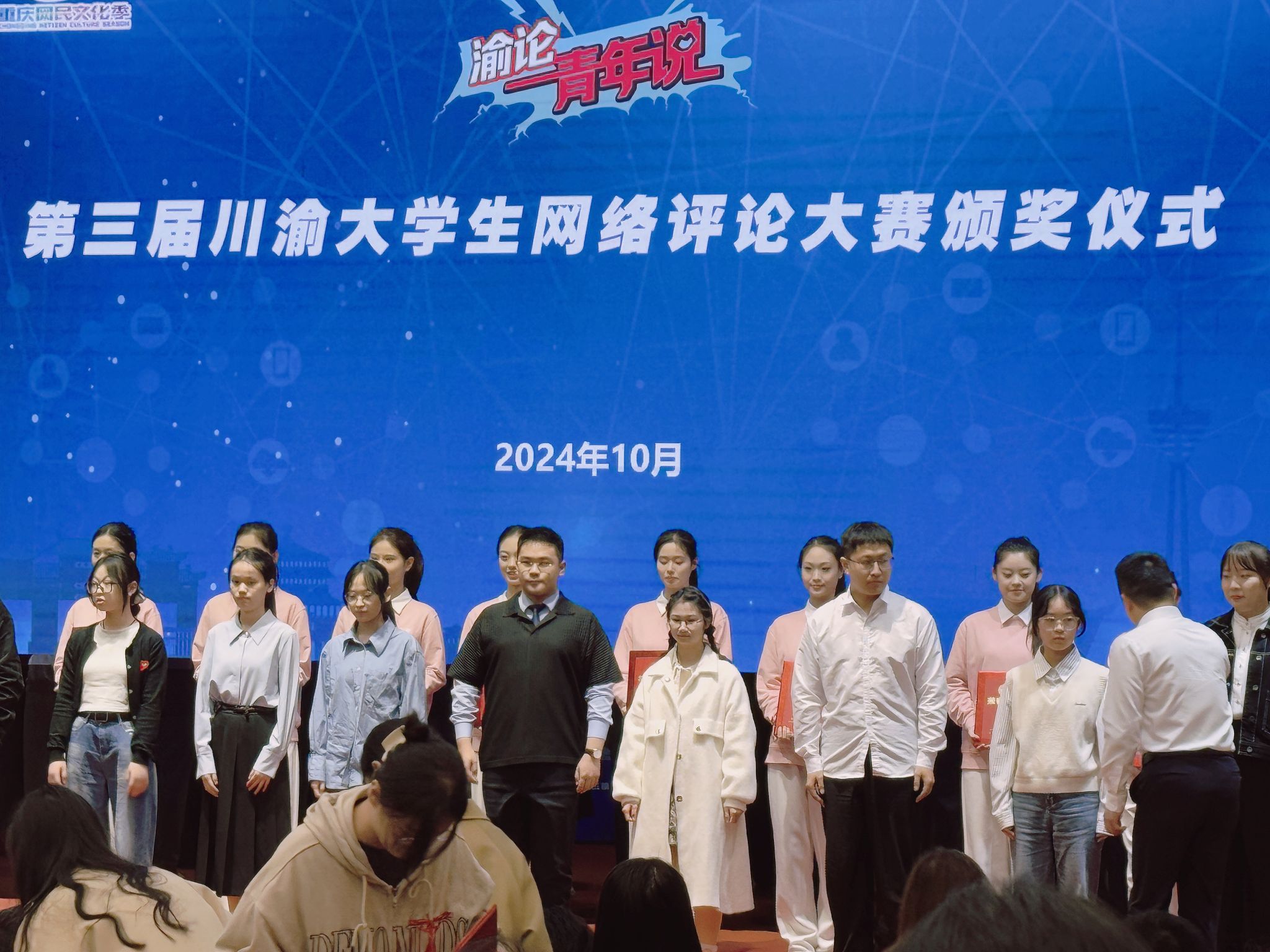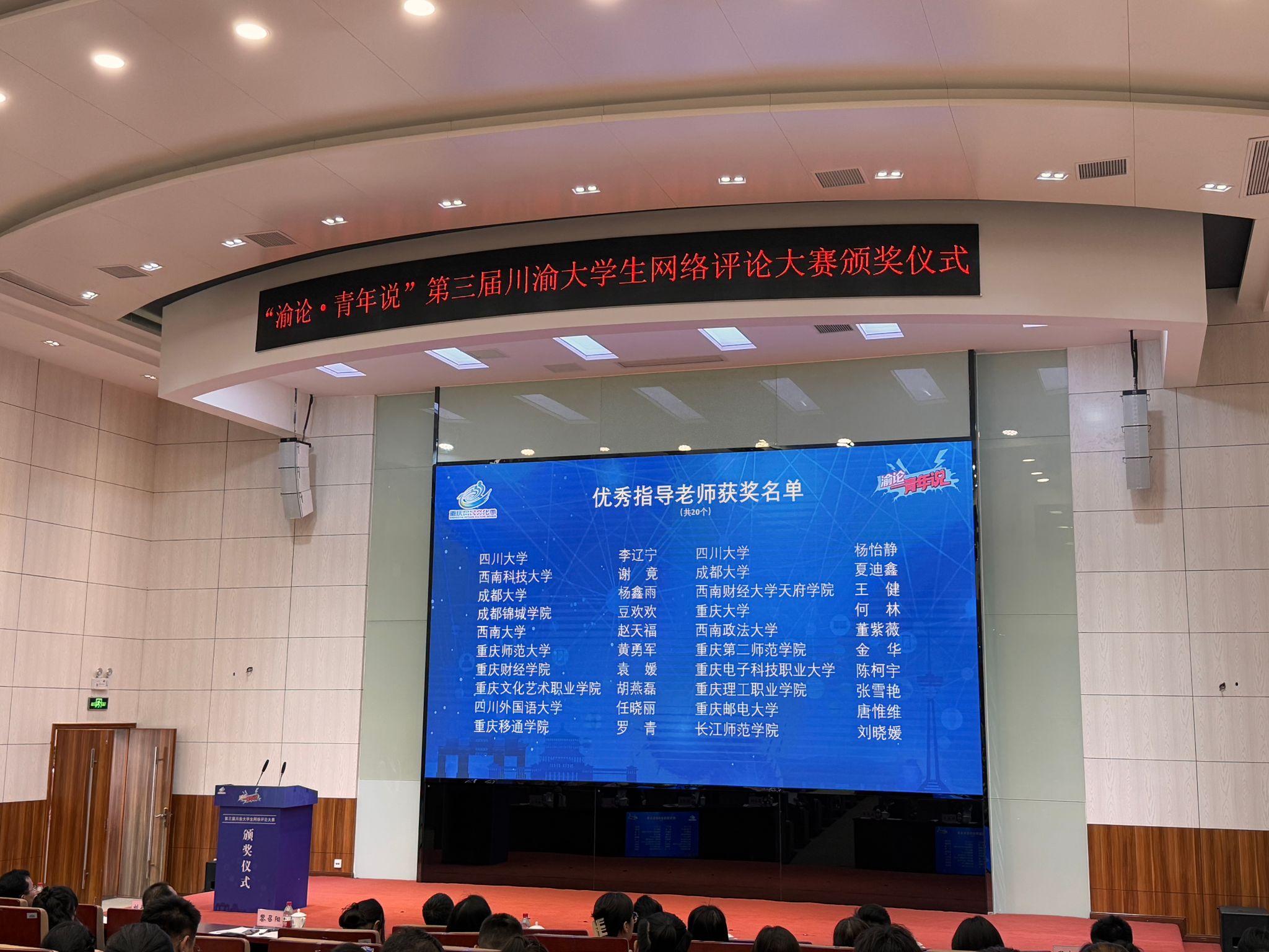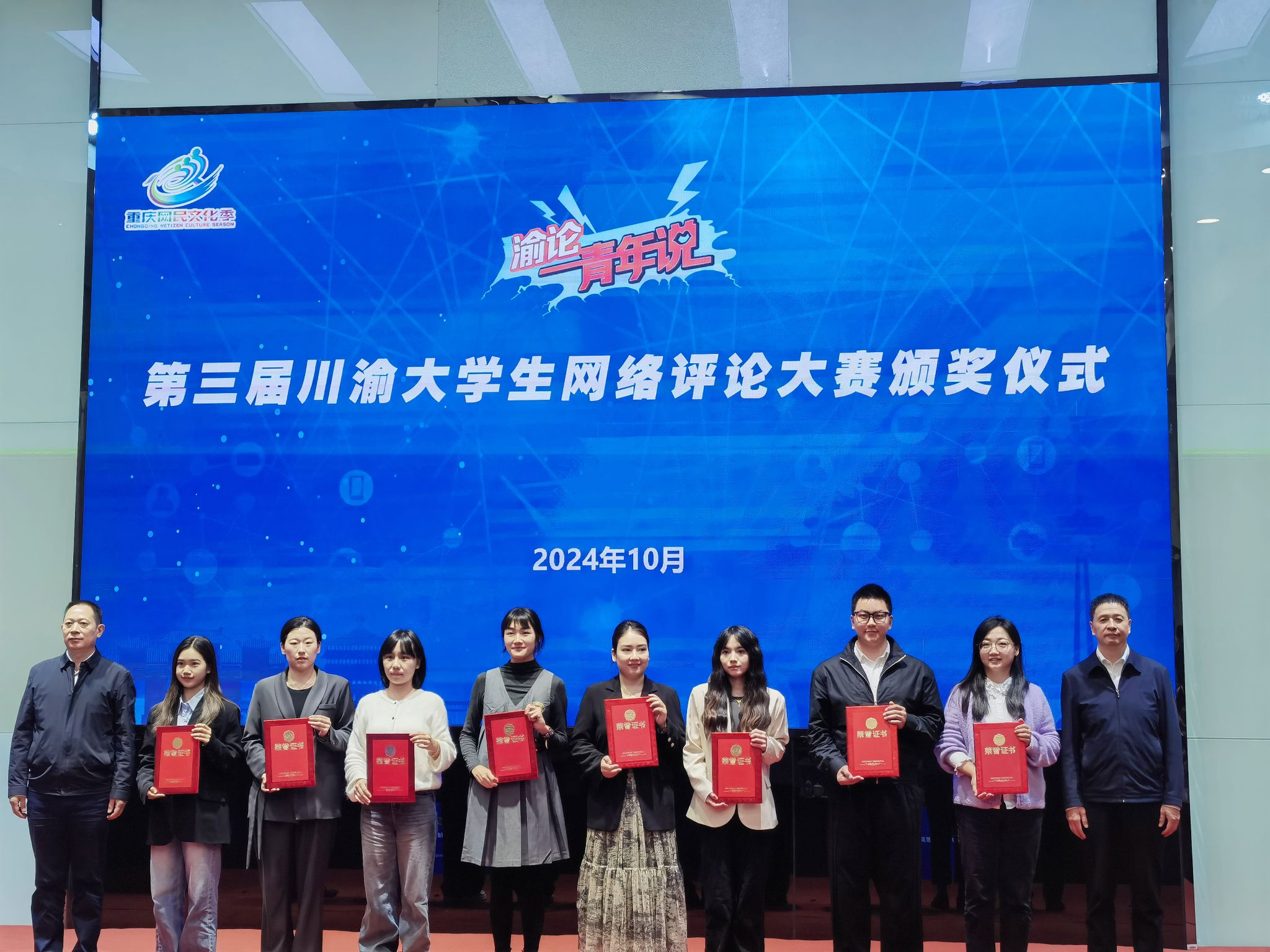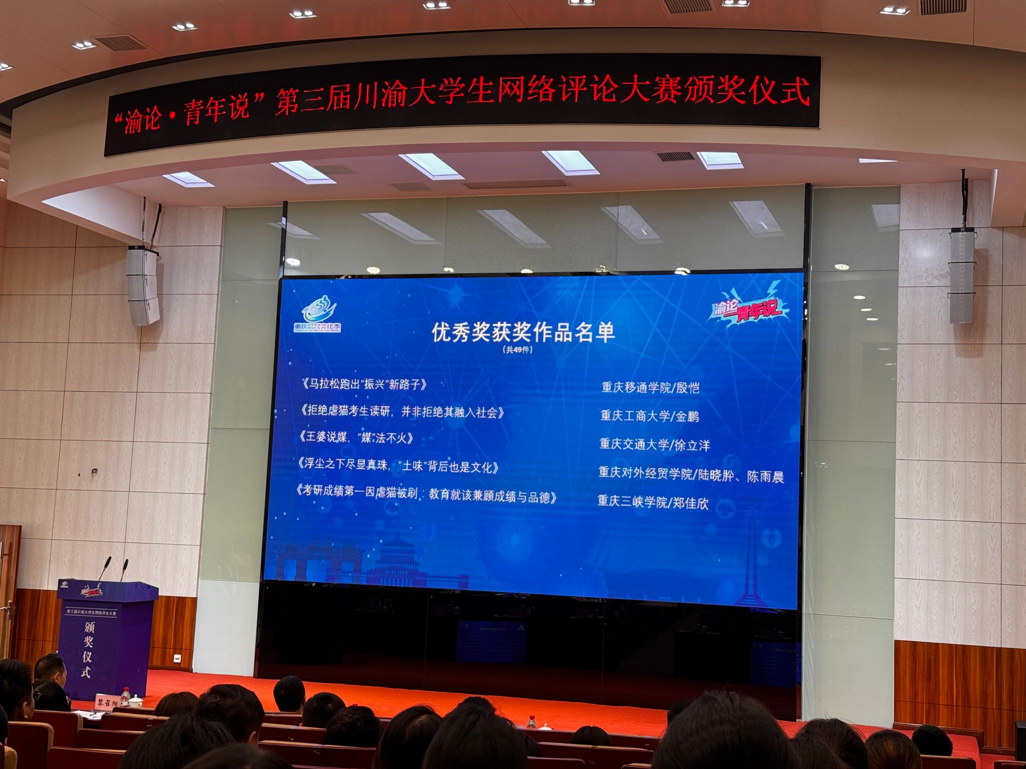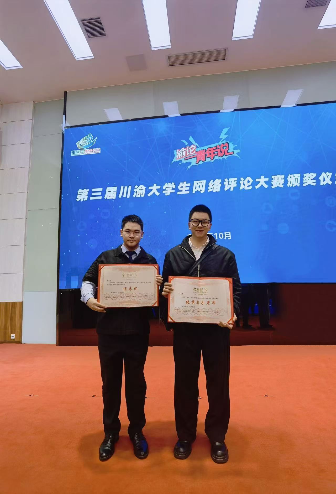 10月17日下午,“渝论·青年说”第三届川渝大学生网络评论大赛颁奖仪式在四川外国语大学弘文楼国际报告厅举行。在此次大赛中,重庆移通学院新闻采写产业学院学生殷恺凭借新闻评论作品《马拉松跑出“振兴”新路子》荣获优秀奖,同时,其指导教师罗青荣获优秀指导老师奖。